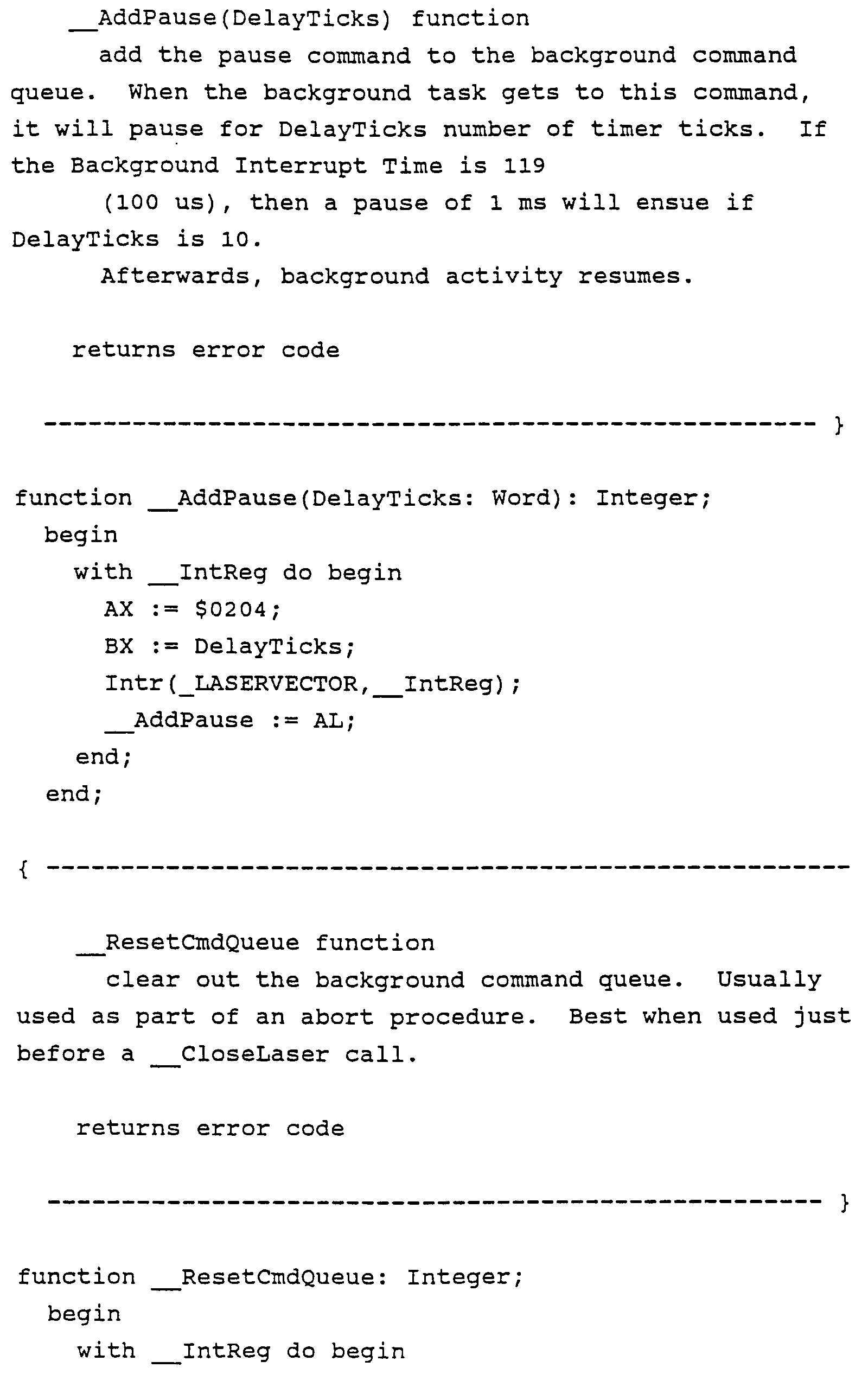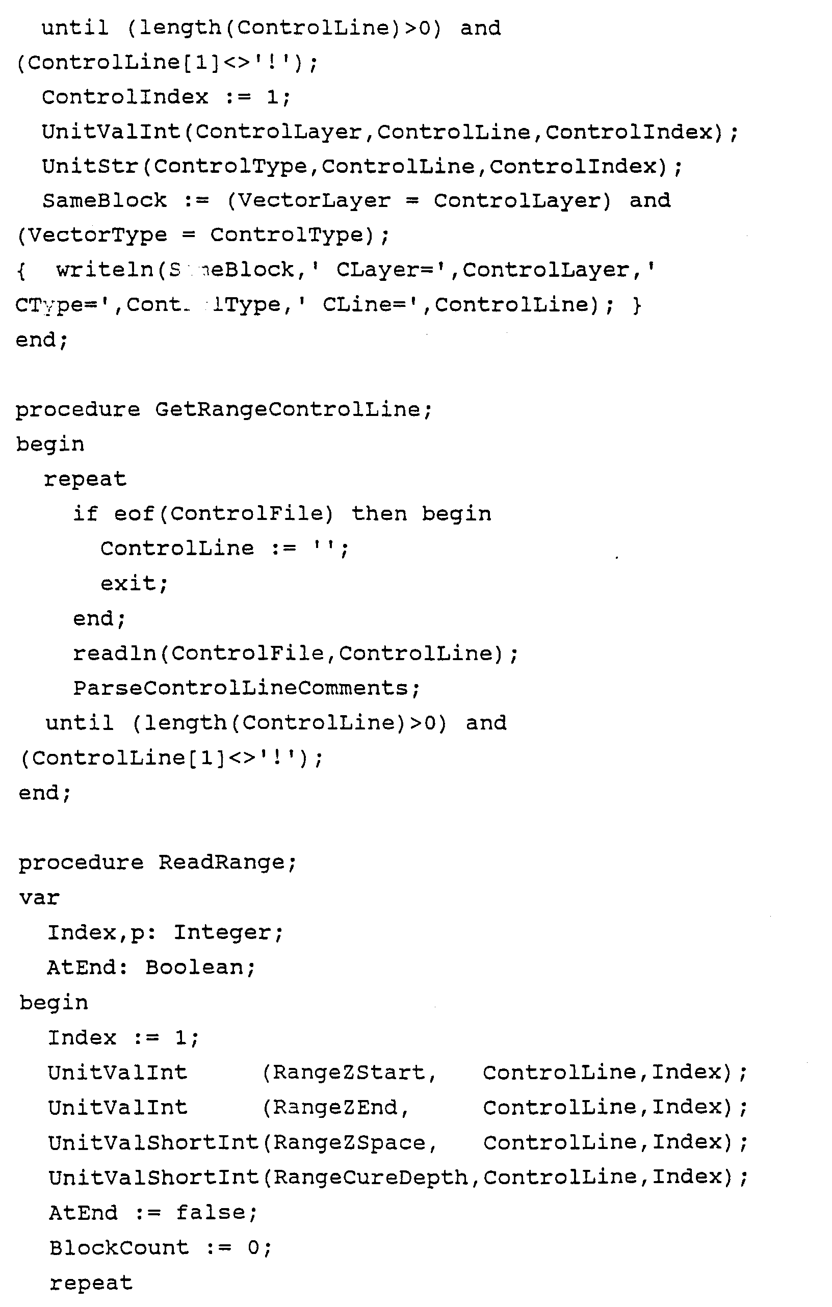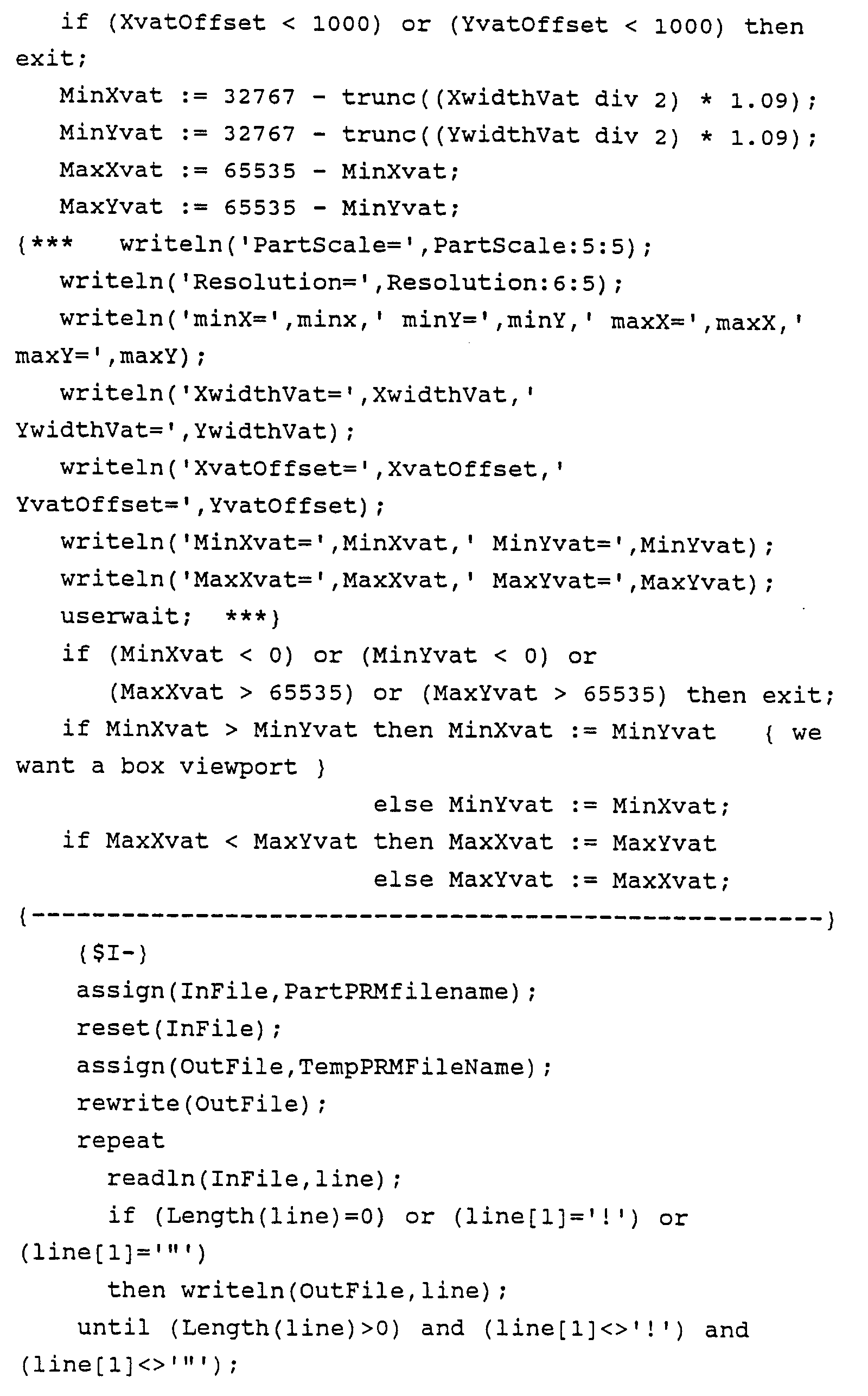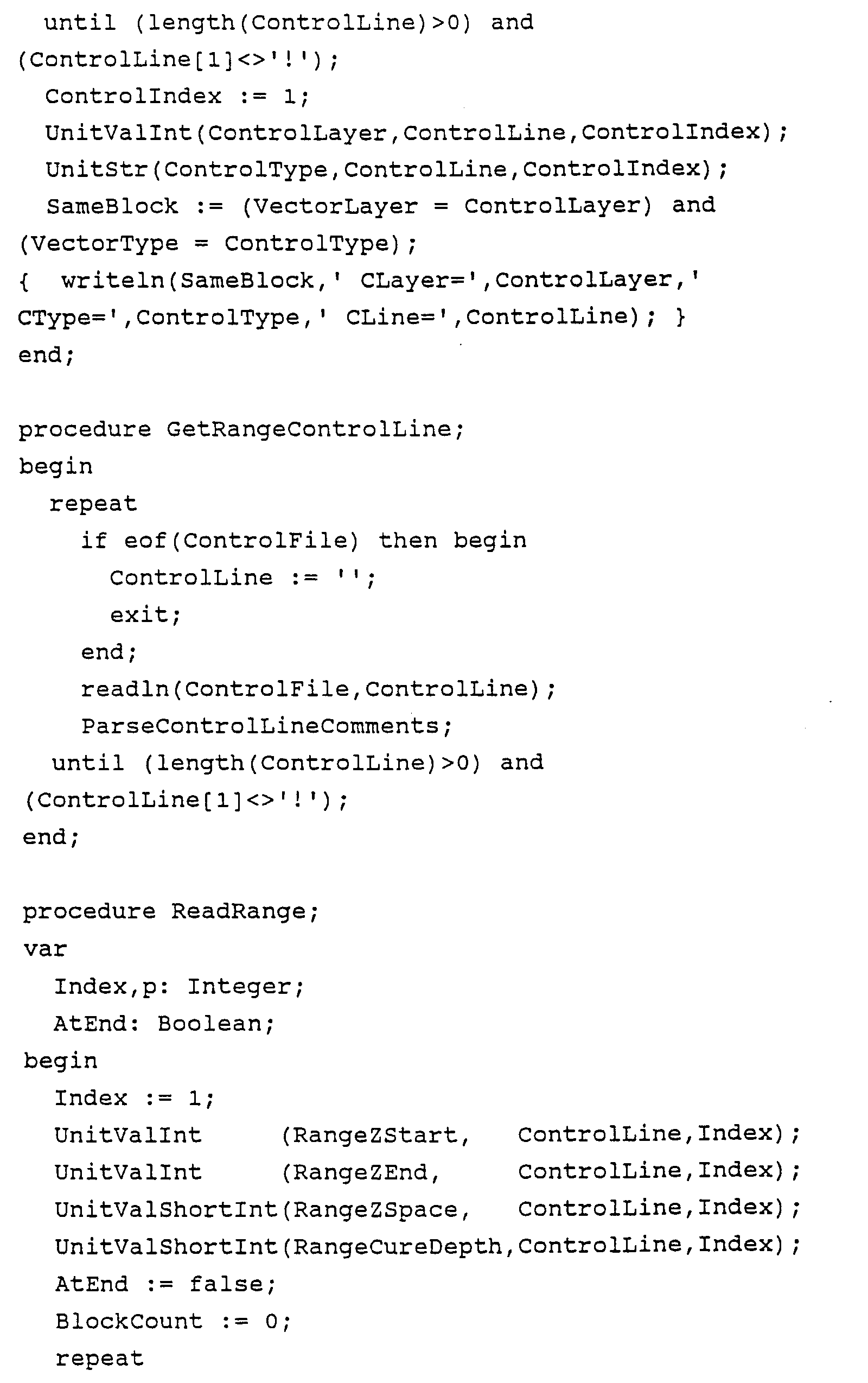 The Pascal function below is a sample for computing the values of the drift correction variables. The 'Ref' variables are the reference positions of the two beam profile sensors read from the disk data file. The 'Now' variables are the most recently determined positions of the two profile sensors. Because of dynamic changes in the physical characteristics of the laser scanning system, the positions held in the 'Now' variables will differ slightly from the ideal reference positions. The goal is to use these position differences to adjust upcoming mirror positions.