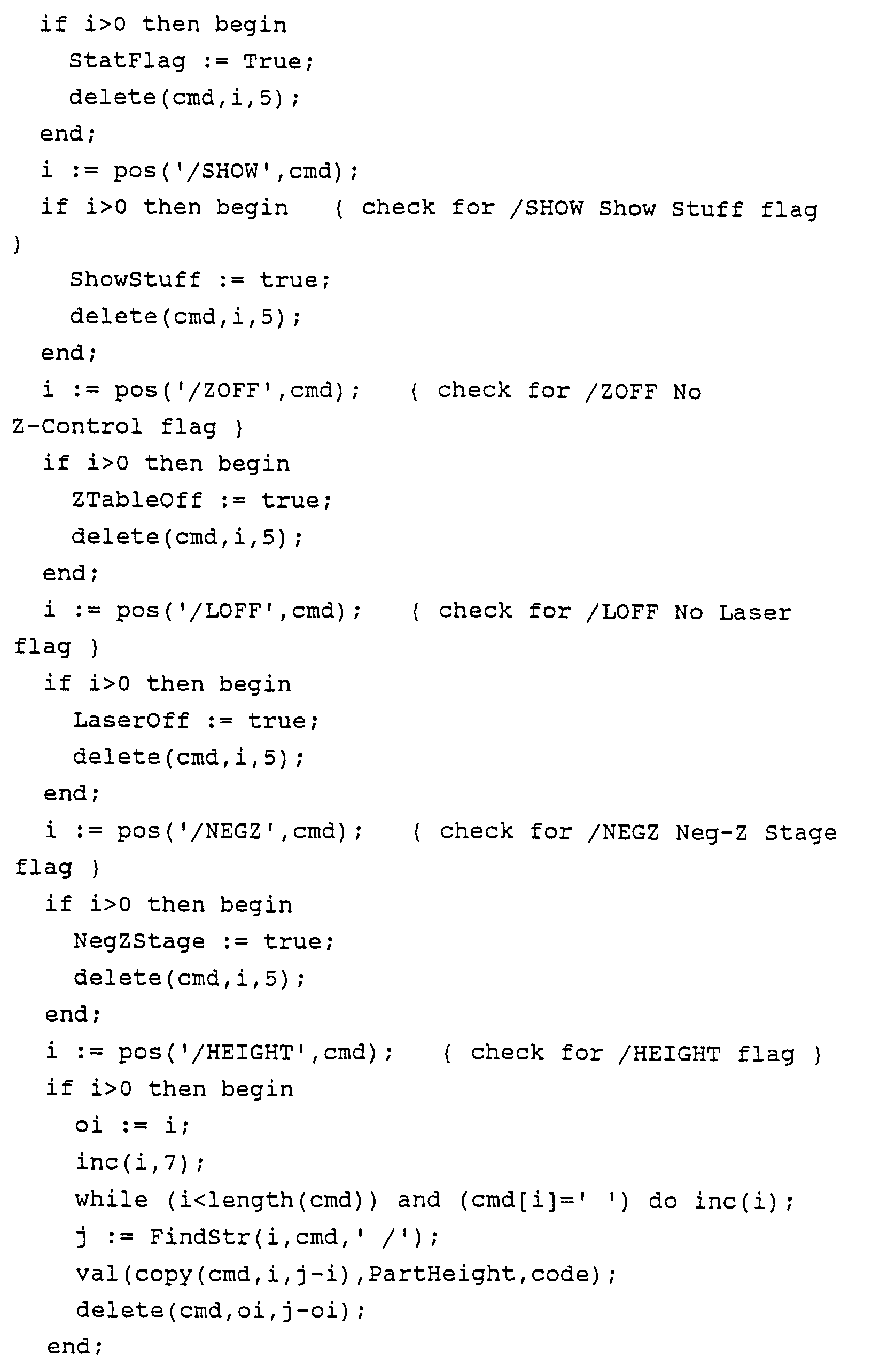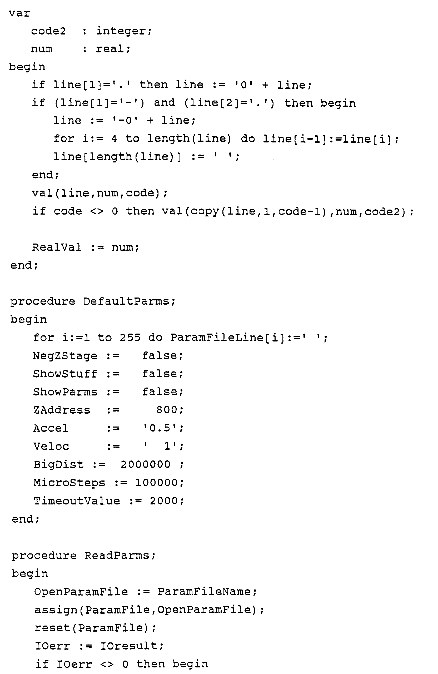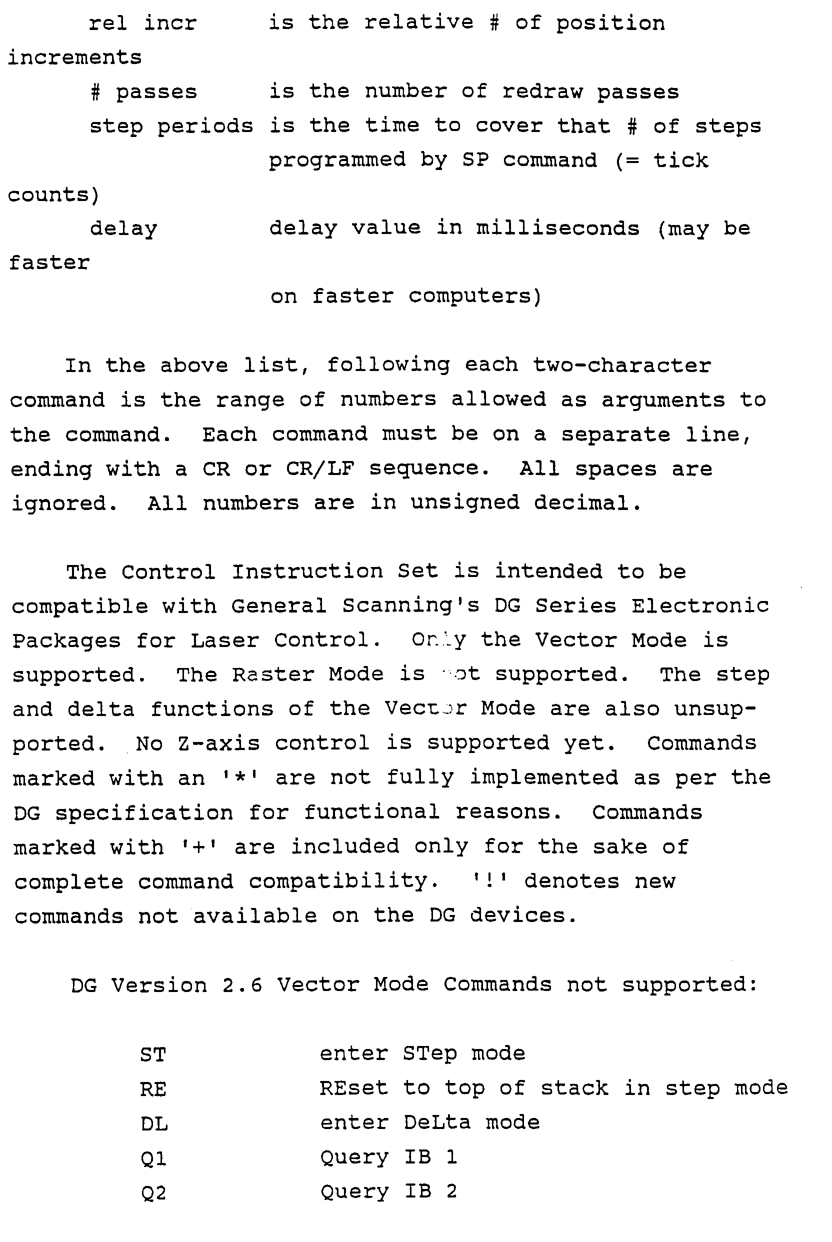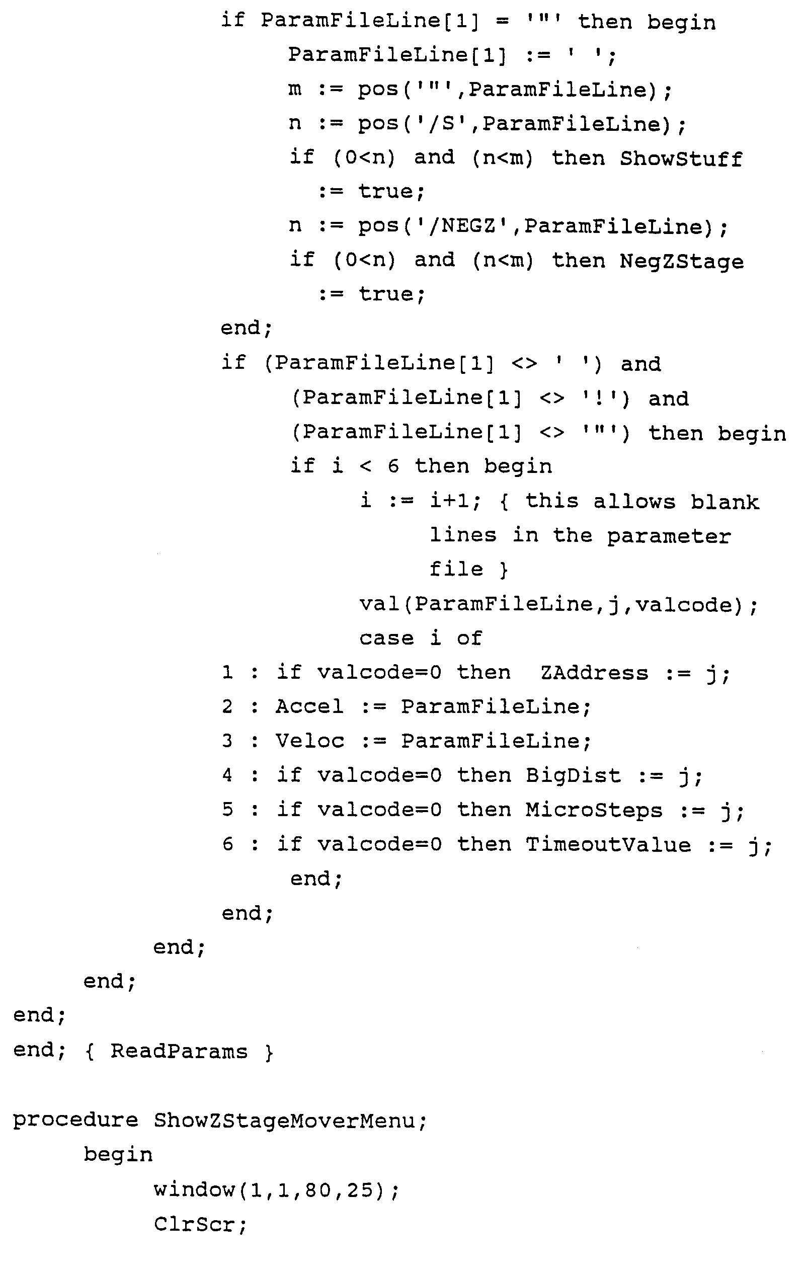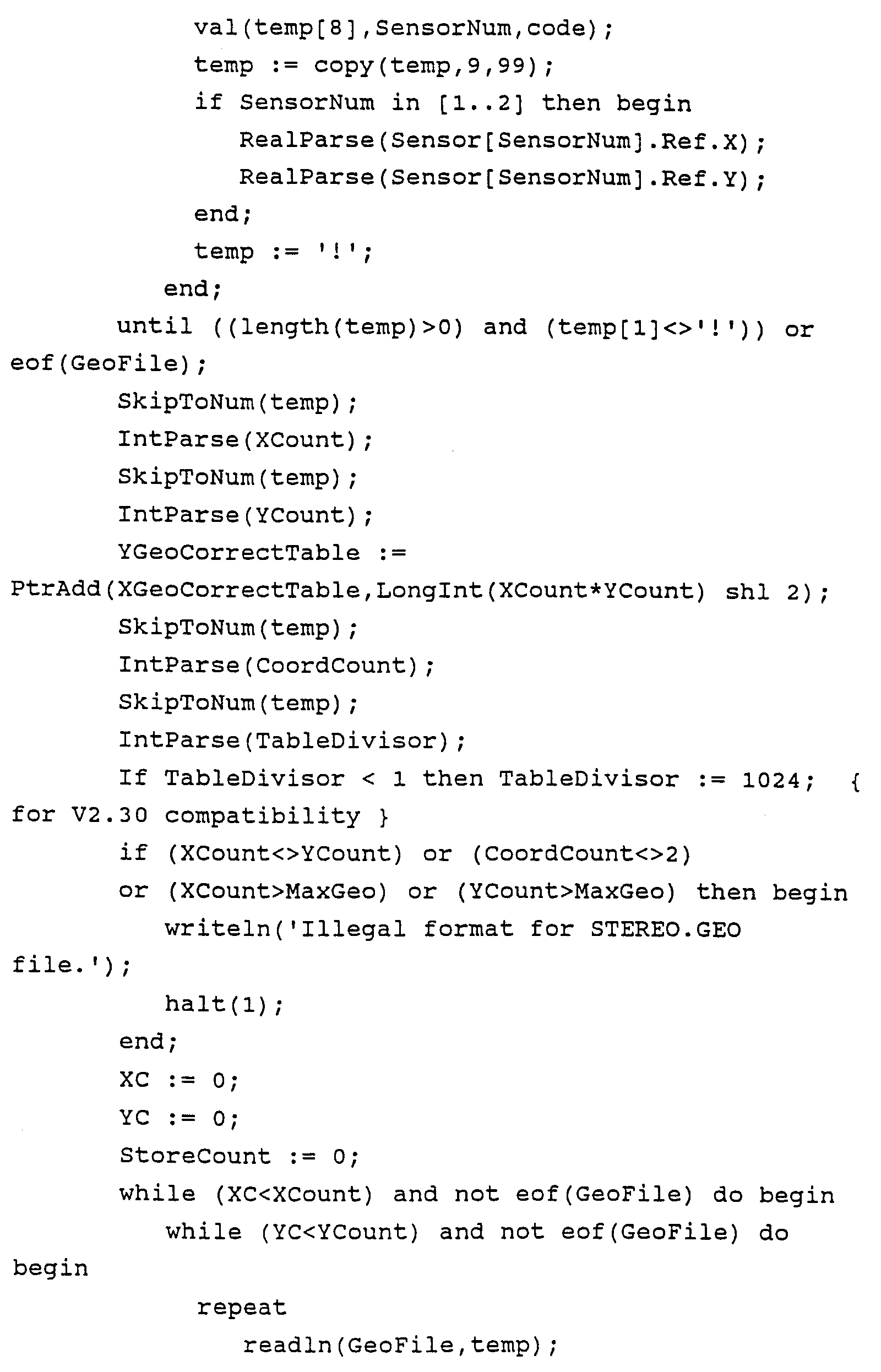 The Pascal function below is a sample for computing the values of the drift correction variables. The 'Ref' variables are the reference positions of the two beam profile sensors read from the disk data file. The 'Now' variables are the most recently determined positions of the two profile sensors. Because of dynamic changes in the physical characteristics of the laser scanning system, the positions held in the 'Now' variables will differ slightly from the ideal reference positions. The goal is to use these position differences to adjust upcoming mirror positions.