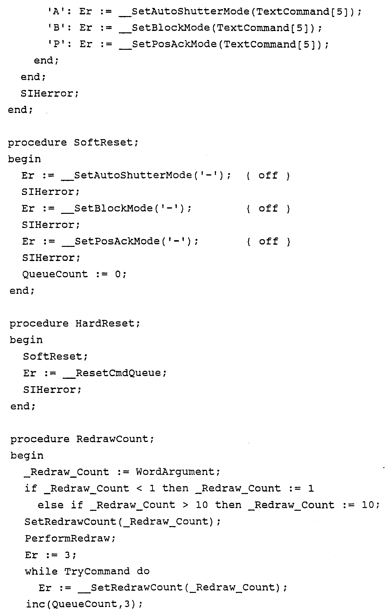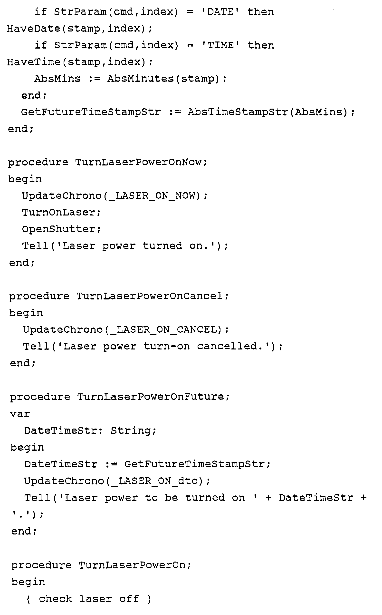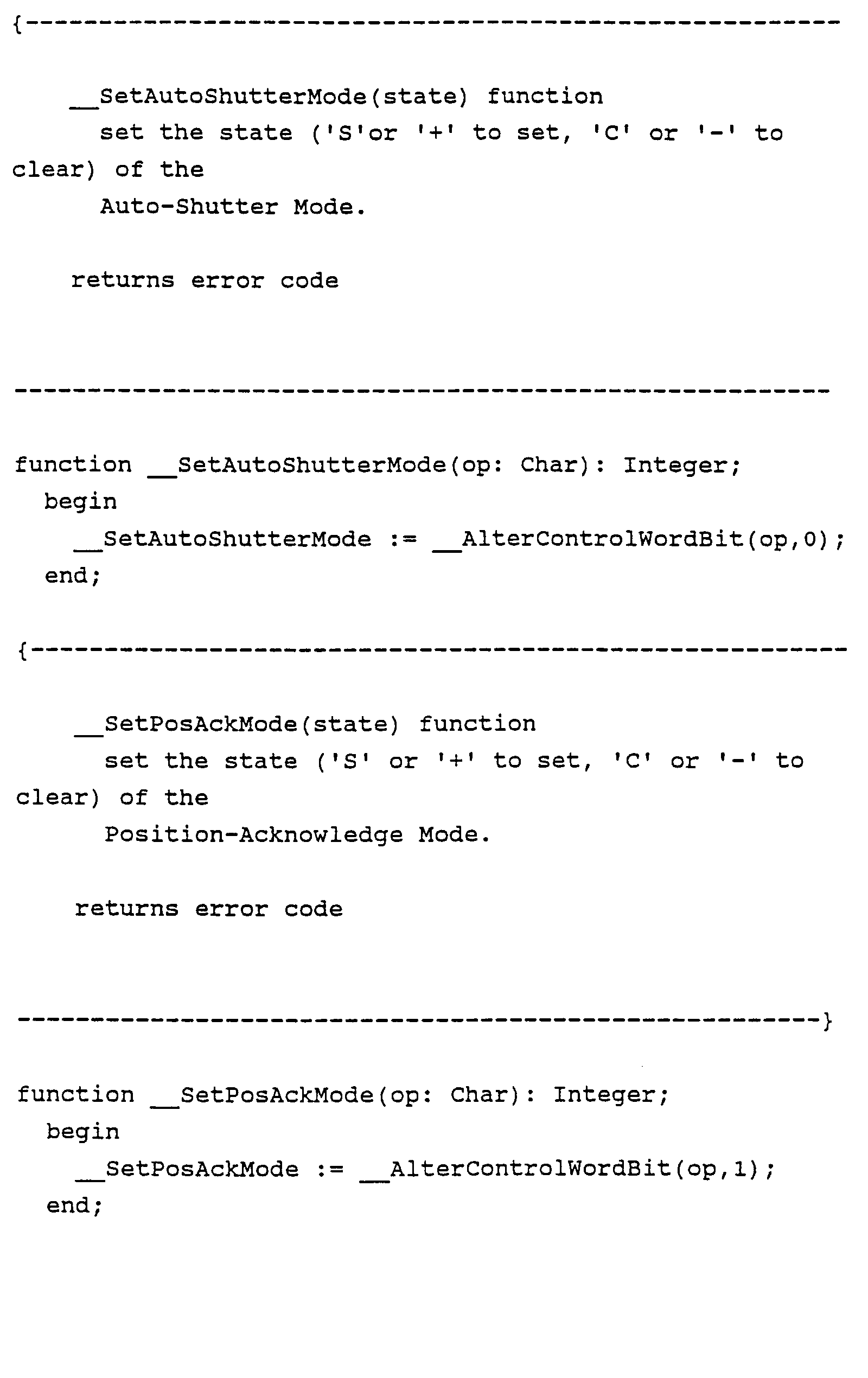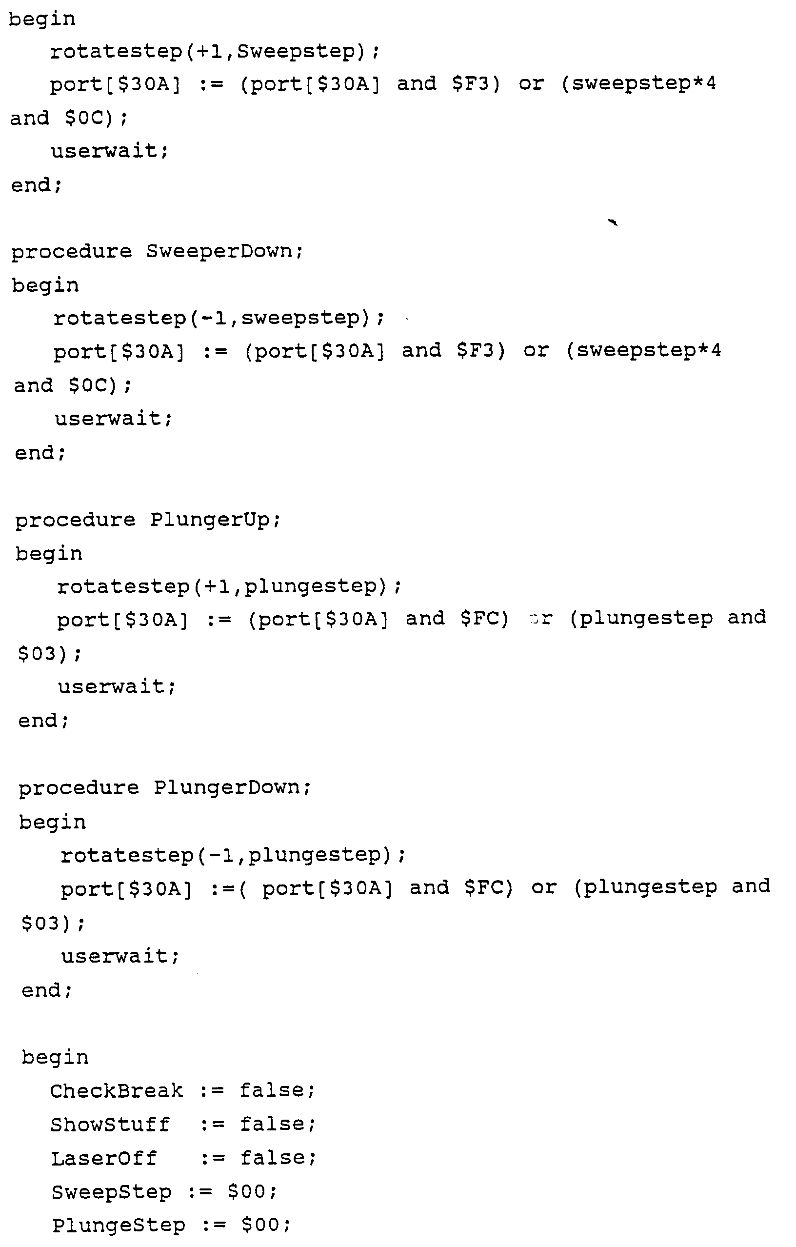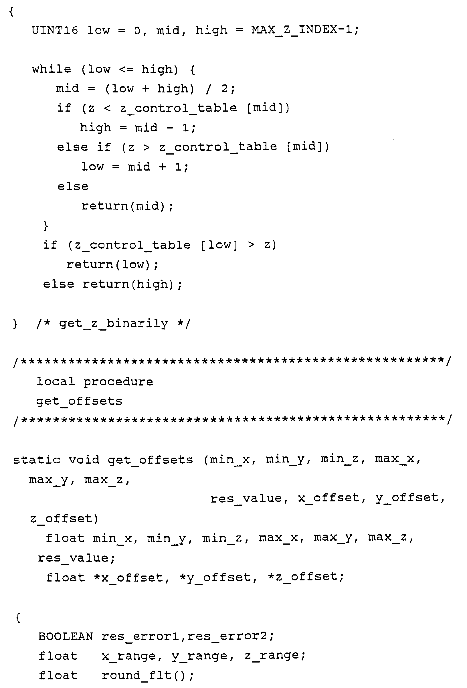 The Pascal function below is a sample for computing the values of the drift correction variables. The 'Ref' variables are the reference positions of the two beam profile sensors read from the disk data file. The 'Now' variables are the most recently determined positions of the two profile sensors. Because of dynamic changes in the physical characteristics of the laser scanning system, the positions held in the 'Now' variables will differ slightly from the ideal reference positions. The goal is to use these position differences to adjust upcoming mirror positions.