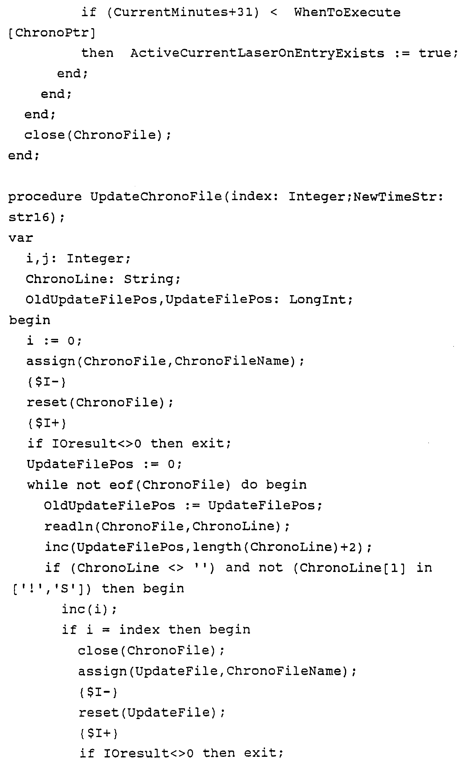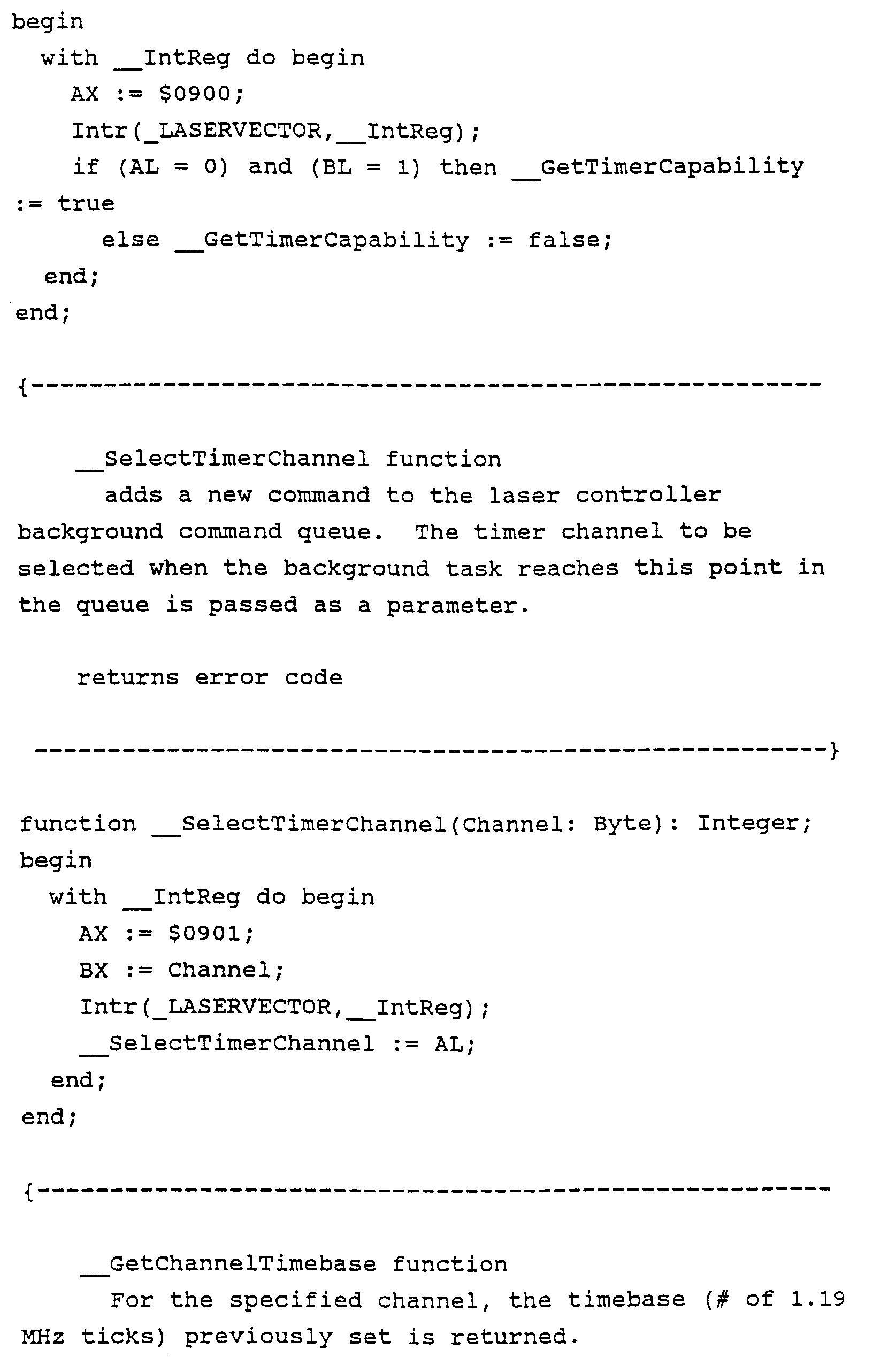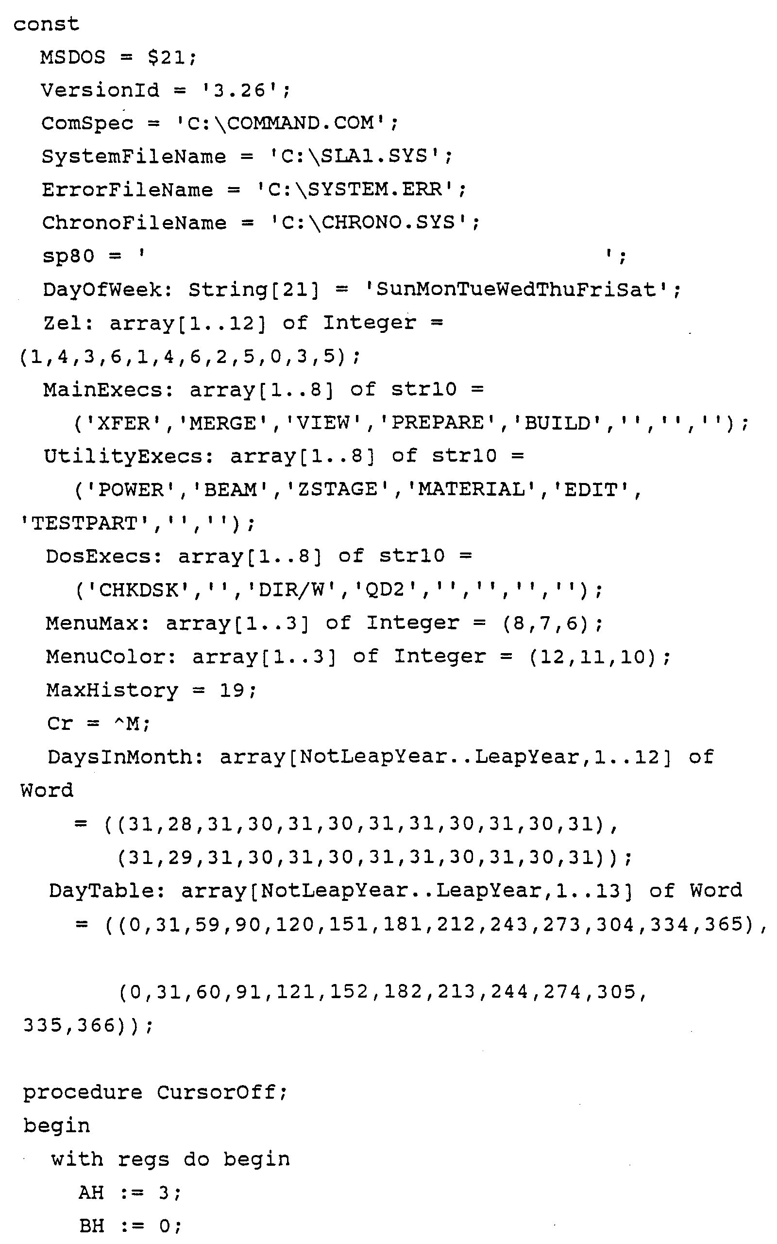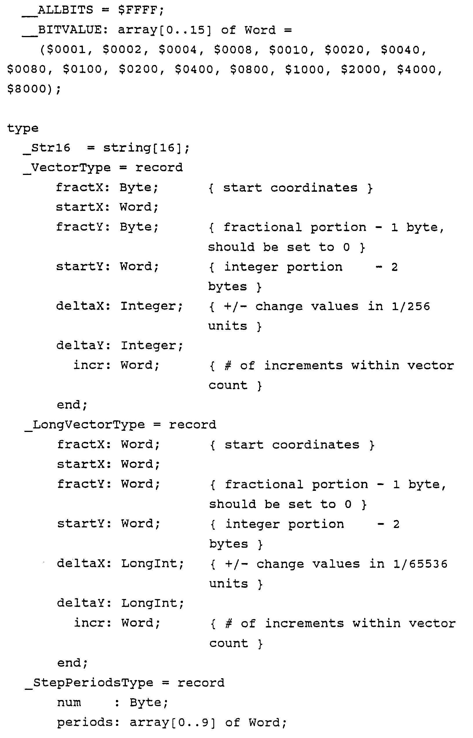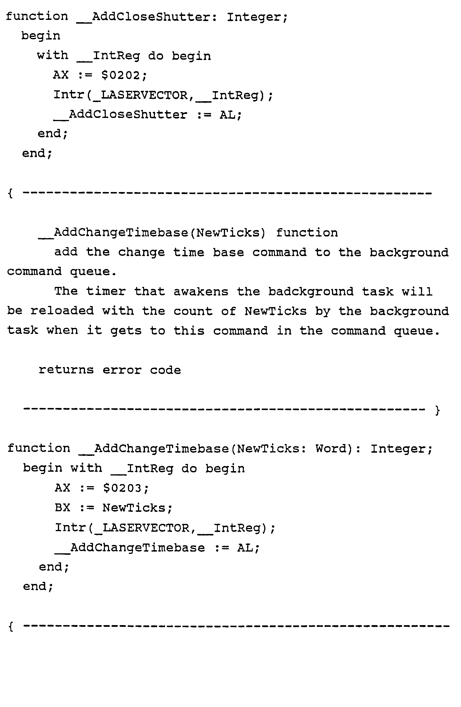The Pascal function below is a sample for computing the values of the drift correction variables. The 'Ref' variables are the reference positions of the two beam profile sensors read from the disk data file. The 'Now' variables are the most recently determined positions of the two profile sensors. Because of dynamic changes in the physical characteristics of the laser scanning system, the positions held in the 'Now' variables will differ slightly from the ideal reference positions. The goal is to use these position differences to adjust upcoming mirror positions.