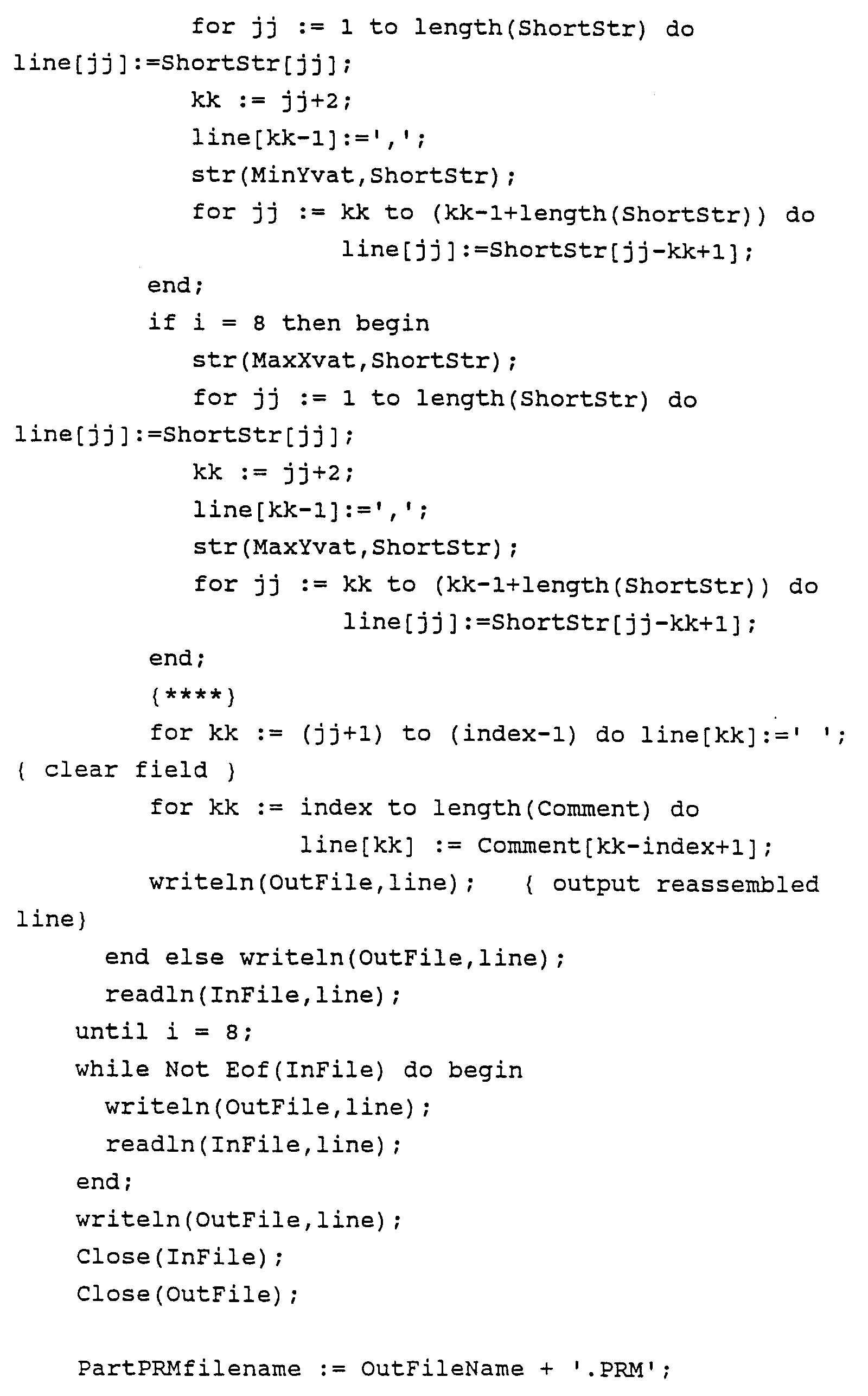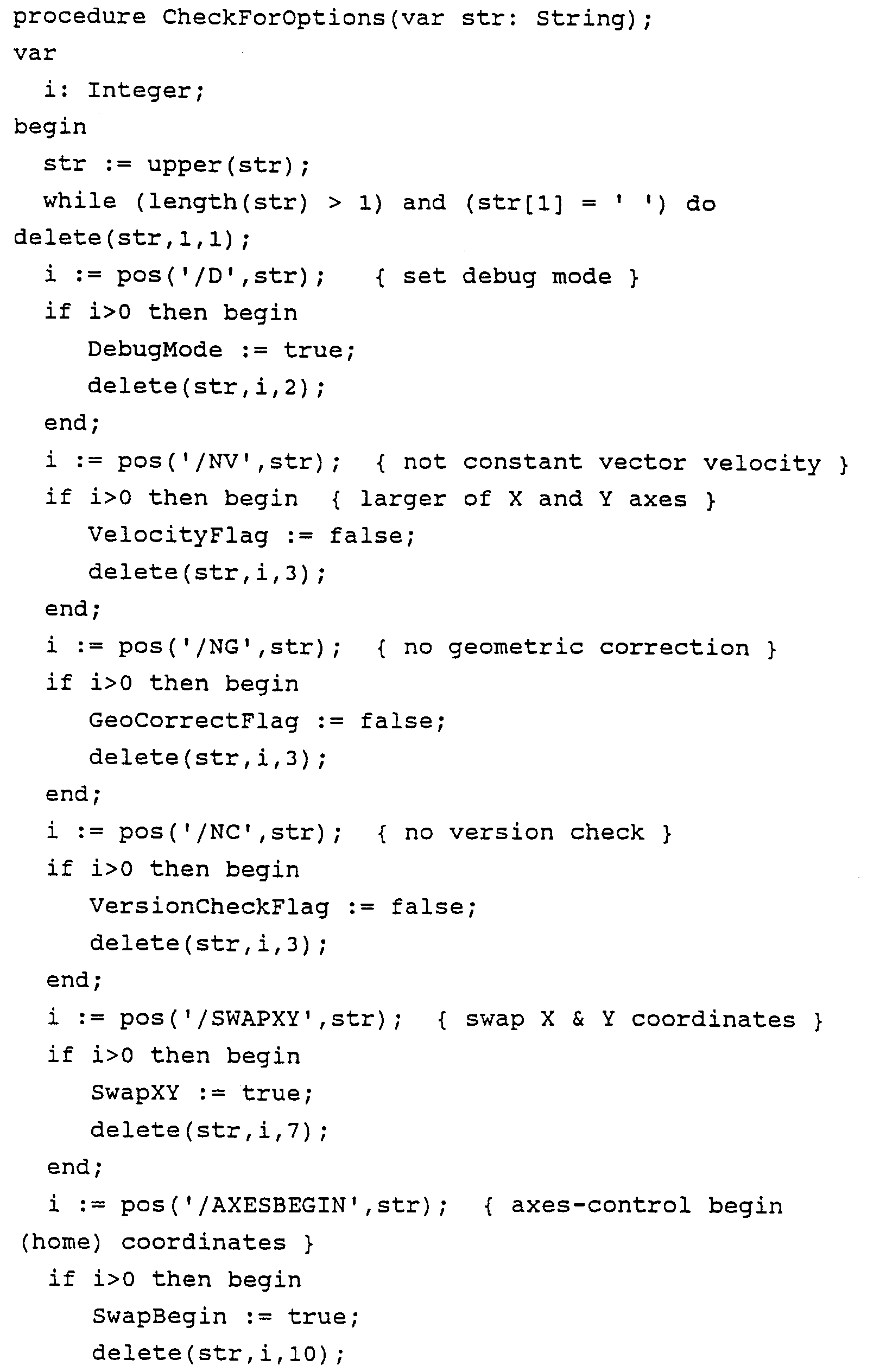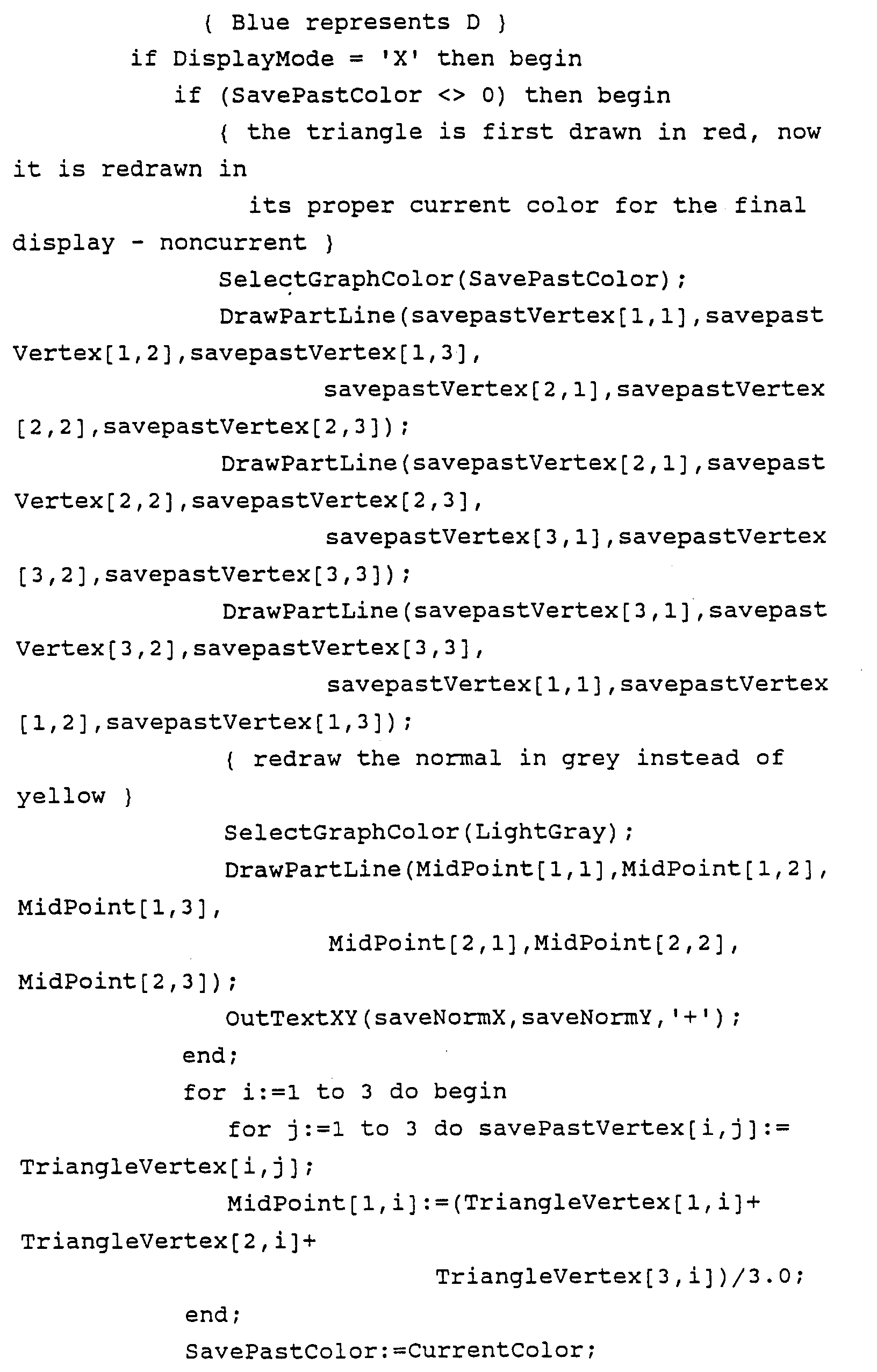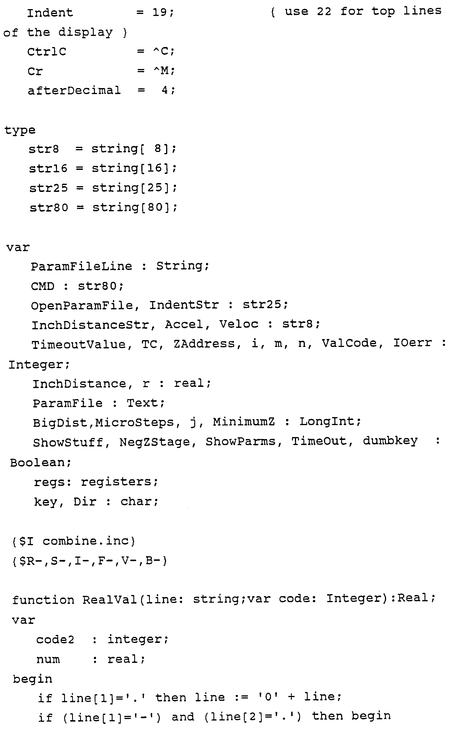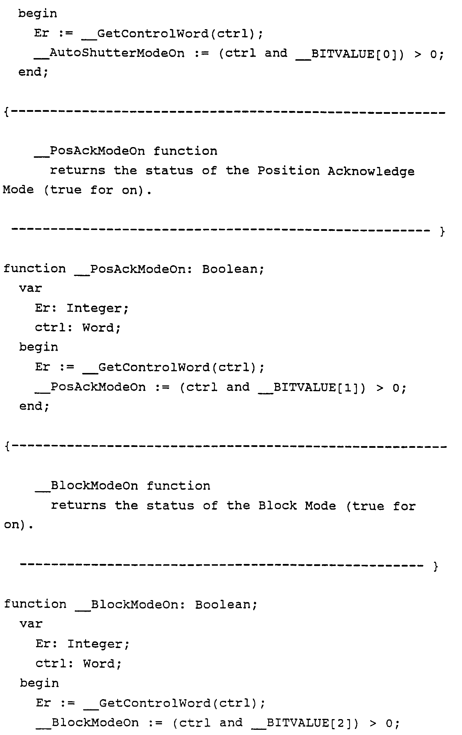 The Pascal function below is a sample for computing the values of the drift correction variables. The 'Ref' variables are the reference positions of the two beam profile sensors read from the disk data file. The 'Now' variables are the most recently determined positions of the two profile sensors. Because of dynamic changes in the physical characteristics of the laser scanning system, the positions held in the 'Now' variables will differ slightly from the ideal reference positions. The goal is to use these position differences to adjust upcoming mirror positions.