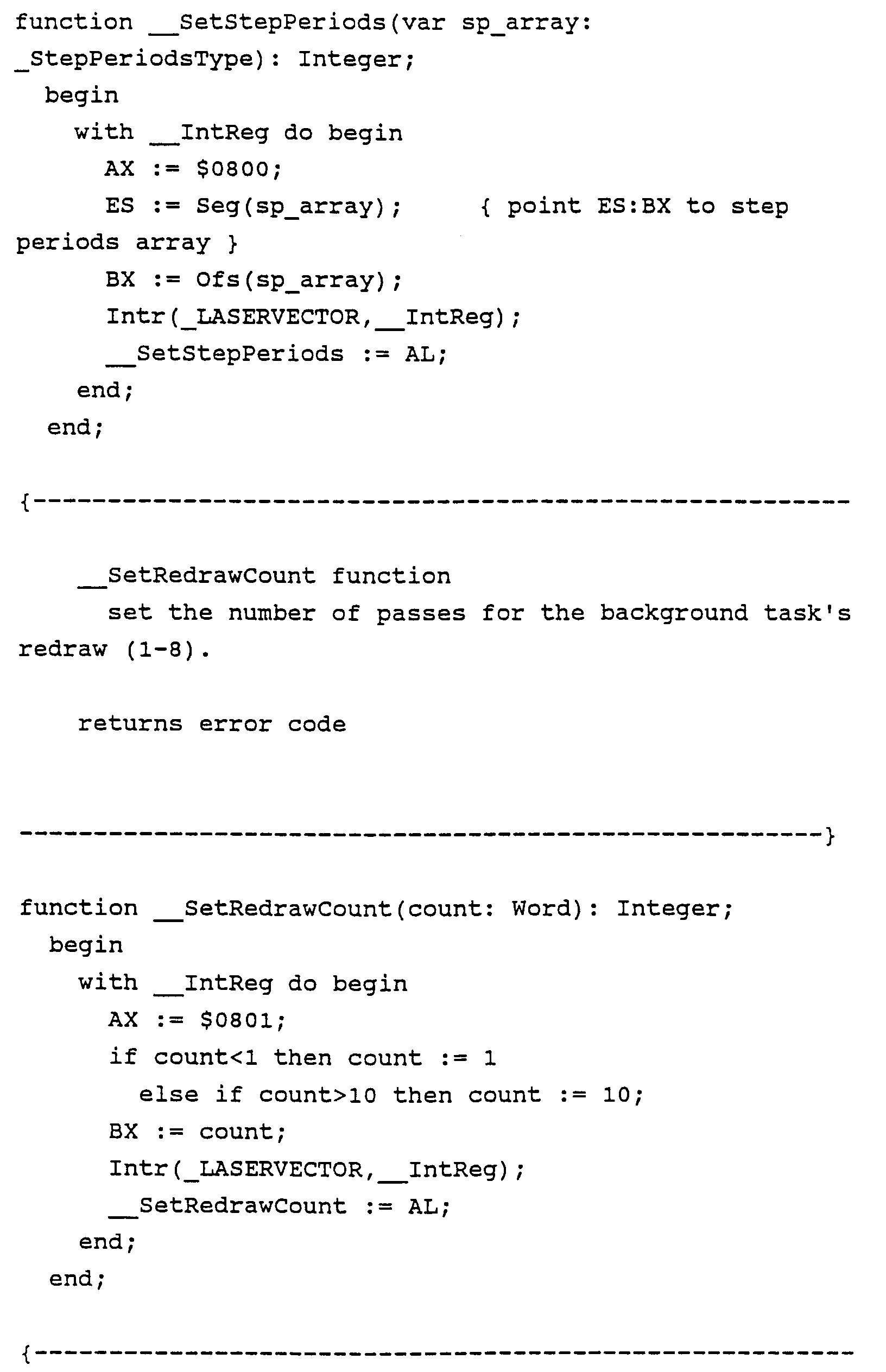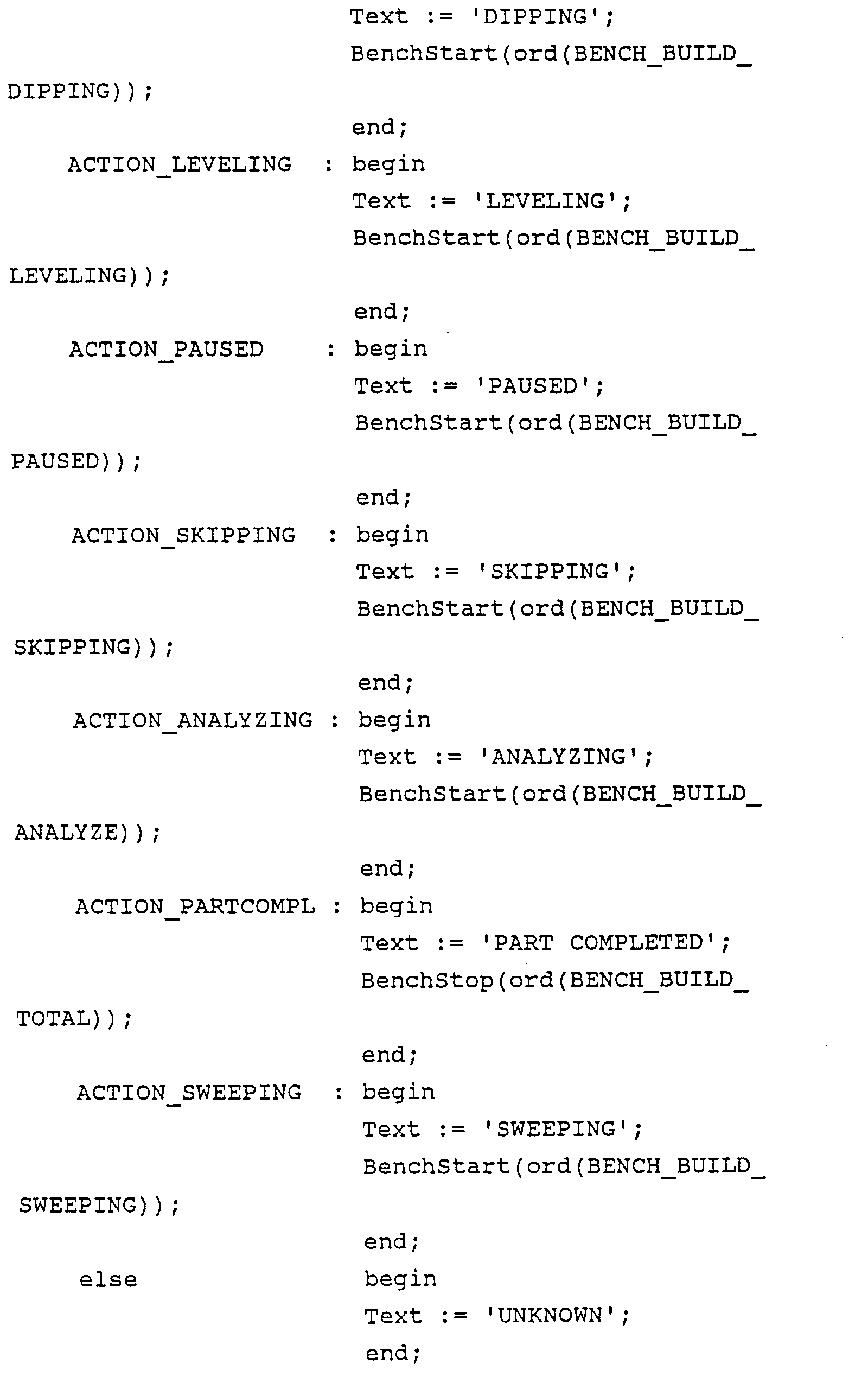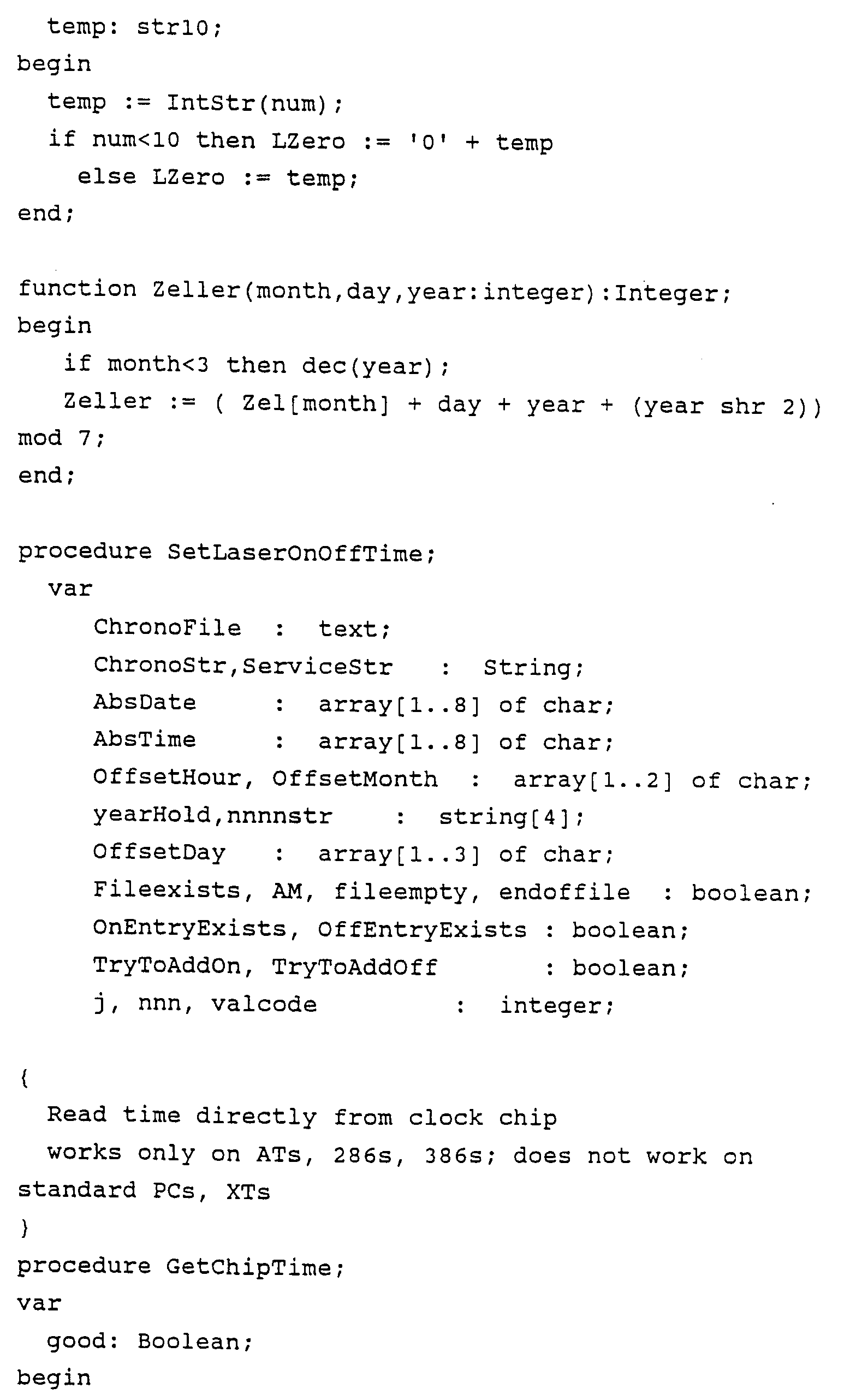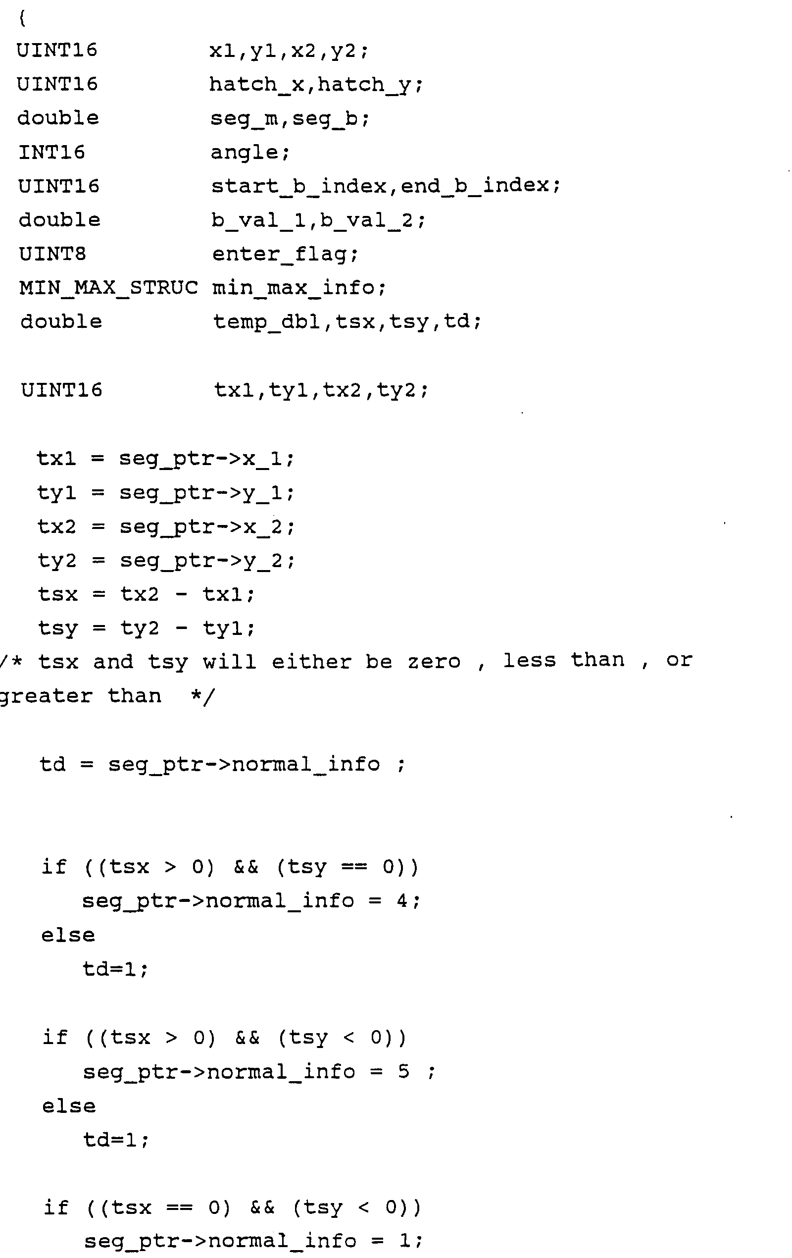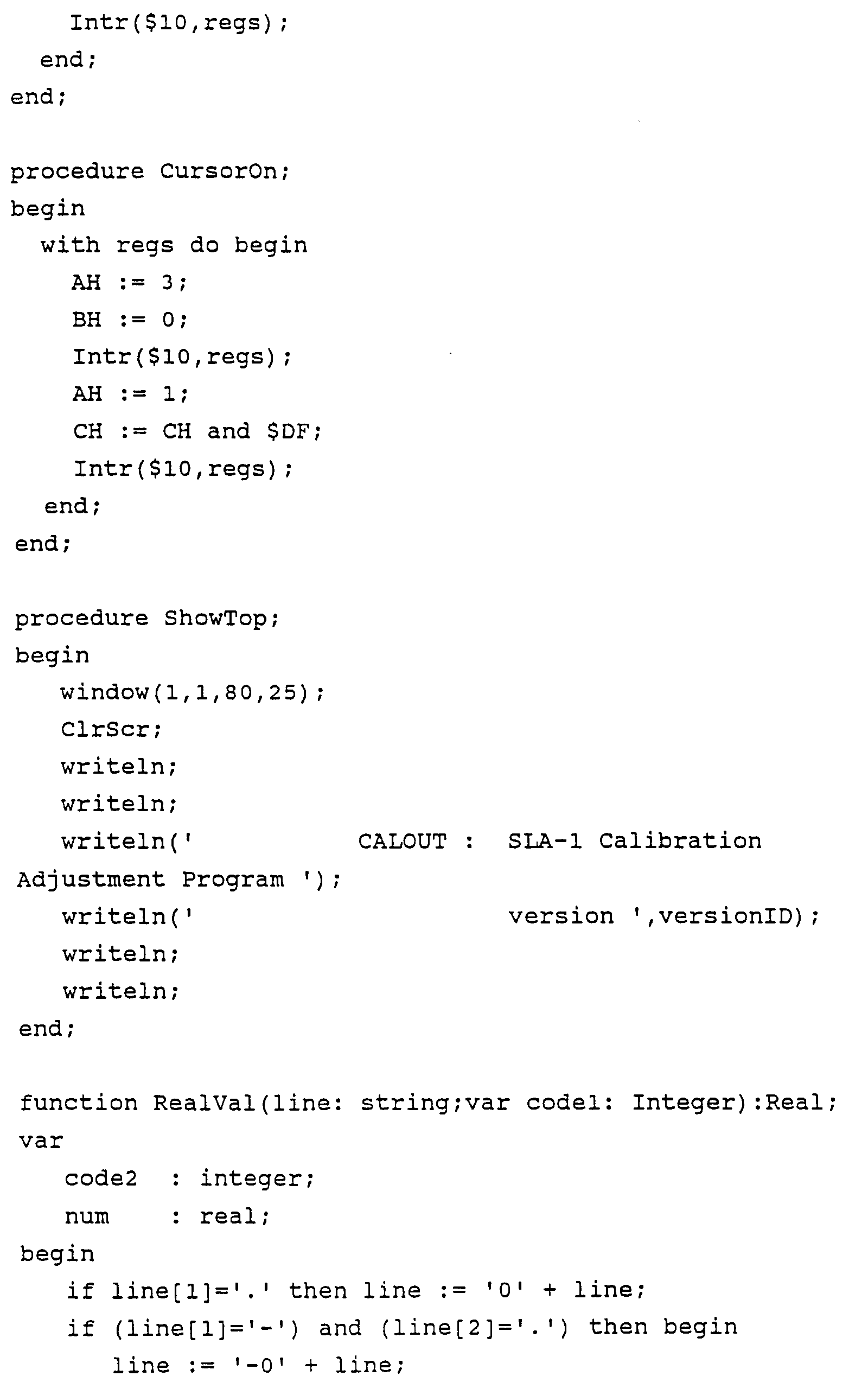 The Pascal function below is a sample for computing the values of the drift correction variables. The 'Ref' variables are the reference positions of the two beam profile sensors read from the disk data file. The 'Now' variables are the most recently determined positions of the two profile sensors. Because of dynamic changes in the physical characteristics of the laser scanning system, the positions held in the 'Now' variables will differ slightly from the ideal reference positions. The goal is to use these position differences to adjust upcoming mirror positions.