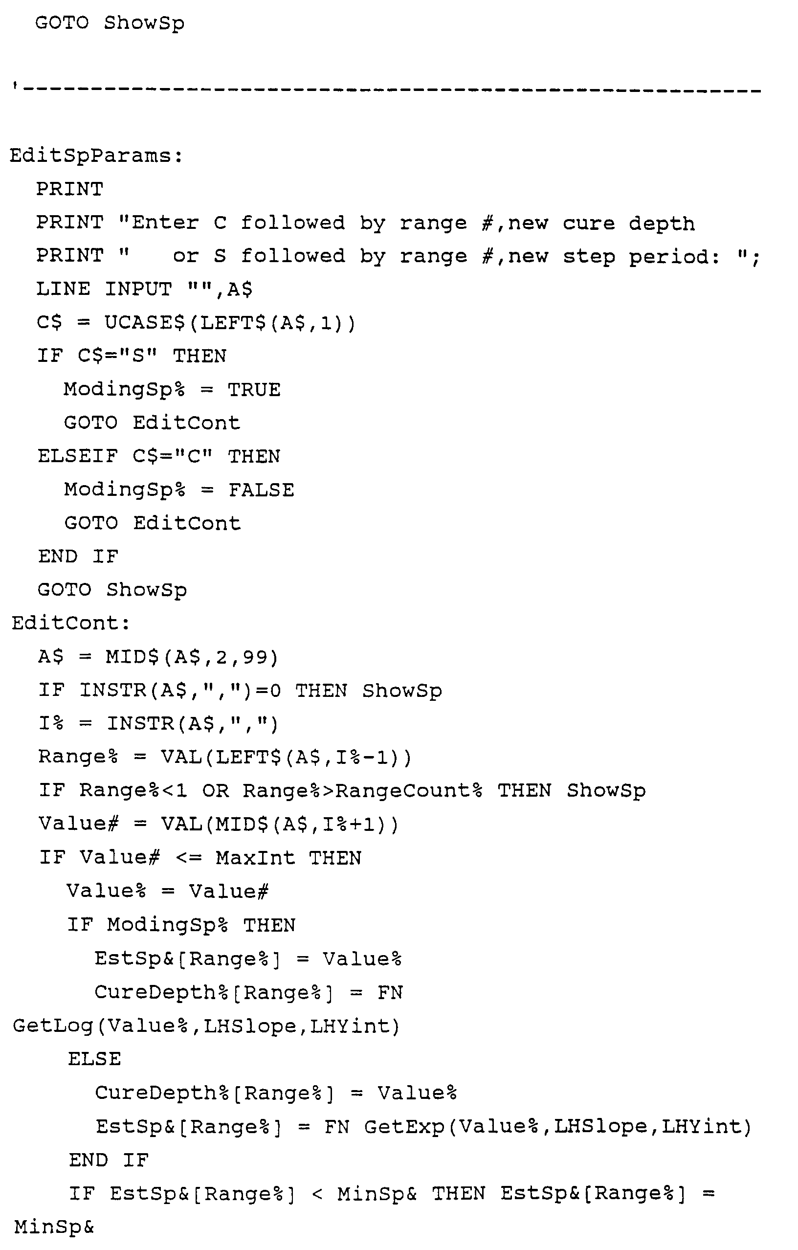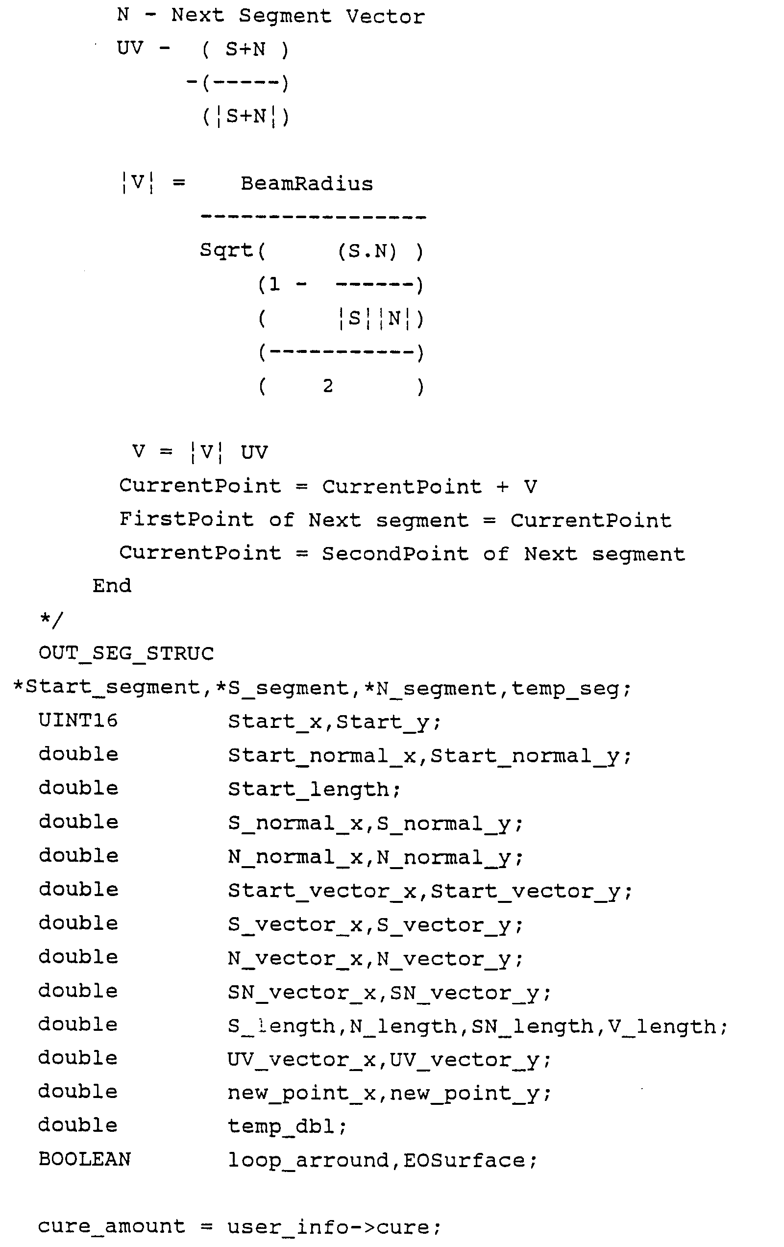 To display the predicted trace profile, a scaled diagram of cure depth versus position is plotted across the beam. The scale factor for distance across the beam is easy, where one simply selects one column (or row, etc.) of the scan, with dimension s, to correspond to a pixel or graphics display block. The depth scale is then lambda/s pixels (or blocks) for each increase in exposure by a factor of e. The only arbitrary feature is the zero of depth, related to the characteristic exposure Ec of Eg. 9, or equivalent factors from Eq. 7. The useful depth to be displayed is determined by the dynamic range of the intensity measuring system, and truncation at I(m,n)≥ any appropriate value close to the noise level.