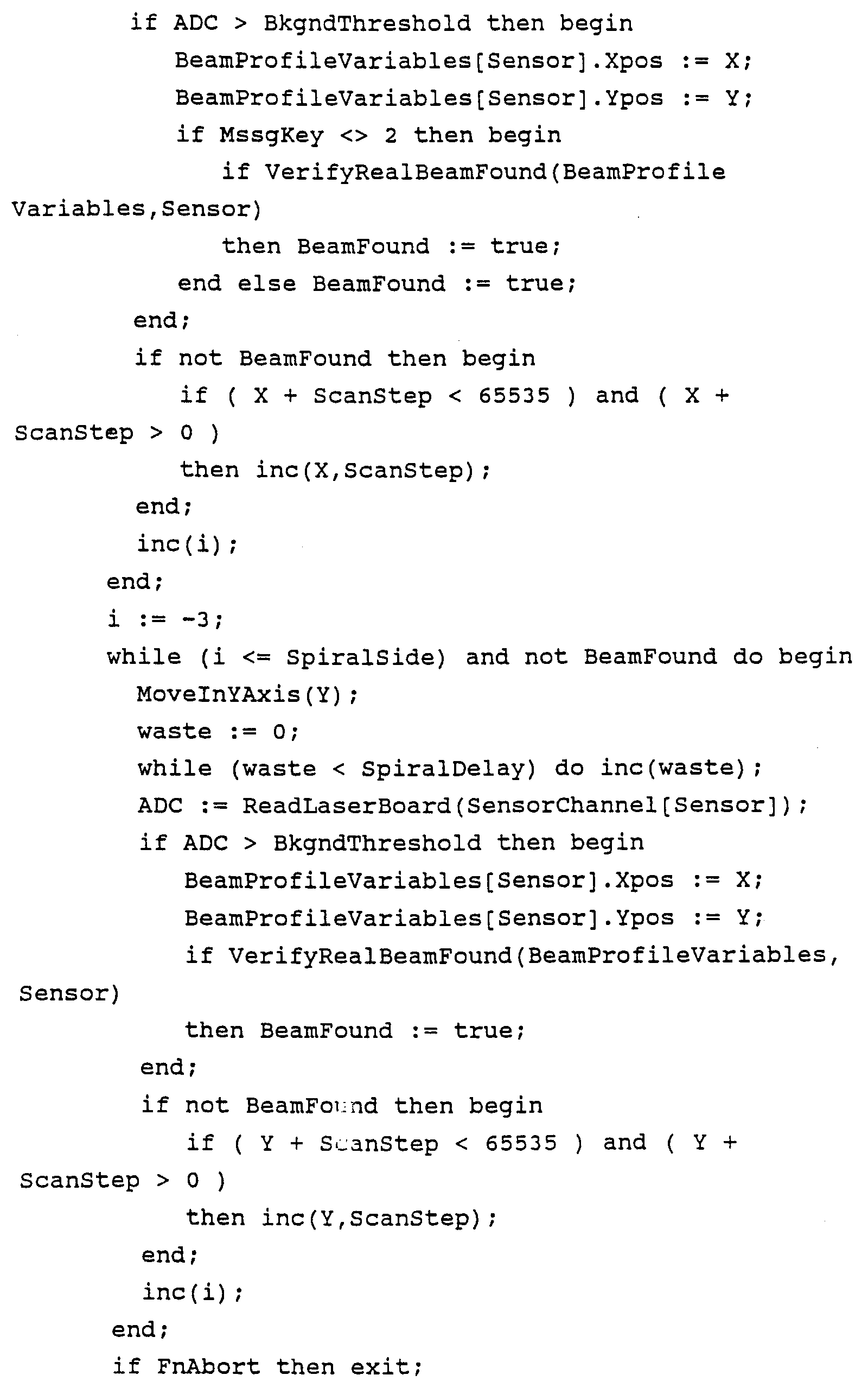 In physical terms, the beam profile method according to the present invention causes the beam to be moved to each of the points of an array on the pinhole plate centered on the best known position of the pinhole. As a result, different sectors of the beam will fall on the pinhole and will be transmitted through the same to be detected by the photodiode and converted into a numerical signal that can be analyzed by the computer. A profile of the intensity of different sectors of the beam will be built up by the computer (see FIG. 13). This is the "intensity profile" of the beam.