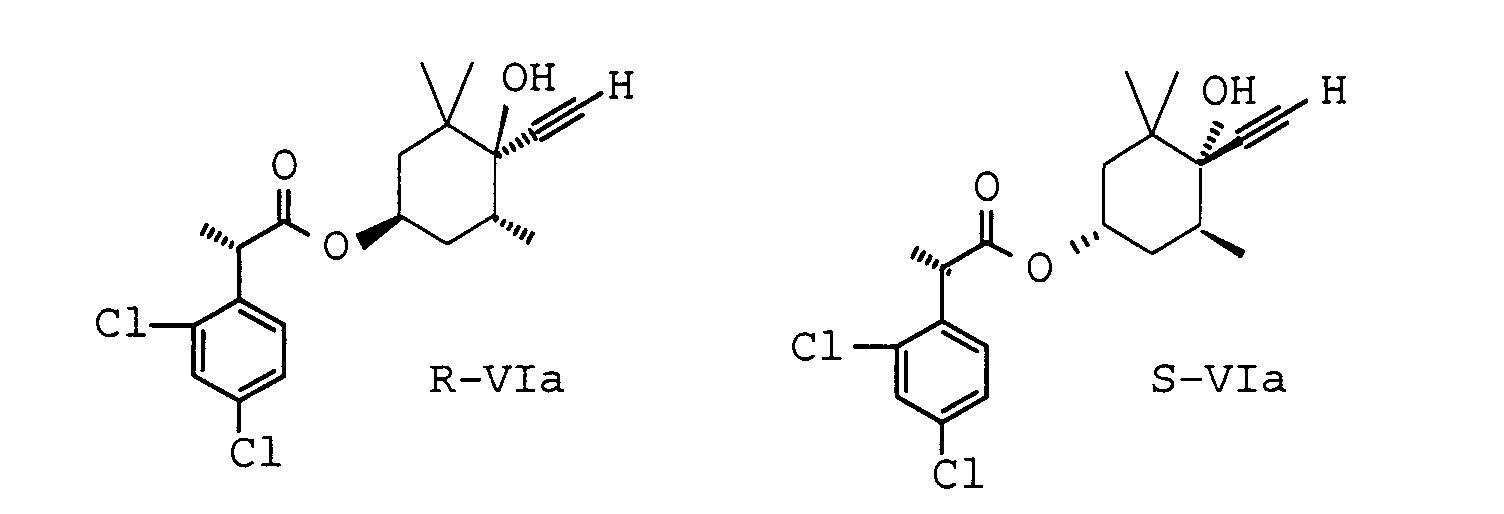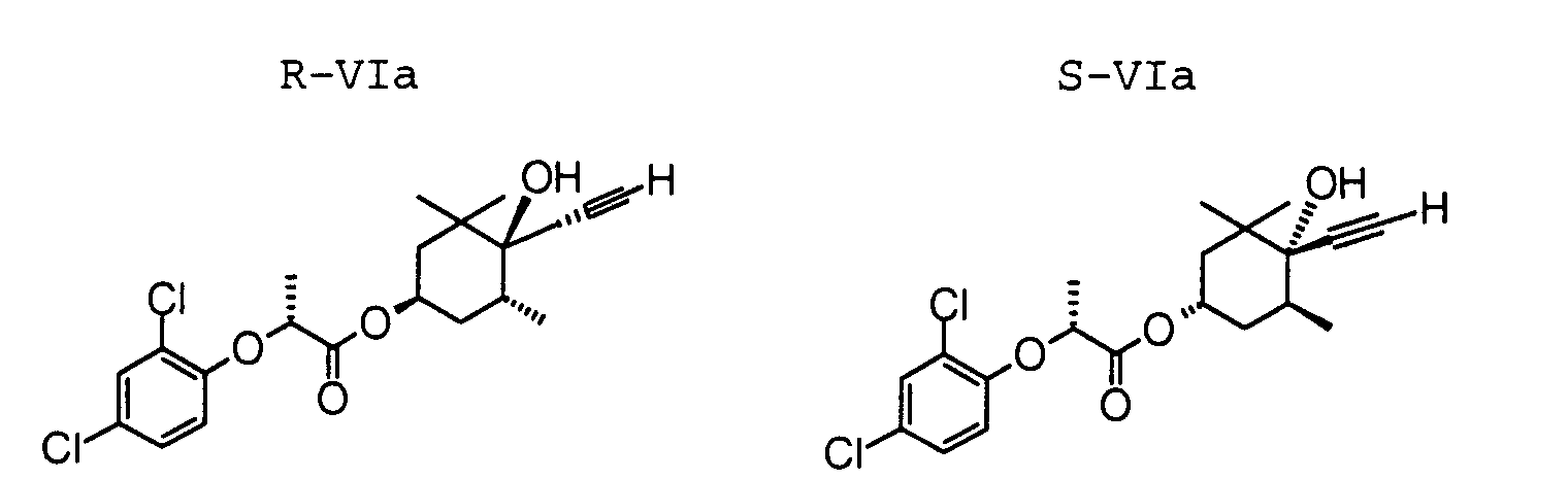 In einer bevorzugten Ausführungsform des erfindungsgemäßen Verfahrens wird das racemische Gemisch der Acetylendiole RI und SI in einem inerten Lösungsmittel in Gegenwart einer Base mit 1-1,2 Äquivalenten D-2,4-Dichlorpropionsäurechlorid bei etwa 0°C bis Raumtemperatur umgesetzt. In a preferred embodiment of the process according to the invention, the racemic mixture of acetylenediols RI and SI is in an inert solvent in the presence of a base with 1-1.2 equivalents of D-2,4-Dichlorpropionsäurechlorid at about 0 ° C to room temperature. Man erhält so in quantitativer Ausbeute ein Gemisch der diastereomeren 2,4-Dichlorphenoxypropionsäureester R-VIa und S-VIa. Obtained in quantitative yield as a mixture of the diastereomeric 2,4-Dichlorphenoxypropionsäureester R-VIa and S-VIa.
