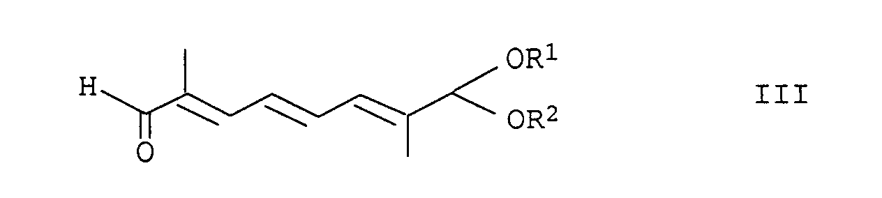 Um aus den Phosphoniumsalzen R-II und S-II meso-Zeaxanthin zu erhalten, das völlig frei von R,R-Zeaxanthin und S,S-Zeaxanthin ist, müssen die Wittig-Reaktionen des zentralen C 10 -Bausteins mit R-II bzw. S-II nacheinander vollständig selektiv ablaufen. To get from the phosphonium salts R-II and S-II meso-zeaxanthin, S-zeaxanthin is completely free of R, R-zeaxanthin and S, have the Wittig reactions of the central C or 10 -Bausteins with R-II . S-II in succession completely selective proceed. Die für die Synthese eines einheitlichen Produkts erforderliche Selektivität ist nur dann gewährleistet, wenn ein C 10 -Dialdehyd entsprechend der allgemeinen Formel III, eingesetzt wird, bei dem eine Carbonylgruppe als Acetal geschützt ist. The time required for the synthesis of a single product selectivity is only guaranteed when a C10 dialdehyde is represented by the general formula III is used in which a carbonyl group is protected as an acetal.