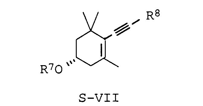 Die Derivatisierung erfolgt völlig selektiv an der sekundären OH-Gruppe. Derivatization is completely selectively on the secondary OH group. Die Acetylendiole RI und SI erwiesen sich überraschenderweise sowohl chemisch als auch konfigurativ stabil gegenüber den Bedingungen, die für die Einführung der chiralen Hilfsgruppe, Trennung der diastereomeren Zwischenprodukte R-VI und S-VI und Abspaltung der Hilfsgruppe erforderlich sind. The acetylenediols RI and SI proved surprisingly both chemically and configurationally stable to the conditions that are necessary for the introduction of the chiral auxiliary, separation of the diastereomeric intermediates R-VI and S-VI and cleavage of the auxiliary.