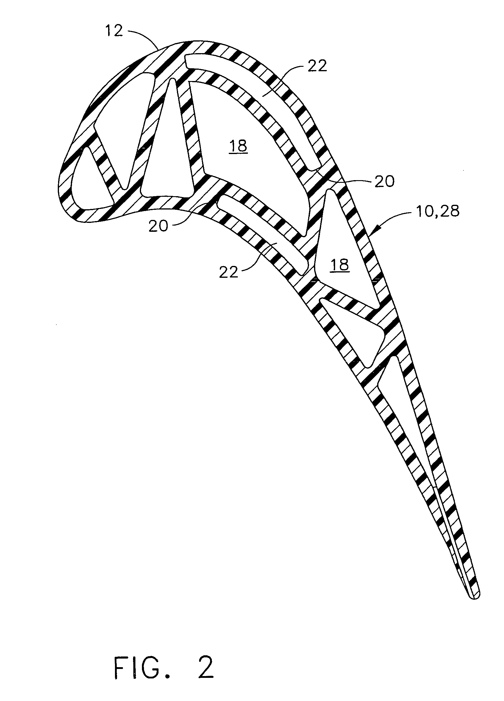 - Figure 2 is a radial sectional view through the airfoil portion of the actual component and synthetic model illustrated in Figure 1 and taken along line 2-2.