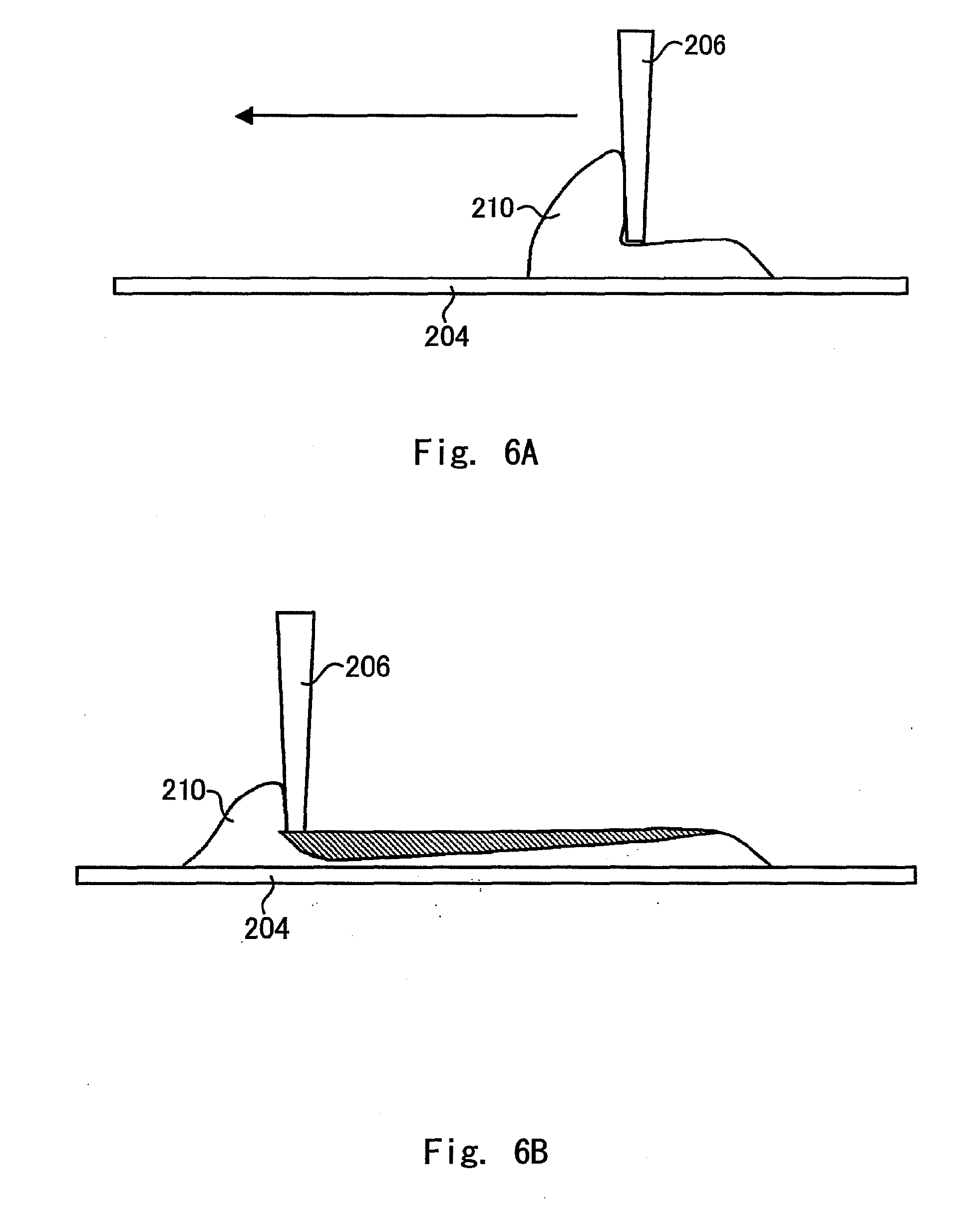 Referring to Fig. 6A, photocurable resin 210 is supplied onto the stereolithography table 204. Then, a recoater 206 is moved in the direction indicated by the arrow in the drawing, thereby spreading the photocurable resin 210. At this time, a certain amount of the photocurable resin 210 is accumulated in the front of the recoater 206 in its moving direction. Thus, the falling speed toward the stereolithography table differs between the liquid resin which is in contact with the recoater 206 and the liquid resin which is apart from the recoater 206 (cf. Fig. 6C). When the recoater 206 is close to a resin supply position and a large amount of liquid resin is attached onto the front of the recoater 206 in its moving direction, the movement of resin is large even in the position where the falling speed is low, so that a sufficient amount of the liquid resin is supplied between the recoater 206 and the stereolithography table 204, thus keeping the thickness of a resin layer constant. However, as the recoater 206 moves, the amount of the liquid resin which is attached onto the front of the recoater 206 in its moving direction decreases, and the moving speed of the resin near the surface of the recoater 206 becomes smaller. Accordingly, the thickness of a resin layer gradually decreases. Consequently, in the state where the photocurable resin 210 is spread, the thickness of the photocurable resin 210 is not uniform as shown in Fig. 6B. If light is applied in such a state, an uneven thickness of cured resin layer is formed, which resulting in failure to obtain a desired three-dimensional shape.