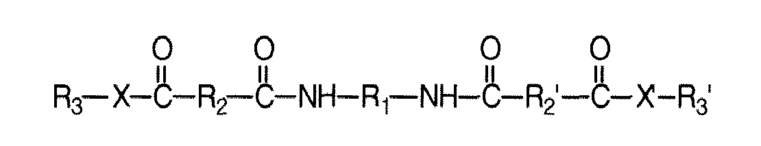 3 each, independently of the others, are alkylene groups, arylene groups, arylalkylene groups, or alkylarylene groups, and n is an integer representing the number of repeat amide units and is at least 1.