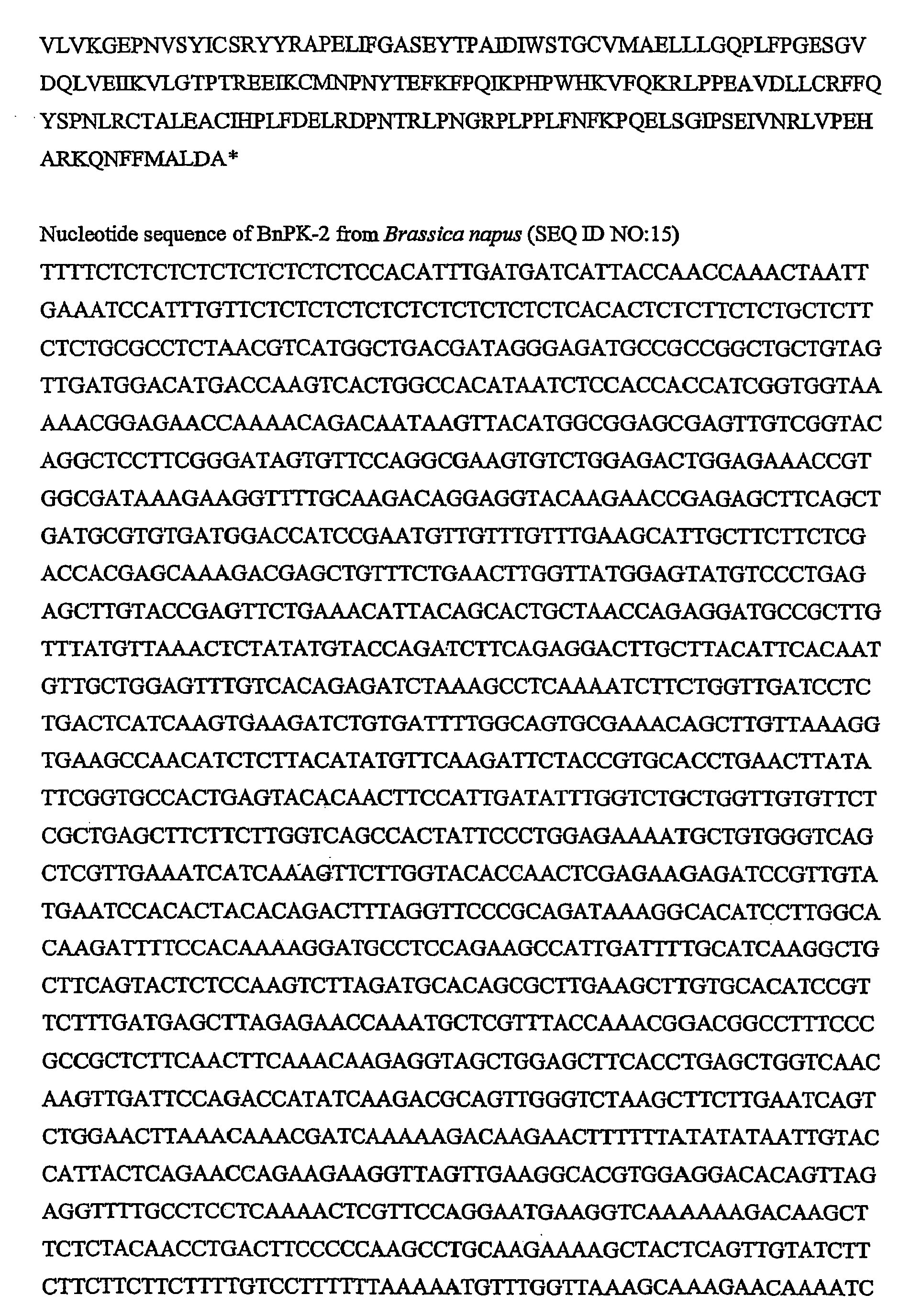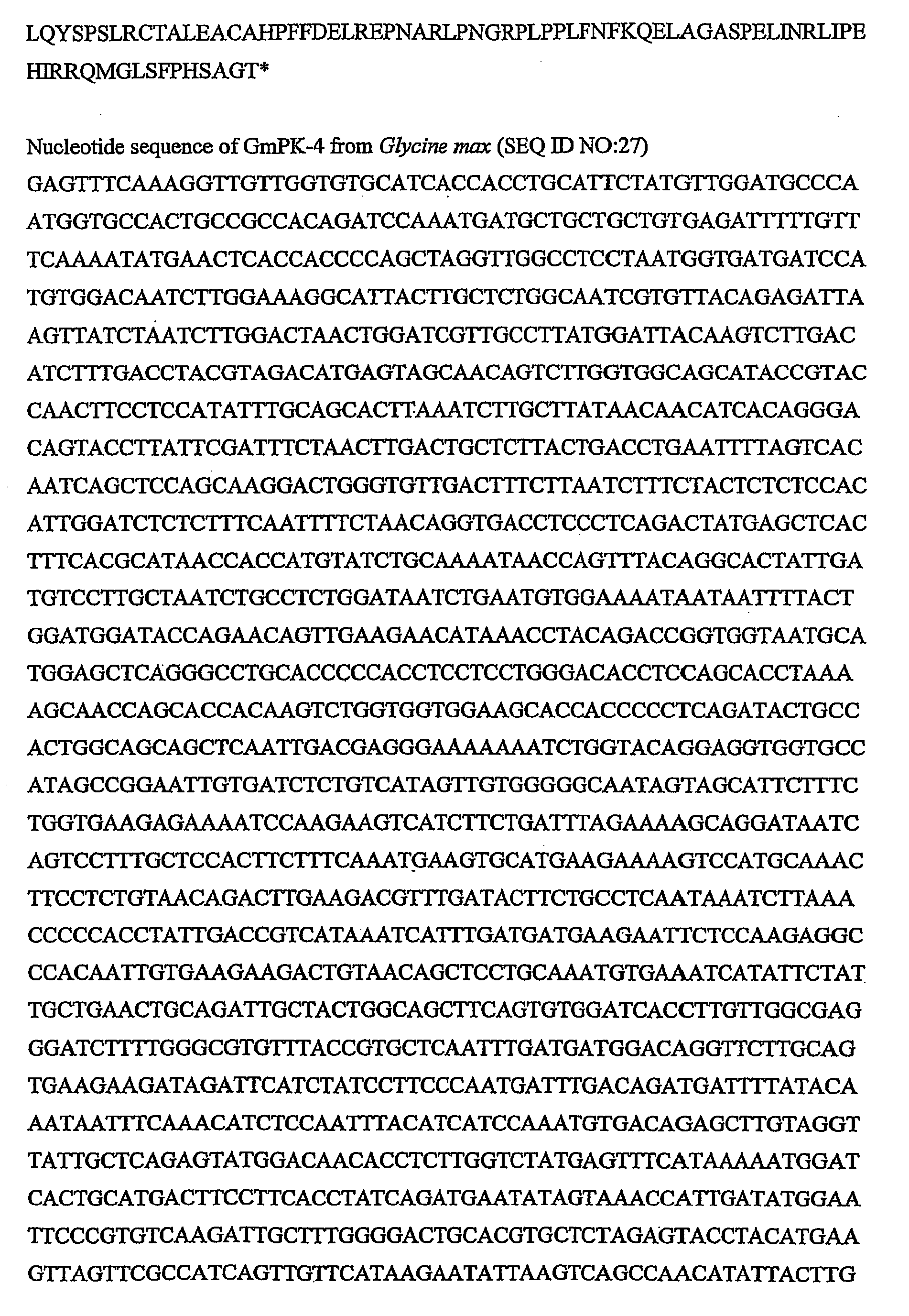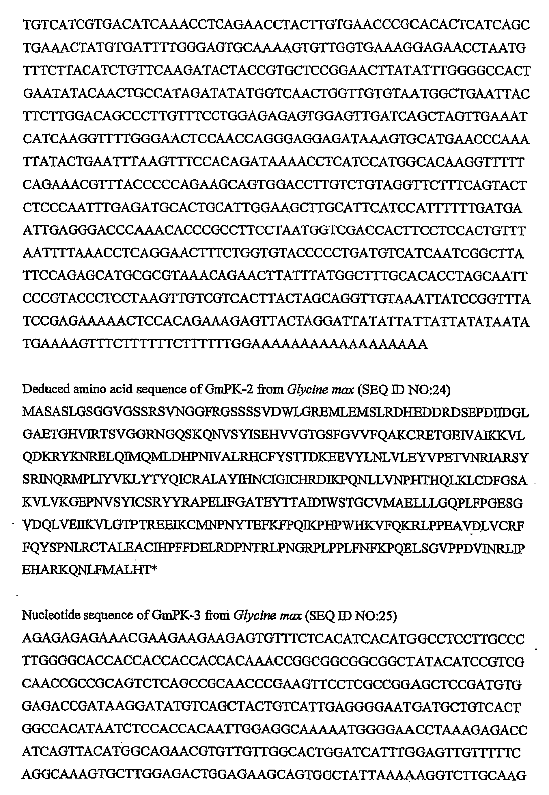 In a preferred embodiment, an isolated nucleic acid molecule of the invention comprises one of the nucleotide sequences shown in SEQ ID NO:1, SEQ ID NO:2, SEQ ID NO:4, SEQ ID NO:5, SEQ ID NO:7, SEQ ID NO:8, SEQ ID NO:10, SEQ ID NO:11, SEQ ID NO:13, SEQ ID NO:15, SEQ ID NO:17, SEQ ID NO:19, SEQ ID NO:21, SEQ ID NO:23, SEQ ID NO:25, SEQ ID NO:27, and SEQ ID NO:29. These cDNAs may comprise sequences encoding the PKSRPs, (i.e., the "coding regions" of PK-3 and PK-4), as well as 5' untranslated sequences and 3' untranslated sequences. The coding region of PK-3 comprises nucleotides 138-1409 of SEQ ID NO:2 whereas the coding region of PK-4 comprises nucleotides 142-1395 of SEQ ID NO:5. It is to be understood that SEQ ID NO:2 and SEQ ID NO:5 comprise both coding regions and 5' and 3' untranslated regions. Alternatively, the nucleic acid molecules of the present invention can comprise only the coding region of any of the sequences in SEQ ID NO:2 and SEQ ID NO:5 or can contain whole genomic fragments isolated from genomic DNA. The present invention also includes PKSRP coding nucleic acids that encode PKSRPs as described herein. Preferred is a PKSRP coding nucleic acid that encodes a PKSRP selected from the group consisting of PK-3 as defined in SEQ ID NO:3, PK-4 as defined in SEQ ID NO:6, PK-10 as defined in SEQ ID NO:9, PK-11 as defined in SEQ ID NO:12, BnPK-1 as defined in SEQ ID NO:14, BnPK-2 as defined in SEQ ID NO:16, BnPK-3 as defined in SEQ ID NO:18, BnPK-4 as defined in SEQ ID NO:20, GmPK-1 as defined in SEQ ID NO:22, GmPK-2 as defined in SEQ ID NO:24, GmPK-3 as defined in SEQ ID NO:26, GmPK-4 as defined in SEQ ID NO:28, and OsPK-1 as defined in SEQ ID NO:30.