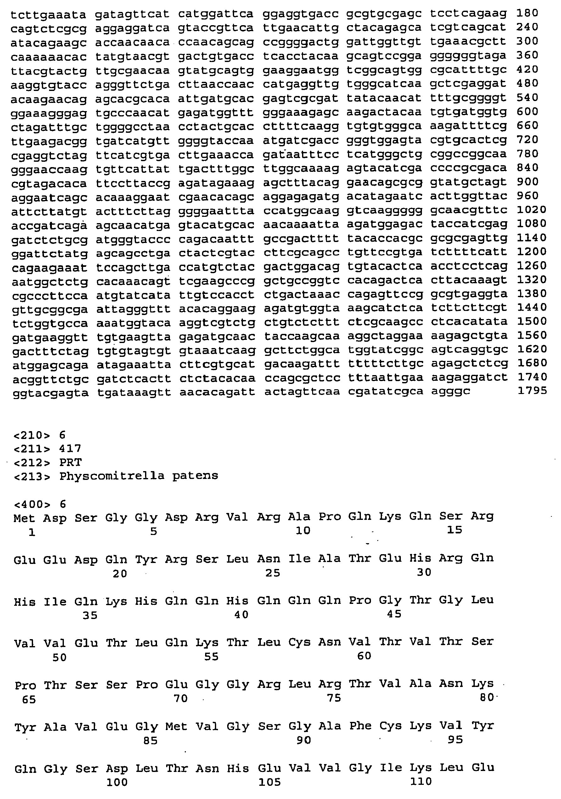 A nucleic acid molecule of the present invention, e.g., a nucleic acid molecule having a nucleotide sequence of SEQ ID NO:2, SEQ ID NO:5 SEQ ID NO:8, SEQ ID NO:11, SEQ ID NO:13, SEQ ID NO:15, SEQ ID NO:17, SEQ ID NO:19, SEQ ID NO:21, SEQ ID NO:23, SEQ ID NO:25, SEQ ID NO:27, SEQ ID NO:29, or a portion thereof, can be isolated using standard molecular biology techniques and the sequence information provided herein. For example, a P. patens PKSRP cDNA can be isolated from a P. patens library using all or portion of one of the sequences of SEQ ID NO:1 and SEQ ID NO:4. Moreover, a nucleic acid molecule encompassing all or a portion of one of the sequences of SEQ ID NO:2, SEQ ID NO:5 SEQ ID NO:8, SEQ ID NO:11, SEQ ID NO:13, SEQ ID NO:15, SEQ ID NO:17, SEQ ID NO:19, SEQ ID NO:21, SEQ ID NO:23, SEQ ID NO:25, SEQ ID NO:27, and SEQ ID NO:29 can be isolated by the polymerase chain reaction using oligonucleotide primers designed based upon this sequence. For example, mRNA can be isolated from plant cells (e.g., by the guanidinium-thiocyanate extraction procedure of Chirgwin et al., 1979, Biochemistry 18:5294-5299) and cDNA can be prepared using reverse transcriptase (e.g., Moloney MLV reverse transcriptase, available from Gibco/BRL, Bethesda, MD; or AMV reverse transcriptase, available from Seikagaku America, Inc., St Petersburg, FL). Synthetic oligonucleotide primers for polymerase chain reaction amplification can be designed based upon one of the nucleotide sequences shown in SEQ ID NO:2, SEQ ID NO:5 SEQ ID NO:8, SEQ ID NO:11, SEQ ID NO:13, SEQ ID NO:15, SEQ ID NO:17, SEQ ID NO:19, SEQ ID NO:21, SEQ ID NO:23, SEQ ID NO:25, SEQ ID NO:27, and SEQ ID NO:29. A nucleic acid molecule of the invention can be amplified using cDNA or, alternatively, genomic DNA, as a template and appropriate oligonucleotide primers according to standard PCR amplification techniques. The nucleic acid molecule so amplified can be cloned into an appropriate vector and characterized by DNA sequence analysis. Furthermore, oligonucleotides corresponding to a PKSRP nucleotide sequence can be prepared by standard synthetic techniques, e.g., using an automated DNA synthesizer.
