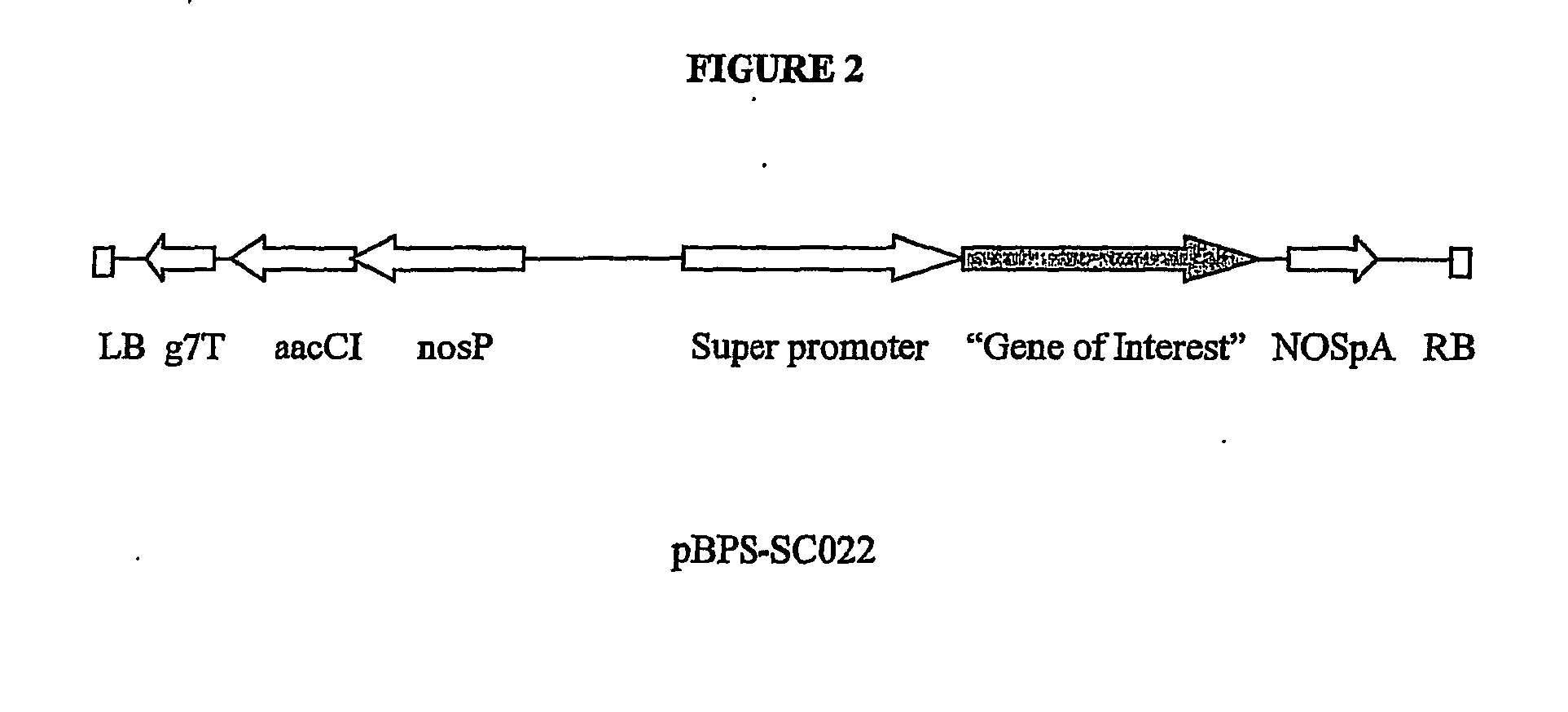Figure 1 shows a diagram of the plant expression vector pBPS-JH001 containing the super promoter driving the expression of the PKSRP coding nucleic acid ("Gene of Interest"). The components are: aacCI gentamycin resistance gene (Hajdukiewicz et al., 1994, Plant Molec. Biol. 25: 989-94), NOS promoter (Becker et al., 1992, Plant Molec. Biol. 20: 1195-97), g7T terminator (Becker et al., 1992), and NOSpA terminator (Jefferson et al., 1987, EMBO J. 6:3901-7).