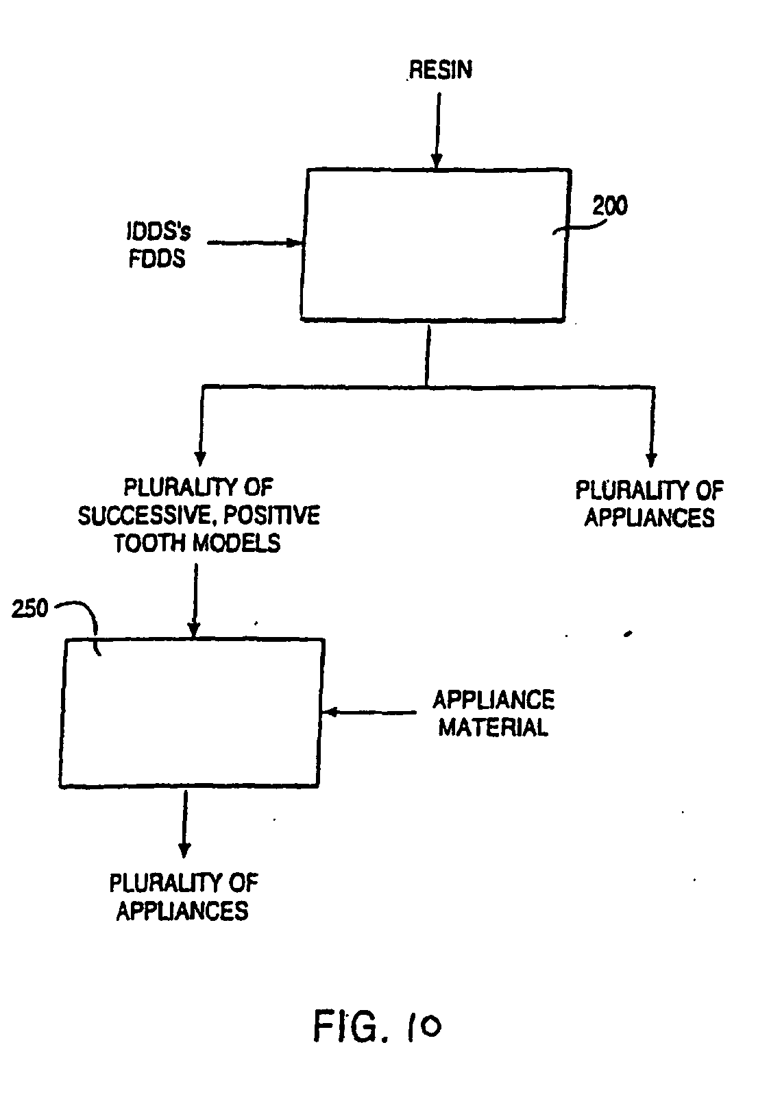 - 43. A method as in clause 42, wherein the controlling step comprises selectively hardening a non-hardened resin to produce the appliance and separating the appliance from the remaining liquid resin.