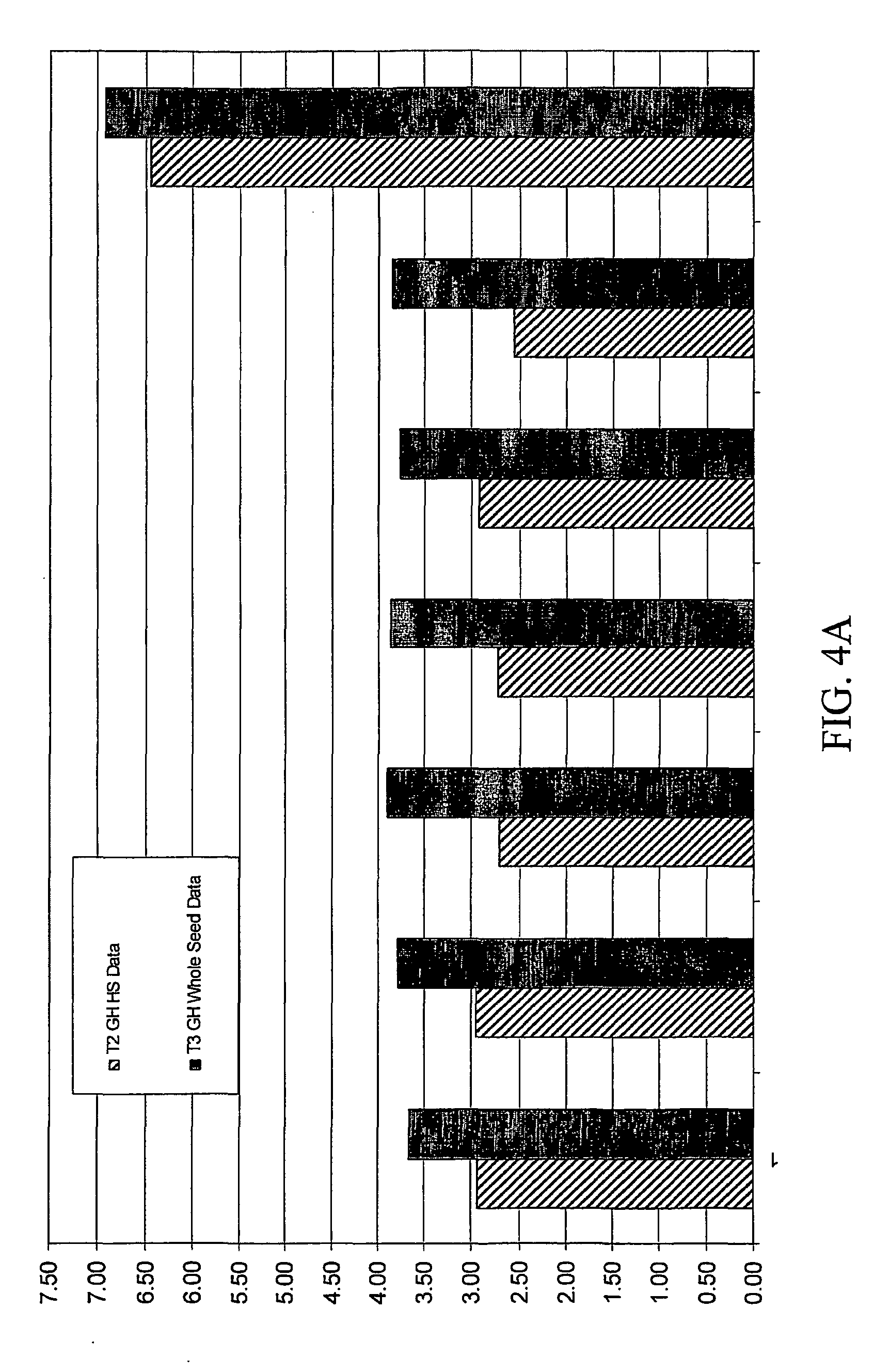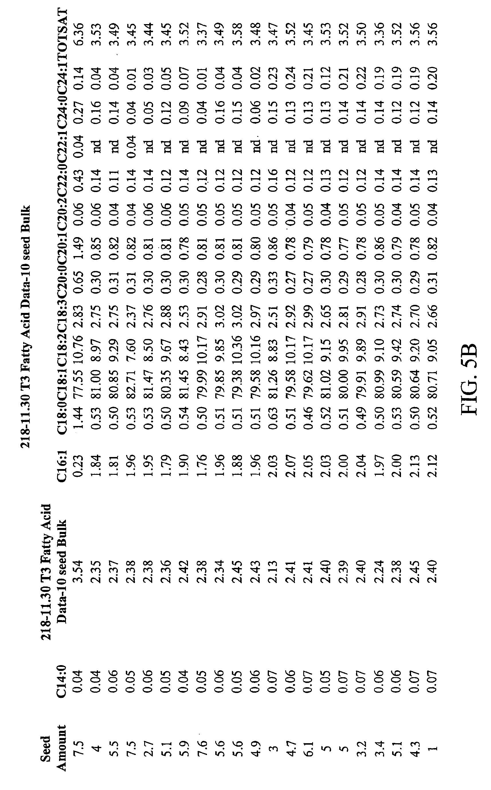 Table 29 contains 10 seed bulk fatty acid data from Nex 710, the simple events, and each single F4 plant. Nine plants of each suspected stack, null, simple event, and the like were regrown, tissue sampled for molecular analysis, and kept through to seed set for fatty acid analysis.