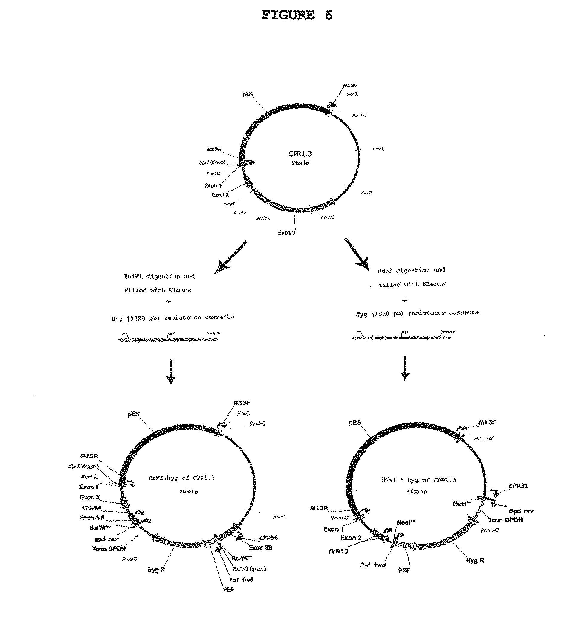 Figure 6, shows the detail of the constructs made, basically the CPR1.3 vector has a DNA fragment of X. dendrorhous, content segment between nucleotides 4531 and 9902 of the SEQ1, was digested with restriction enzymes BsiWI and NdeI to generate a deletion in the gene CRTR. The ends of the fragment obtained (containing the deletion CRTR), were filled with Klenow polymerase to enable the module linked hygromycin resistance whose ends are blunt. Thus obtained two clones: CPR1.3ΔNdeI CPR1.3ΔBsiMI + and + hyg hyg. The insertion of this construct into the genome of wild strains used, was performed by homologous recombination technique detailed below. Using these vectors wild strains of X. dendrorhous were transformed: UCD 67-385 and CBS 6938.