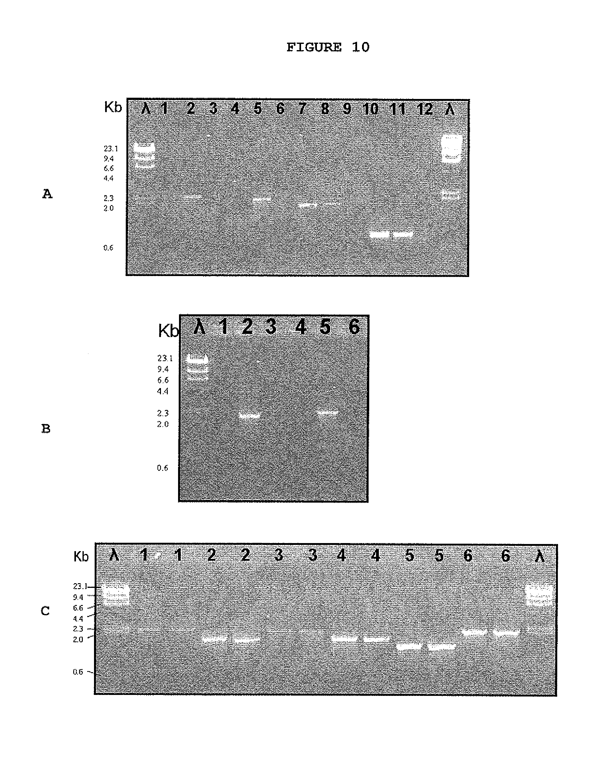 - Figure 10 gel PCR reaction of wild type and transformants. λ: molecular size standard bacteriophage λ DNA digested with enzyme HindIII (bands of 23.1, 9.4, 6.6, 4.4, 2.3, 2.0 and 0.6 kb)