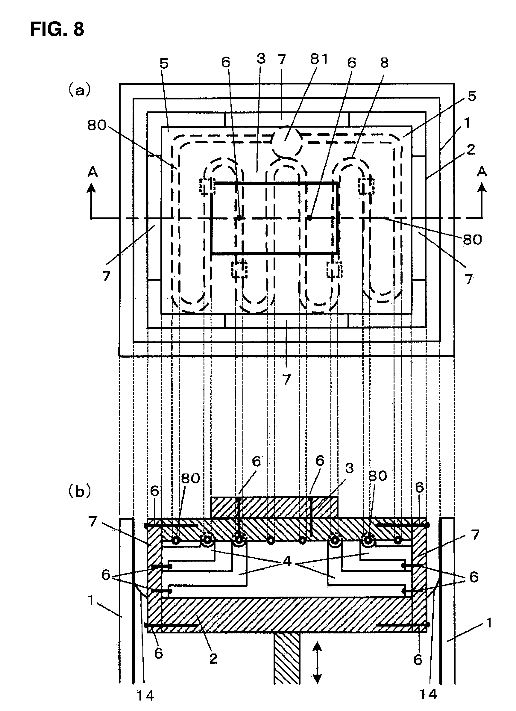To be more specific, as shown in Fig. 9, as a matter of course , such a configuration is adoptable that the HC apparatus 8 is installed on a part of the table 2. (In Fig. 9, both the base 91 of the embodiment (2) and the upper plate 92 of the embodiment (3) are commonly illustrated but the base plate 3 is not illustrated.)