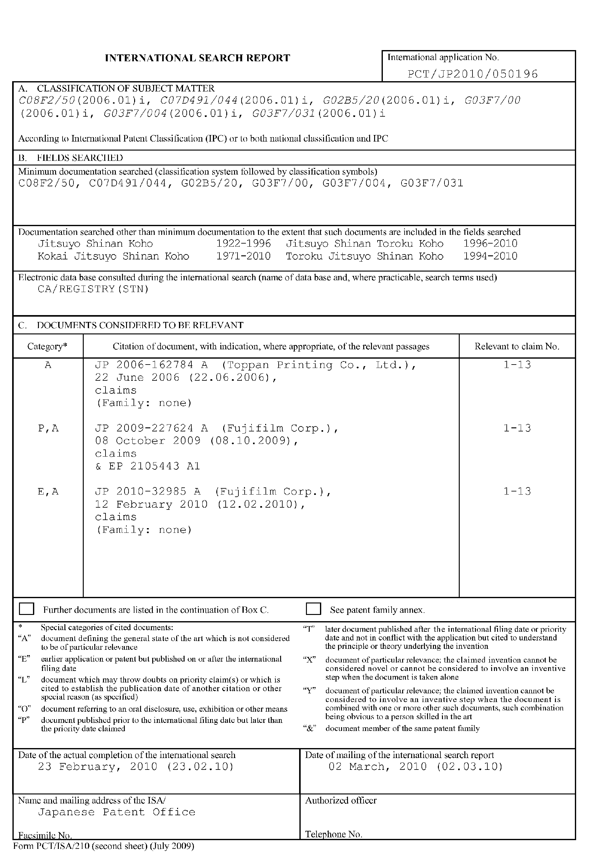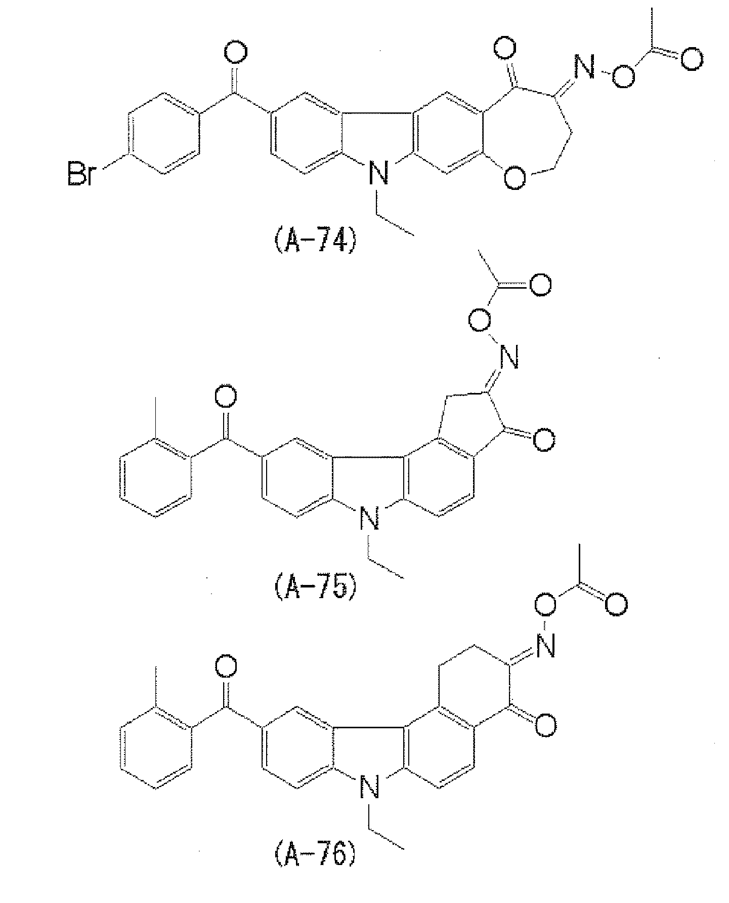 JP-ANo. 2007-23000 ). However, since these known oxime ester compounds have low light absorptivity in the wavelength of 365 nm and/or the wavelength of 405 nm, they are still unsatisfactory in view of sensitivity.