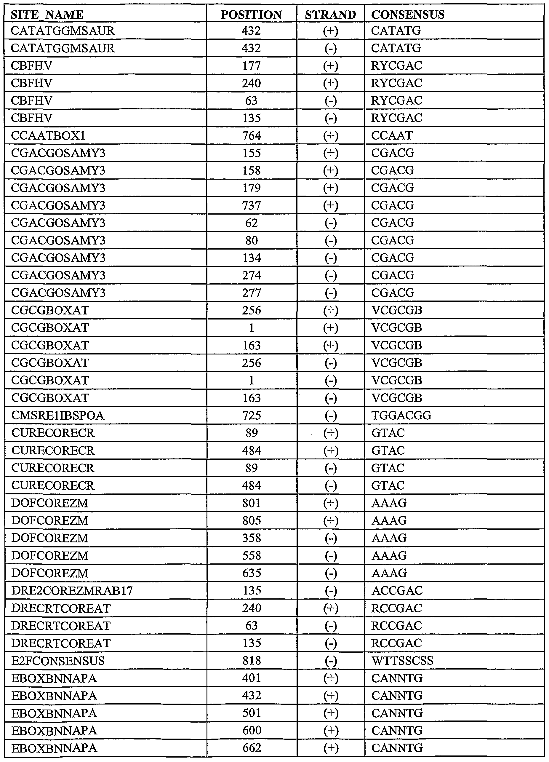 GTICONSENSUS 548 (+) GRWAAW GTICONSENSUS 470 (-) GRWAAW GTICONSENSUS 471 (-) GRWAAW GT1GMSCAM4 548 (+) GAAAAA GTGANTGlO 681 (+) GTGA GTGANTGlO 537 (-) GTGA GTGANTGlO 557 (-) GTGA GTGANTGlO 613 (-) GTGA GTGANTGlO 625 (-) GTGA HEXAMERATH4 112 (+) CCGTCG HEXAMERATH4 95 (-) CCGTCG HEXAMERATH4 125 <-) CCGTCG HEXAMERATH4 628 (-) CCGTCG IBOXCORE 434 (+) GATAA INRNTPSADB 467 (+) YTCANTYY LTRE1HVBLT49 413 (-) CCGAAA LTREC0REATC0R15 208 (+) CCGAC LTREC0REATC0R15 114 (-) CCGAC MYB2CONSENSUSAT 31 (-) YAACKG MYBCORE 31 (+) CNGTTR MYBCORE 98 (+) CNGTTR MYBCORE 366 (-) CNGTTR MYBCOREATCYCB1 634 (+) AACGG ' MYBCOREATCYCBl 31 (-) AACGG MYBCOREATCYCBl 617 (-) AACGG MYBGAHV 661 (+) TAACAAA MYBPZM 365 (+ ) CCWACC MYBSTl 433 (+) GGATA MYCCONSENSUSAT 24 (+) CANNTG MYCCONSENSUSAT 380 (+) CANNTG MYCCONSENSUSAT 446 (+) CANNTG MYCCONSENSUSAT 543 (+) CANNTG MYCCONSENSUSAT 739 (+) CANNTG MYCCONSENSUSAT 24 (-) CANNTG MYCCONSENSUSAT 380 (-) CANNTG MYCCONSENSUSAT 446 (-) CANNTG MYCCONSENSUSAT 543 (-) CANNTG MYCCONSENSUSAT 739 (-) CANNTG POLASIG3 700 (+) AATAAT