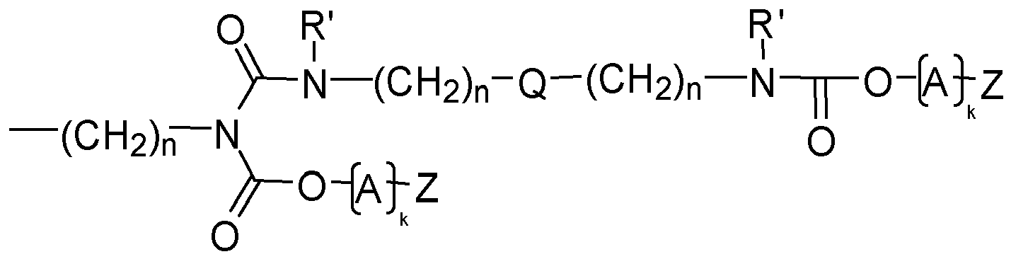 - jedes Y bedeutet ein Strukturelement, welches in der Struktur Q(YZ e ) b das polyalicyclische Strukturelement Q mit e Strukturelementen Z verbindet, wobei jedes Y unabhängig von etwaigen weiteren Strukturelementen Y gewählt ist oder entfällt, each Y represents a structure element in the structure Q (YZ e) b polyalicyclic the structure element Q with e structure elements connecting Z, wherein each Y is selected independently of any further structure elements Y or is omitted,
