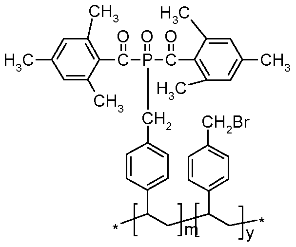 0.78 g (1.71 mmol, 1 eq.) of freshly prepared (4-vinylbenzyl)-bis(2,4,6- trimethylbenzoyl)-phosphine (example 1 ) and 1.8 ml. (1.6 g, 15.4 mmol, 9 eq.) styrene are dissolved in 0.6 ml. toluene. 47.6 mg (2% w/w) AIBN are added and the the solution is stirred at 600C for 50 hours. 5 ml Toluene are subsequently added to the yellow gel which is formed in order to dissolve the polymer. The polymer is then precipitated by the addition of petroleum ether. This procedure is repeated twice before the polymer is filtrated off and washed with petroleum ether. The polymer is dried under vacuum providing 2.121 g of the (4-vinylbenzyl)-bis(2,4,6-trimethylbenzoyl)-phosphine/styrene co-polymer. Conversion: 87.4%.