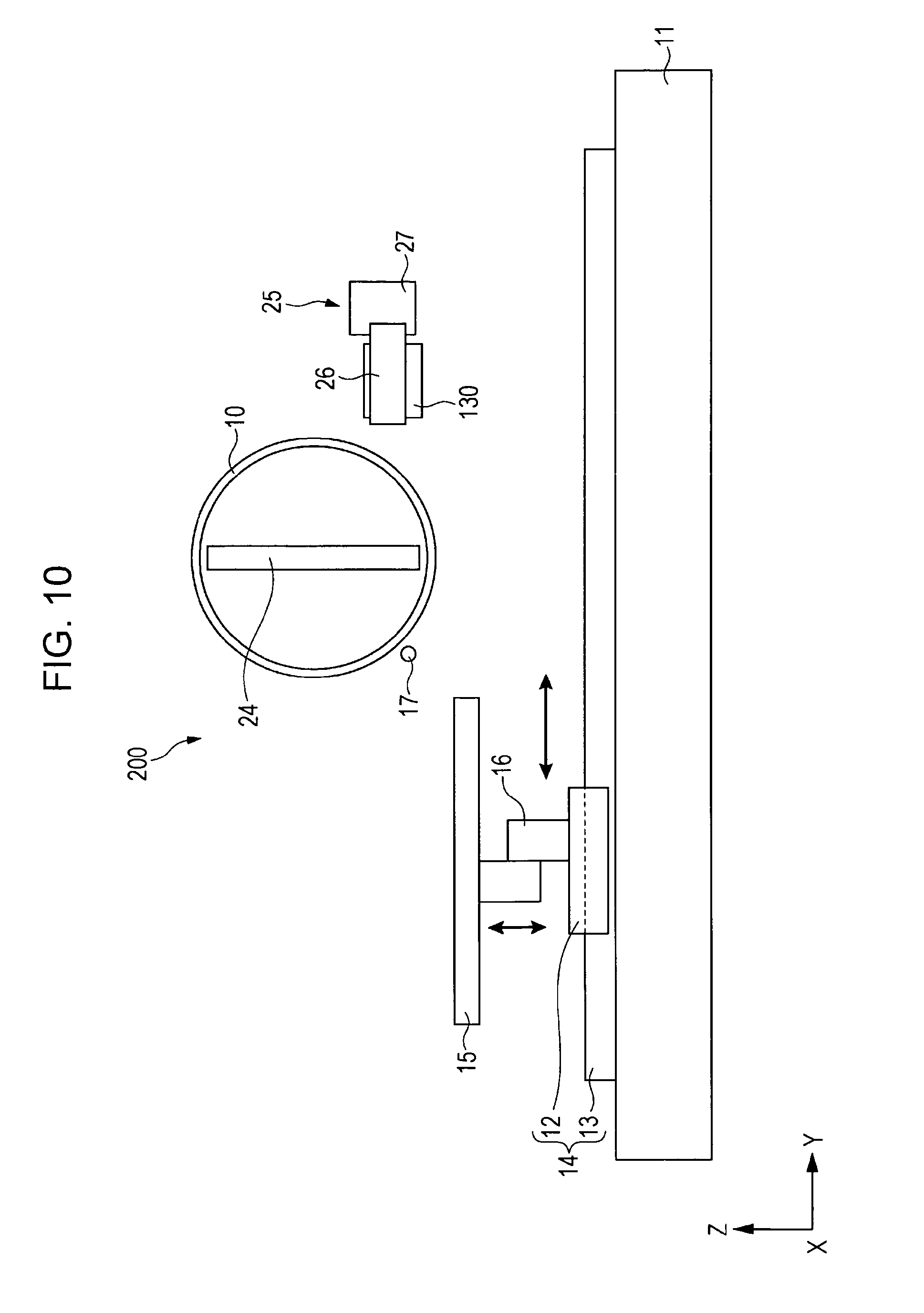 Here, when exposure of the single row along the X-axis direction is ended and the modeling stage 15 is moved in the direction along the Y-axis by the Y-axis movement mechanism 14, the drum 10 is pulled by the frictional force between the drum 10 and the modeling stage 15 side and is thus rotated counterclockwise in Fig. 8.