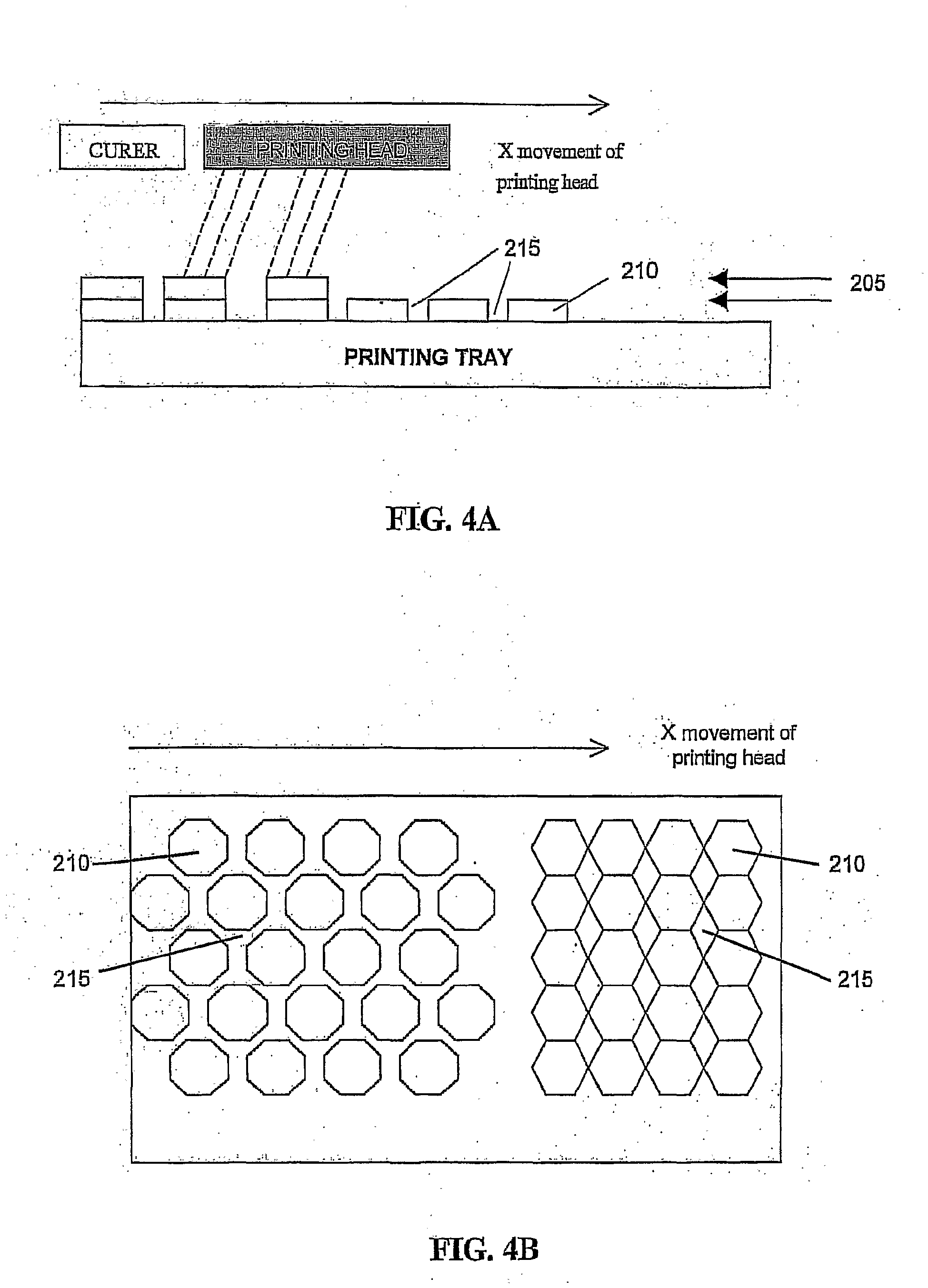 For example, for descriptive purposes only, 3 sets of ink-jet printing heads may jet or dispense 3 type of materials, denoted herein as compositions A, B, and C, respectively, where "A" develops type A properties, "B" develops type B properties and "C" develops type C properties. For example, "A" after curing may develop elastomeric type properties, "B" after curing may develop high strength non-elastomeric type properties and "C" after curing may develop only very weak mechanical strength properties, such as described herein as the "second interface material". Of course, other compositions may also be applied.