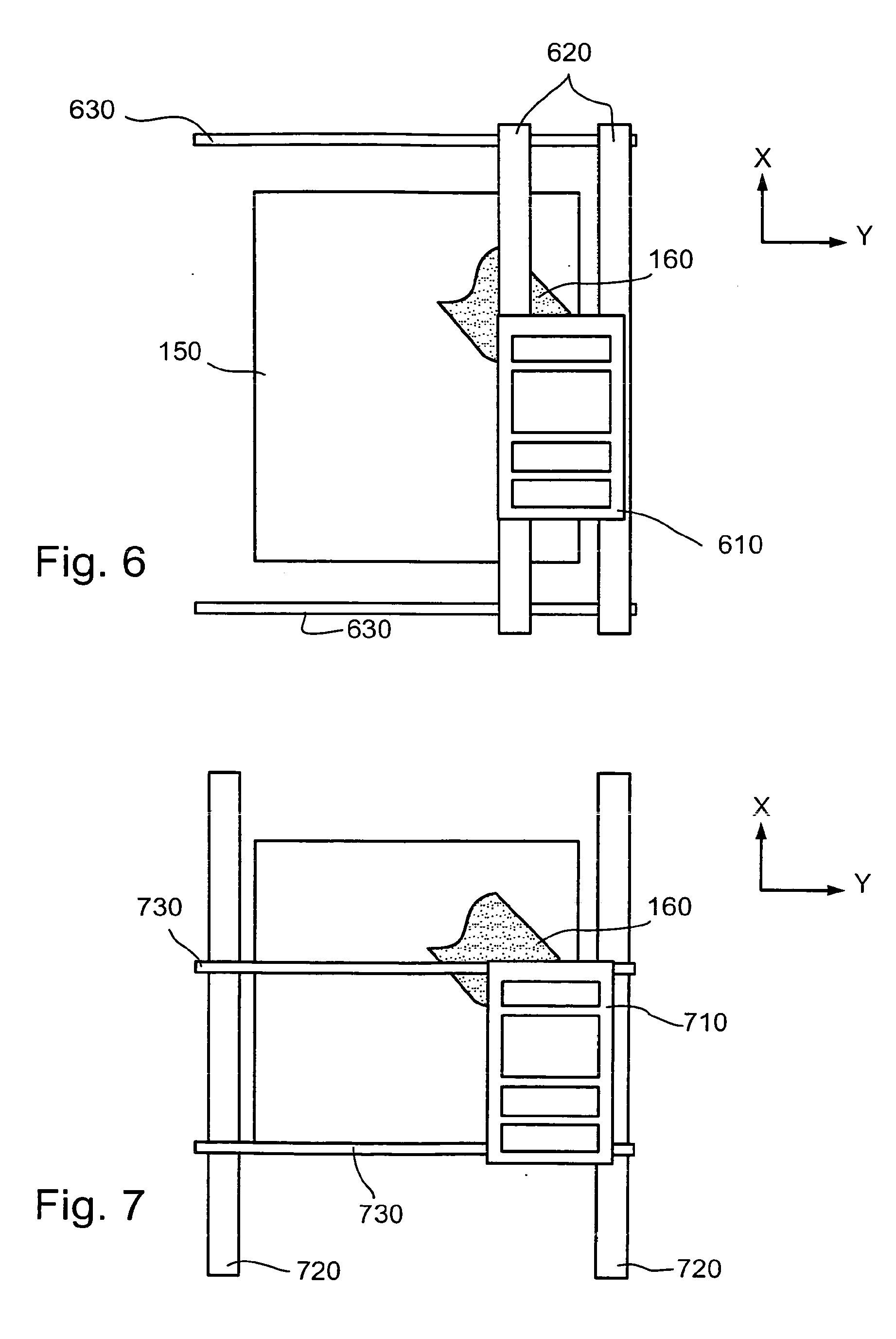 In Fig. 7 printing platform 710 is supported by two Y rails 730 at opposite ends of platform 710. The Y rails 730 are mounted at both ends to carriages which support the Y rails and couple them to two X rails 720 at both ends of Y rails 730, so that the Y rails may be moved along the X rails.