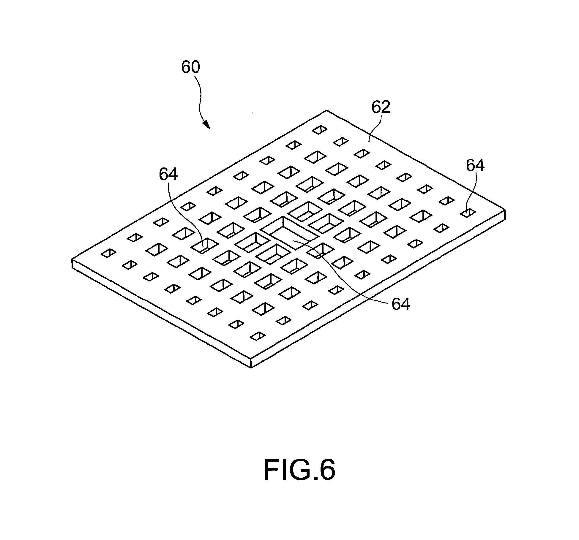 As shown in Figs. 2 and 3, the substrate 52 is, for example, cuboid and has a plurality of voids 54 inside. The substrate 52 is formed such that a void ratio of the voids 54 decreases 3-dimensionally from an inner side of the substrate 52 toward an outer side thereof. Further, the voids 54 are aligned regularly. The void ratio is generally a ratio of a space in a material of the substrate 52 per unit volume.