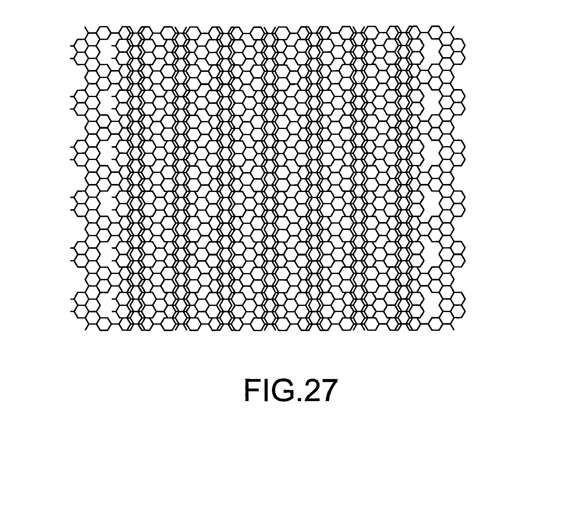 Figs. 25 to 27 exemplify substrates formed by attaching the sheet-like substrates not in the rotational direction as shown in Fig. 24 but linearly. In the examples shown in Figs. 25 to 27, overlapping portions of the sheet-like substrates change cyclically with a directionality. Such a structure may be unfavorable in terms of the intensity, for example. Moreover, in the case of a large substrate, it is difficult to attach all the sheet-like substrates with the same positional relationship due to a local expansion and contraction.