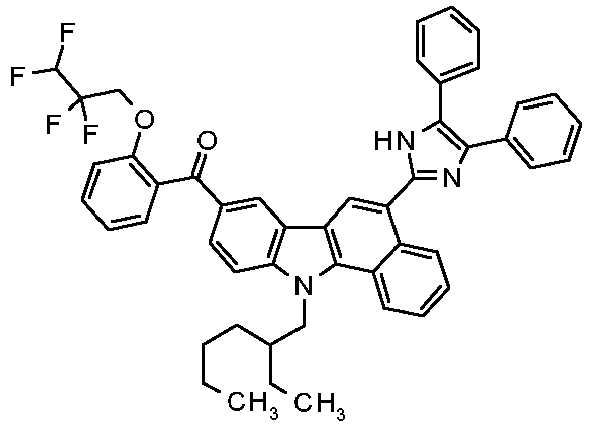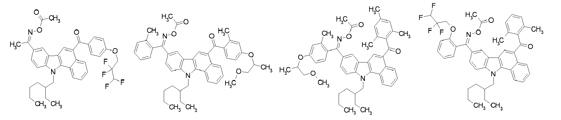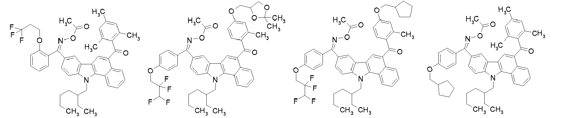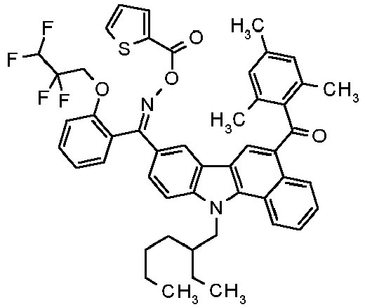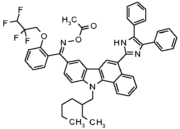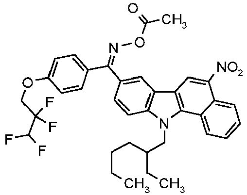To [11-(2-ethyl-hexyl)-5-nitro-11H-benzo[a]carbazole-8-yl]-[4-(2,2,3,3-tetrafluoroprop-oxy)-phenyl]-methanone oxime (160 mg, 0.26 mmol) in DMA (4 ml) are added triethylamine (265 mg, 2.66 mmol) and acetyl chloride (208 mg, 2.57 mmol) at 0°C. After stirring for overnight, the reaction mixture is poured into ice-water. The crude is extracted with AcOEt, and washed with water and brine. After drying over MgSO4 and concentration, the crude is purified by column chromatography on silica gel eluting with a mixed solvent of n-hexane and CH2Cl2 (1:3) to obtain a yellow resin (67 mg, 38%). It is composed of an isomeric mixture, and the structure is confirmed by 1H-NMR spectrum (CDCl3). δ [ppm]: 0.83 (t), 0.87-0.96 (m), 1.20-1.47 (m), 2.12 (s), 2.12 (s), 2.16 (s), 2.21-2.26 (m), 4.40 (t), 4.49 (t), 4.74-4.80 (t), 5.93-6.26 (m), 709 (d), 7.42-7.45 (m), 7.58-7.64 (m), 7.68-7.81 (m), 8.01 (dd), 8.11 (d), 8.15 (d), 8.64-8.70 (m), 8.90-8.94 (m), 8.98 (s), 9.01 (s).