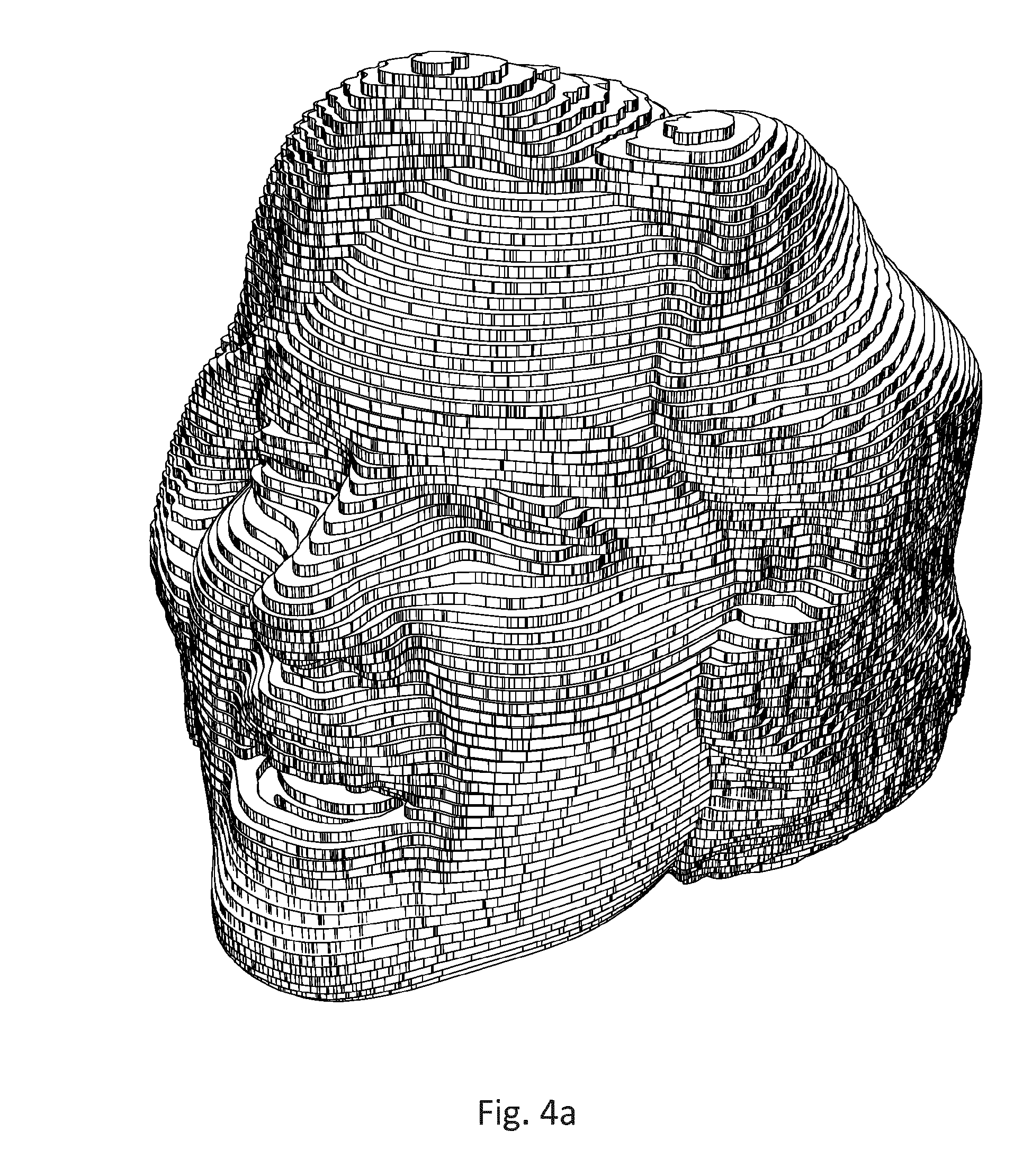This triangulated mesh representation is employed to generate a further digital representation of the head, shown in Figure 2 as a series of digital layer objects built up one upon the other and shaped and dimensioned to recreate the contours of the head. Each layer object has a vertical peripheral edge to assist the later cutting process, and this is in contrast with the sloping contours of the surface map of Figure 1. Fine adjustment may be achieved by displaying the digital representation on an interactive display, and by manually or otherwise feeding in and observing adjustments, until the desired result is achieved visually.