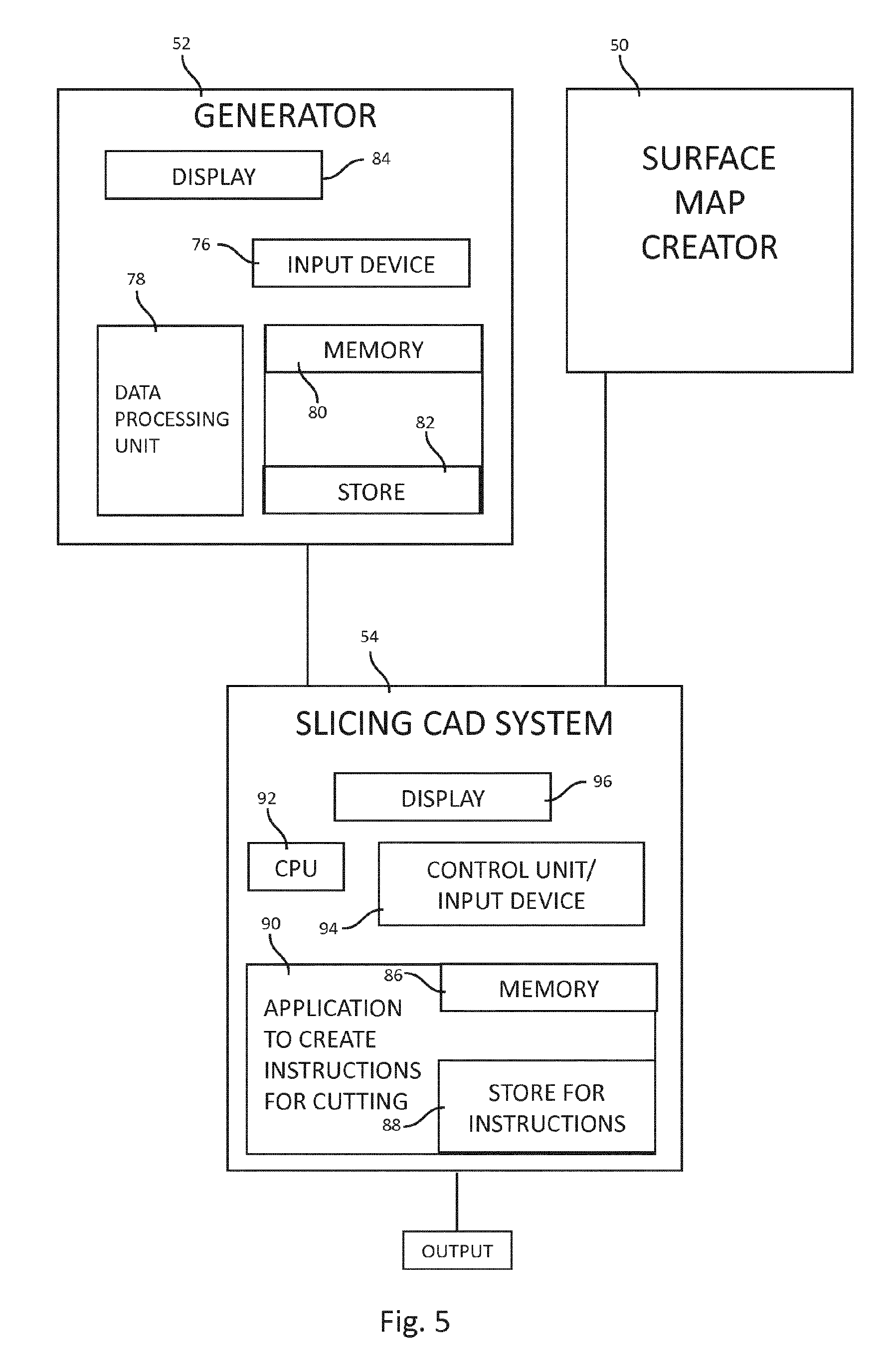 The slicing CAD unit 54 accordingly comprises a memory 86 including a store 88 for data from the surface map creator 50 and the generator 52, as well as an application 90 for creating a set of output instructions for controlling a cutting machine or apparatus for generating the slices for a physical model. In addition, the slicing CAD unit 54 has a CPU 92 for performing steps under the direction of the application 90, a control unit 94 and a display 96. The control unit 94 serves as an operator interface for activating the surface map creator 50 and the generator 52 to load data from these devices into the store 88. The CAD unit 54 thus receives the digital triangulated mesh representation from the surface map creator 50 and the input variables from the generator 52, and then combines such information to show on the display 96 a representation of the ultimate physical 3D model.