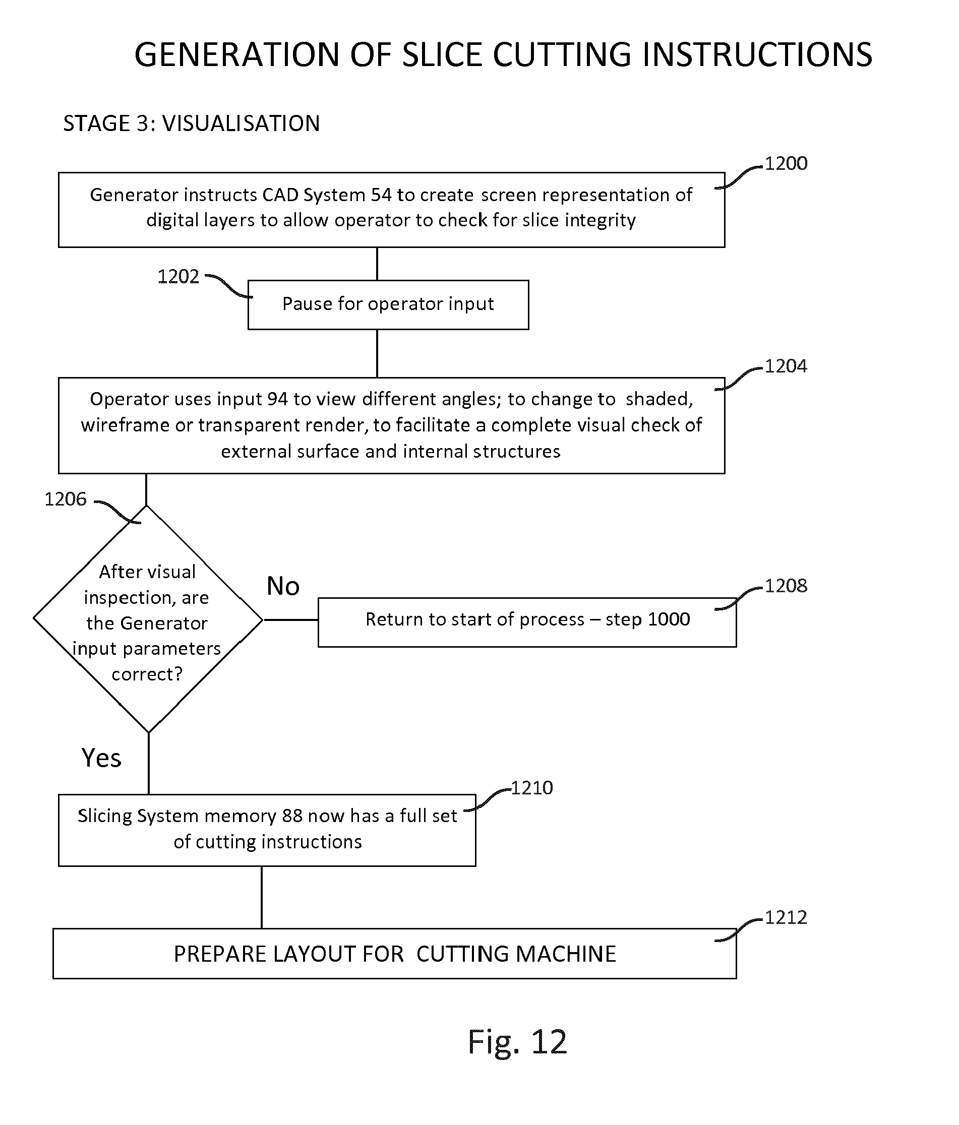 The production of the final instructions to be output by the slicing CAD unit 54 commences with step 1200, in which the control unit 94 instructs the slicing CAD unit 54, by means of the CPU 92 acting under the control of the application 90, to produce a representation of the digital layer objects on the display 96. In step 1202, a pause occurs for operator input. The operator or control engineer makes a visual check for layer integrity, and may input instructions either by way of the input device 76 in the generator 52 or by way of the control unit 94 in the slicing design unit 54. Such instructions may serve to control the representation of the CAD model shown on the display 96, to rotate the model for viewing it at different angles, or to render sections of the representation in shading or as a wire frame or as a transparent form, in order to effect a complete check of the integrity of the external shape and the internal support structures of the eventual physical 3D model. This takes place in step 1204. The process proceeds to step 1206 and prompts the CPU 92 to enquire whether the parameters stored in the store 88 are correct. If the answer is no, the process proceeds to step 1208 and adjustments are effected by returning to step 1000 and inputting updated values. On the other hand, if the answer to step 1206 is yes, the CPU 92 collects the full set of parameters for all the digital layer objects and the associated position data and converts these parameters to cutting instructions in step 1210 and stores them in the store 88. The process now proceeds to step 1212 to prepare a cutting layout for the cutting machine.