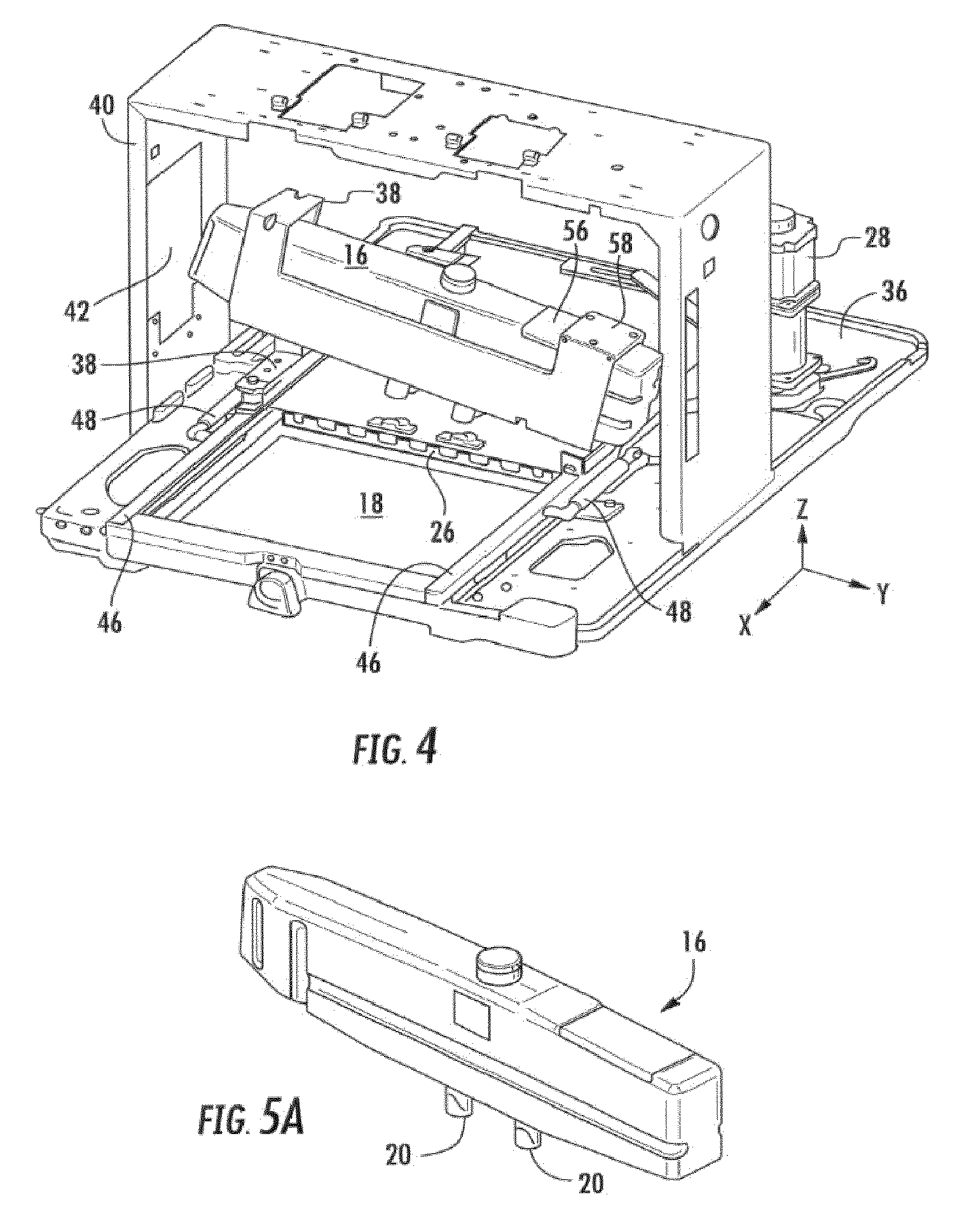 - FIG. 5E is an enlarged perspective view of the cartridge of FIGS. 5A-5D shown in its position within the solid imaging apparatus relative to the shuttle and the portion of the frame that the shuttle moves along, wherein the valve opening devices are not in contact with the selectively openable valves;