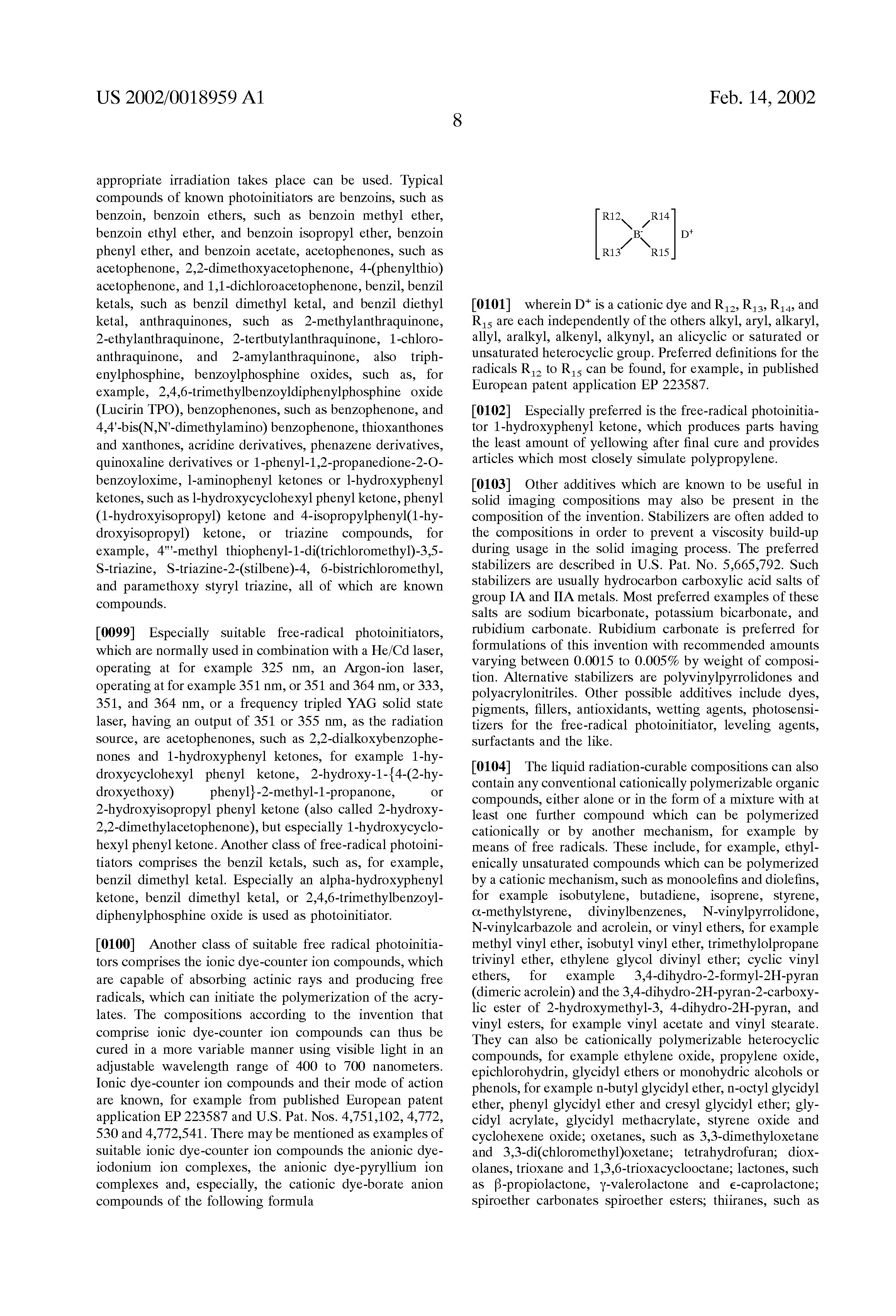 Other additives which are known to be useful in solid imaging compositions may also be present in the composition of the invention. Stabilizers are often added to the compositions in order to prevent a viscosity build-up during usage in the solid imaging process. The preferred stabilizers are described in U.S. Pat. No. 5,665,792. Such stabilizers are usually hydrocarbon carboxylic acid salts of group IA and IIA metals. Most preferred examples of these salts are sodium bicarbonate, potassium bicarbonate, and rubidium carbonate. Rubidium carbonate is preferred for formulations of this invention with recommended amounts varying between 0.0015 to 0.005% by weight of composition. Alternative stabilizers are polyvinylpyrrolidones and polyacrylonitriles. Other possible additives include dyes, pigments, fillers, antioxidants, wetting agents, photosensitizers for the free-radical photoinitiator, leveling agents, surfactants and the like.