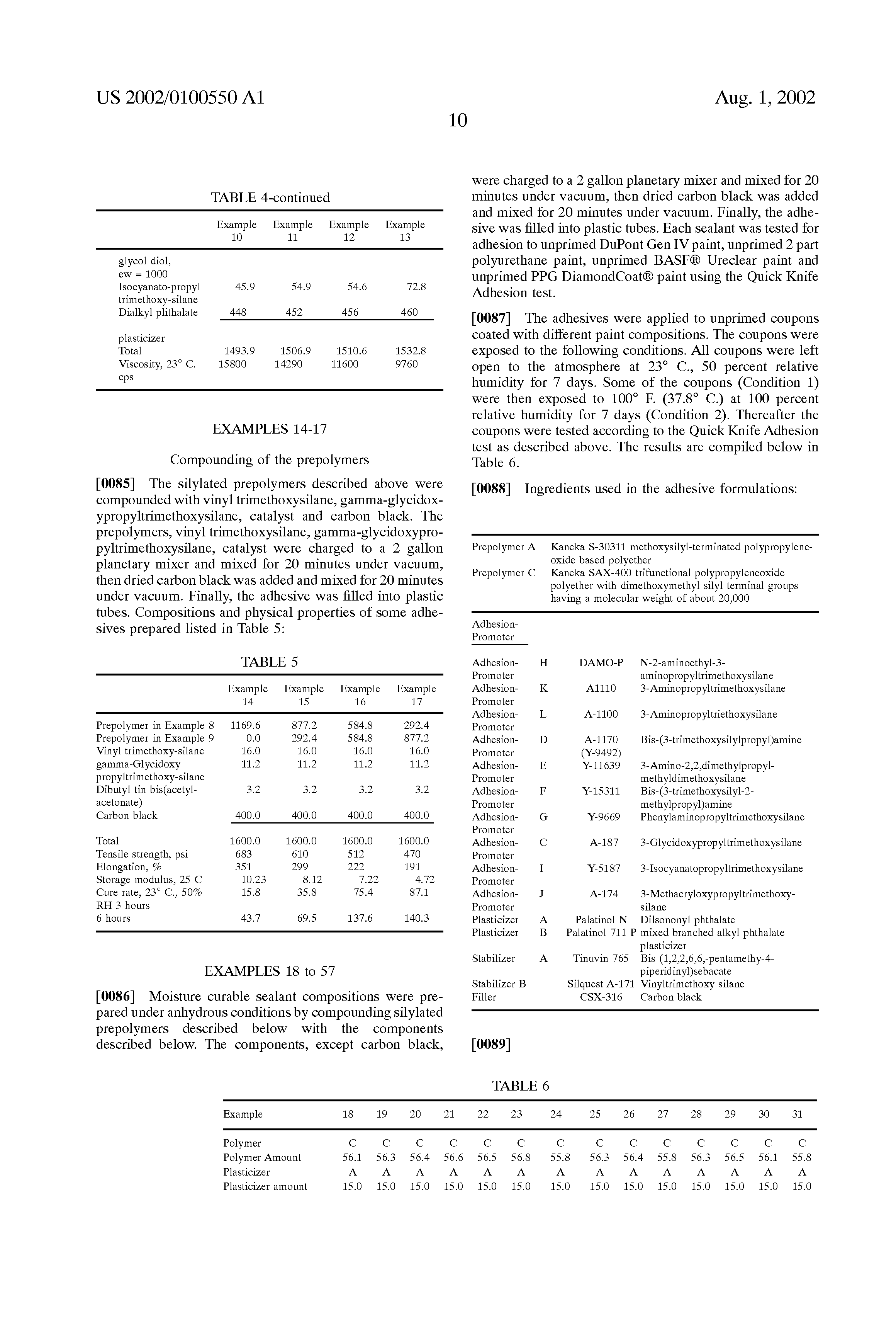 Even more preferably the polymer is a polyether having silane moieties capable of silanol condensation. In one embodiment, the polymer useful in the invention is a polymer as disclosed in Yukimoto et al., U.S. Pat. No. 4,906707; Iwakiri et al., U.S. Pat. No. 5,342,914; Yukimoto U.S. Pat. No. 5,063,270; Yukimoto et al. U.S. Pat. No. 5,011,900; Suzuki et al. U.S. Pat. No. 5,650,467, all incorporated herein by reference. More preferably such polymers are oxyalkylene polymers containing at least one reactive silicon group per molecule. The oxyalkylene polymer which can be used in the present invention includes polymers having a molecular chain represented by formula (1):