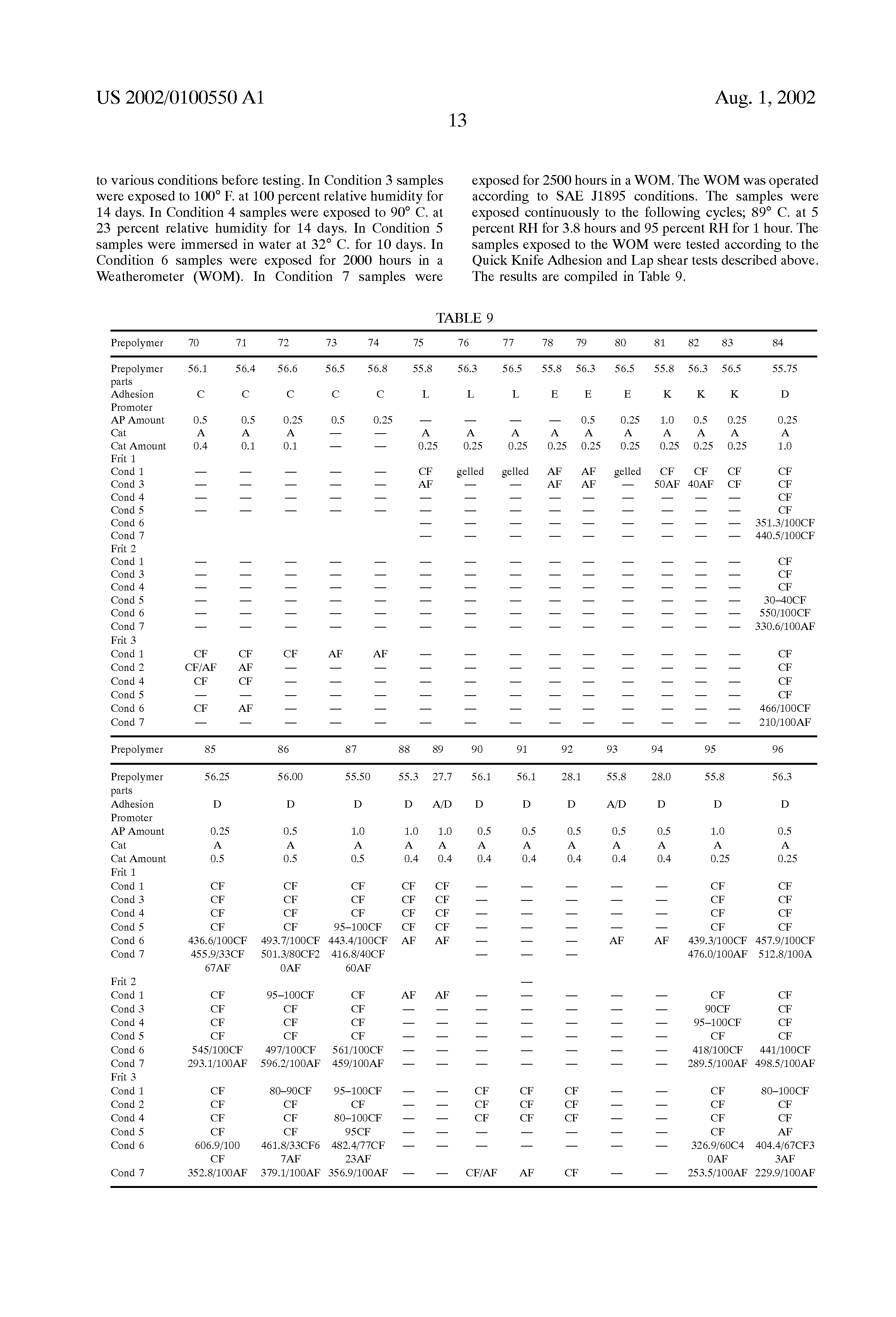 In addition to the adhesion promoters described above other adhesion promoters for adhesion to coated surfaces are the amino alkoxy silanes, vinyl alkoxy silanes, isocyanto alkoxy silanes and isocyanurate functional alkoxy silanes. More preferred of the additional adhesion promoters include gamma-glycidoxypropyltrimethoxy silane, gamma-isocyanatopropyltrimethoxy silane, n-phenyl-gama-aminopropyltrimethoxysilane, gamma-isocyanatopropylmethyldimethoxy silane, gamma-isocyanatopropyltriethoxy silane, beta (3,4-epoxycyclohexyl)ethyltriethoxysilane, gamma-glycidoxypropylmethyl-dirnethoxy silane, tris(gamma-trimethoxysilylpropyl)iso-cyanurate, vinyltriethoxysilane, or vinyltrimethoxysilane. Such additional adhesion promoters are present in sufficient amount to promote the adhesion of the adhesive to the glass or other substrate surface to the desired level usually determined by testing the lap shear strength and failure mode of the bond to the substrate. Preferably the amount of adhesion promoter is about 10 parts by weight or less based on the weight of the adhesive; more preferably 5 parts by weight or less and most preferably about 2 parts by weight or less. Preferably the amount of adhesion promoter is about 0.01 part by weight or greater based on the weight of the adhesive; more preferably 0.1 part by weight or greater and most preferably about 0.5 part by weight or greater.