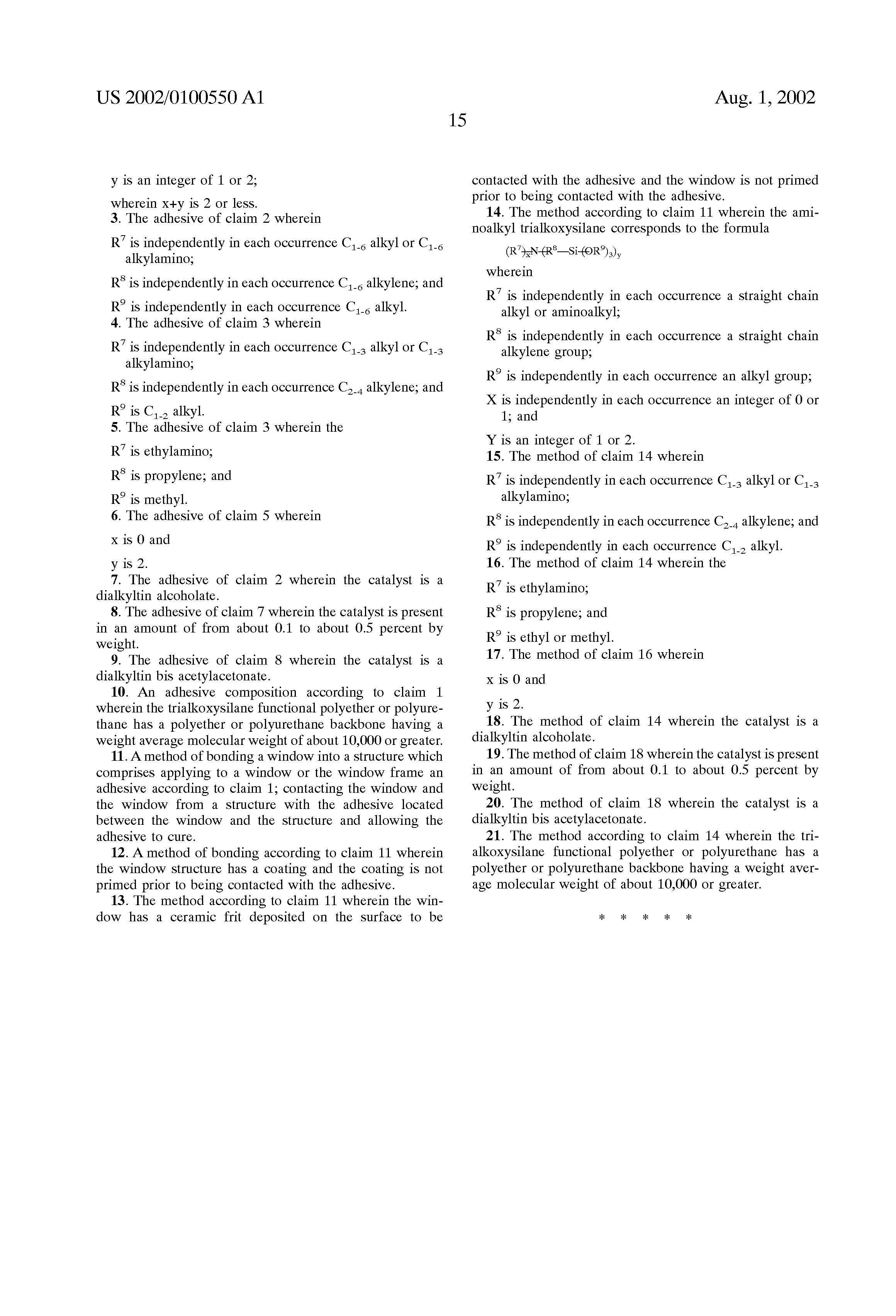 Preferably R7 is C1-6 alkyl or C1-6 alkyl amino; more preferably C1-3 alkyl or C1-3 alkylamino and most preferably ethyl amino. The amine moiety of the alkylamine group of R7 is preferably located on the carbon atom furthest from the primary or secondary amine group. R8 is preferably C1-6, alkylene, more preferably C2-4 alkylene and most preferably C3 alkylene (propylene). R9 is preferably C1-6 alkyl, most preferably, C1-2 alkyl (methyl or ethyl) and most preferably C1 alkyl (methyl). x is preferably 0 and y is preferably 2. Among useful adhesion promoters are gamma-aminopropyltrimethoxy silane, n-beta-(aminoethyl)-gamma-aminopropyltrimethoxy silane, n-(2-aminoethyl)-3-aminopropylmethyldimethoxy silane, 3-aminopropyl-methyldimethoxy silane, bis-(gamma-trimethoxysilyl-propyla)mine, Among more preferred adhesion promoters are N-2-aminoethyl-3-aminopropyl trimethoxysilane (available from Hills America Inc. under the tradename DAMO-P), 3-aminopropyltrimethoxysilane (available from Witco Corporation under the designation A-1110), 3-aminopropyltriethoxysilane (available from Witco Corporation under the designation A-1100) and bis-(3-trimethoxysilylpropyl)amine (available from Witco Corporation under the designation A-1170. The most preferred adhesion promoter is bis-(3-trimethoxysilylpropyl)amine. The amount of the adhesion promoter is chosen to be an effective amount to achieve good short term and long term adhesion. The particular effective amount needed is dependent on the choice of catalyst, amount of catalyst and basicity of the primary or secondary amine in the adhesion promoter. Adhesion promoters with a higher basicity are generally used in lower concentrations than those with a lower basicity. If too much or little adhesion promoter is used poor adhesion to the substrate may result. At higher concentrations of the catalyst, lower amounts of adhesion promoter are preferably used. If too much total adhesion promoter and catalyst are used the adhesion to the substrate is poor. Preferably, the adhesion promoter is used in an amount of about 0.1 percent by weight of the adhesive or greater and more preferably 0.5 percent by weight or greater. Preferably the adhesion promoter is used in an amount of 1.2 percent by weight or less based on the adhesive weight and more preferably 1.0 percent by weight or less.