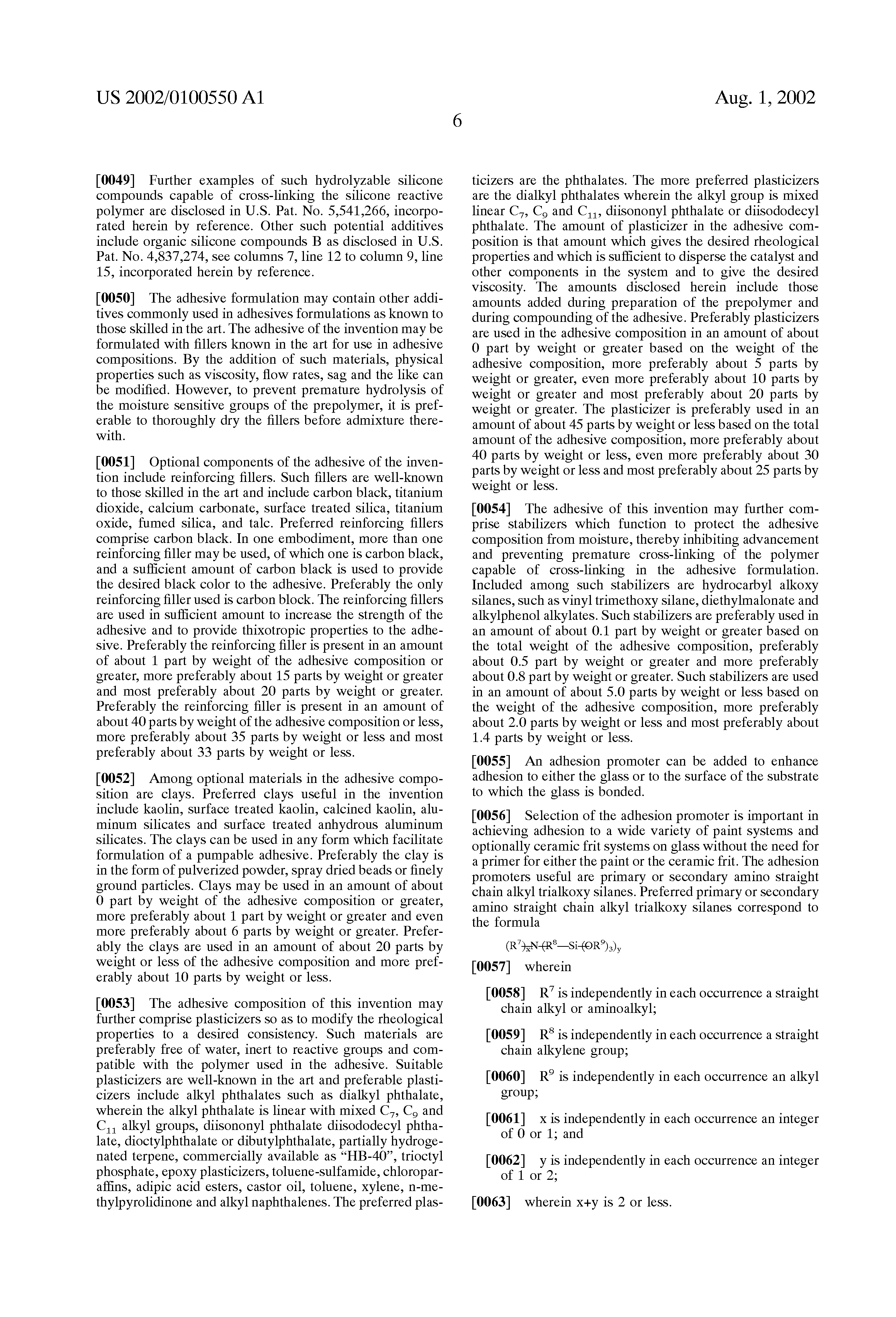 The sealant composition of the invention is used to bond porous and nonporous substrates together. The sealant composition is applied to the glass surface or the other substrate surface and is thereafter contacted with a secondsurface of glass or substrate. Thereafter the adhesive is exposed to curing conditions. In a preferred embodiment the other substrate is a plastic, metal, fiberglass or composite substrate which may optionally be painted. This method is especially effective for substrates painted with an acid resistant paint. In preferred embodiments, the surfaces to which the adhesive is applied are cleaned prior to application, see for example U.S. Pat. Nos. 4,525,511; 3,707,521 and 3,779,794, incorporated herein by reference. The glass is prepared by cleaning the surface to which the adhesive composition is to be applied. A solvent wipe can be used to do this. Generally a cloth or other device with an appropriate solvent is used to clean the surface. Thereafter a primer may be applied to the portion of the window to which the adhesive is to be applied. Glass primers and application methods for such primers are well-known in the art. Typically the primer is applied with a brush or by a robot. A primer is not necessary where the adhesive is formulated so as to eliminate the need for one. In a preferred embodiment of the invention, the substrate is a building or an automobile. The adhesive is preferably deposited as a bead on the portion of the glass to be bonded into the substrate. The bead can be deposited by any known method to those skilled in the art. In one embodiment, the bead can be deposited using a caulking gun or similar type of manual application device. In another embodiment, the bead may be deposited by an extrusion apparatus such as a robotic extrusion apparatus. The adhesive is located on the portion of the window which will be contacted with the structure into which it will be bonded. In one preferred embodiment, the adhesive is placed about the periphery of one face of the window. Typically the adhesive is in the form of a bead located about the periphery of the window. Preferably the bead is a profiled shape along the cross-sectional plane. In the embodiment where the glass is window glass designed for use in automobiles, the bead is applied to the portion of the glass to be contacted with the flange of the automobile window. In automobiles the adhesive bead is placed on a ceramic frit coated about the edge of the window. Preferably the frit is based on zinc, bismuth or a mixture thereof. The window can then be placed into the structure with the adhesive contacting both the window and the structure to which the window is to be bonded into. This contacting is performed by means well-known to those skilled in the art. In particular, the glass can be placed in the structure by hand, by the use of a robot and the like. Generally, the sealants of the invention are applied at ambient temperature in the presence of atmospheric moisture. Exposure to atmospheric moisture is sufficient to result in curing of the sealant. Curing may be further accelerated by applying heat to the curing sealant by means of convection heat or microwave heating. Preferably the sealant of the invention is formulated to provide a working time of about 6 minutes or greater, more preferably about 10 minutes or greater. Preferably the working time is about 15 minutes or less and more preferably about 12 minutes or less. Further, the adhesive of the invention demonstrates a cure rate after six hours of about 50 psi (3.45 mPa) or greater, more preferably about 70 psi (4.83 mPa) or greater after six hours and more preferably about 100 psi (6.90 mPa) or greater after six hours.