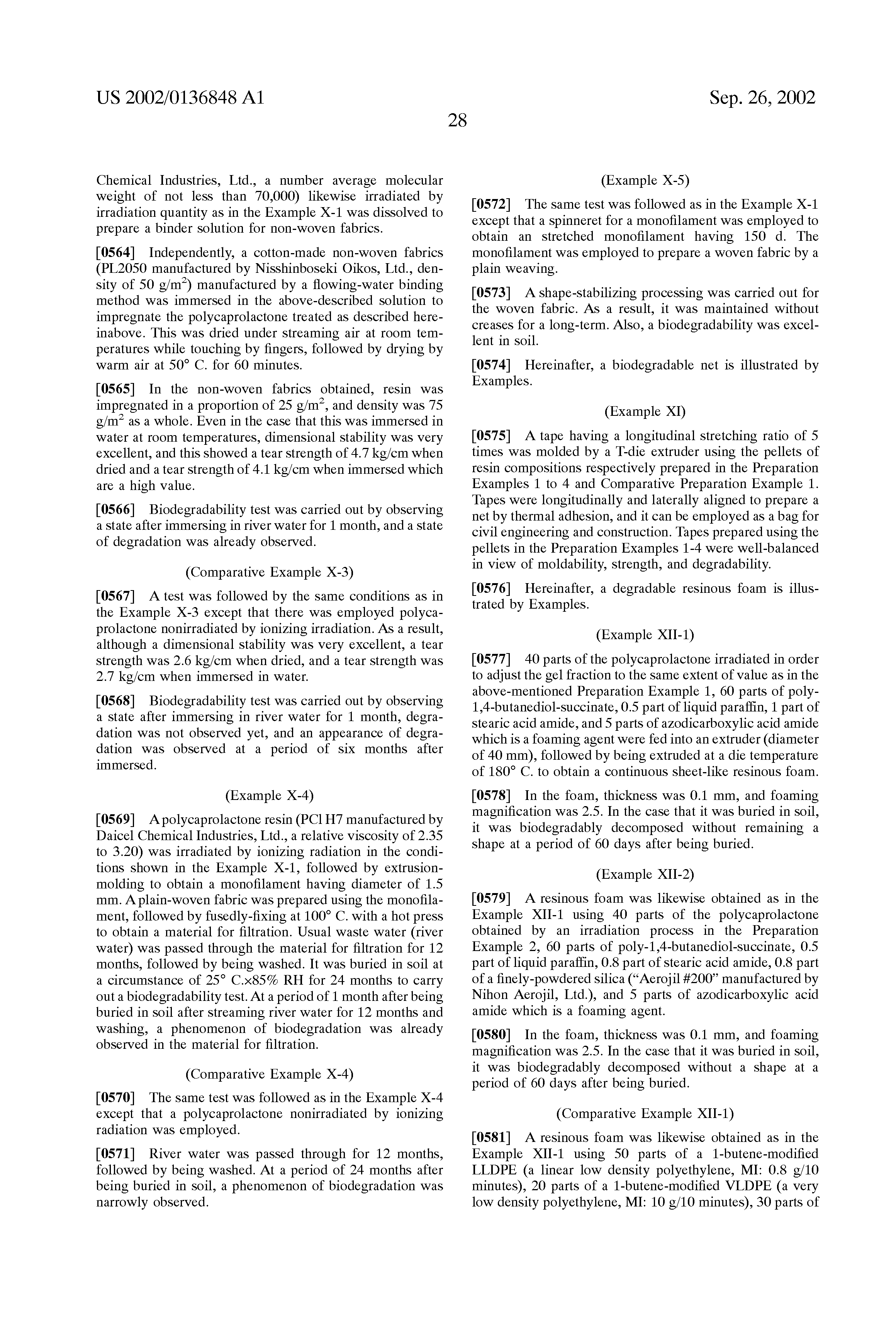 It is to be noted that in the case that a biodegradable cellulose acetate having a substituted degree of not more than 2.1 is employed together as fibers constructing the non-woven fabrics, since a function of biodegradability is further improved, it is effective. Although the reason is not distinct, it is thought that the addition of the cellulose acetate having the low substitution degree has an action of accelerating a biodegradable function of the other fibers. It depends upon a consideration that when the substitution degree nears 3 in a cellulose acetate, it becomes chemically stable, and solvent resistance and chemical stability lower in the vicinity of the substitution degree of 2, and a cellulose acetate having the substitution degree of not more than 2.1 is excellent in biodegradability.