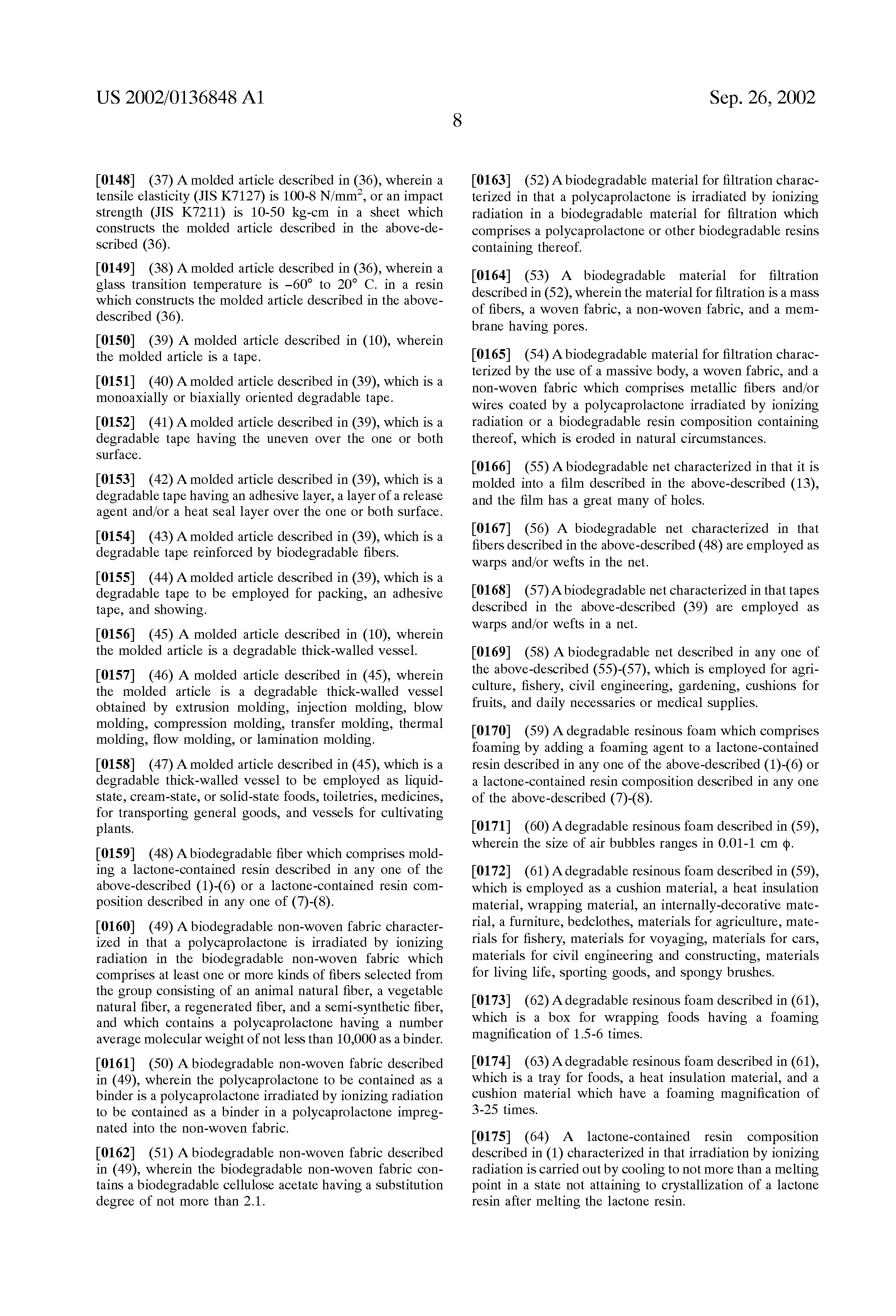 Irradiation to the polycaprolactone by ionizing radiation corresponds to the irradiation illustrated in detail in the illustration for the above-mentioned fibers and non-woven fabrics, and an irradiation stage is not particularly limited. In the case of fibers, there is most effective a method irradiated at a stage of a starting composition because of capability of most uniformly irradiating, and in the case of coating on metallic fibers, irradiation after coating is easy in operations which is a preferred method.