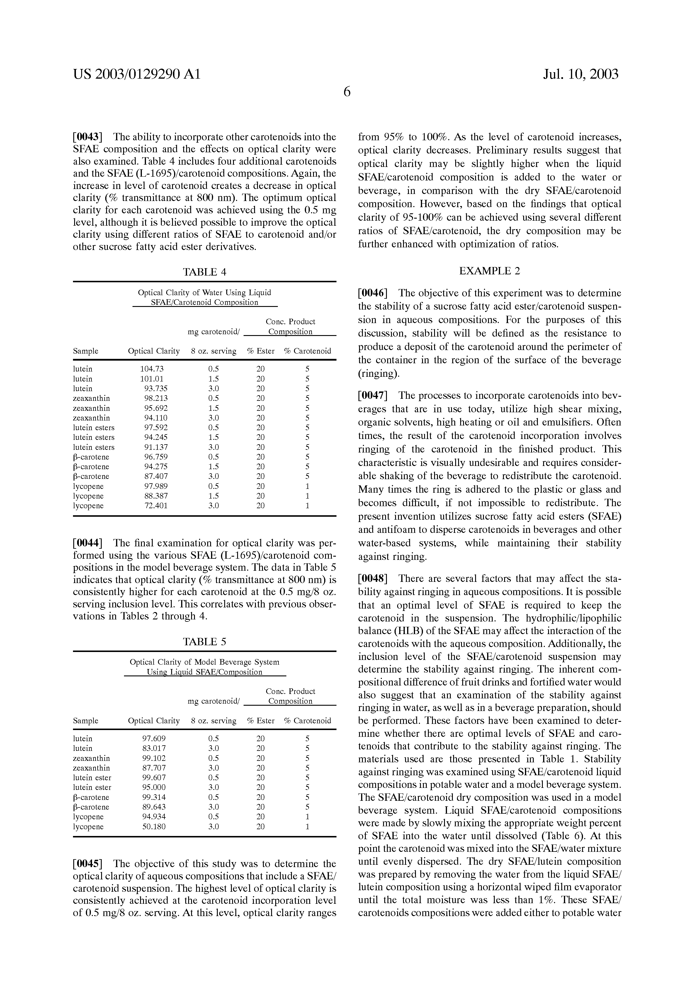 There are several factors that may affect the stability against ringing in aqueous compositions. These include the level of SFAE that is required to keep the carotenoid in the suspension; the hydrophilic/lipophilic balance (HLB) of the SFAE, which may affect the interaction of the carotenoids with the aqueous composition; and the inclusion level of the SFAE/carotenoid suspension, which may determine the stability against ringing. The inherent compositional difference of fruit drinks and fortified water may suggest that they will have differences in stability against ringing. These factors have been examined to determine whether there are preferred levels of SFAE and carotenoids that contribute to the stability against ringing.