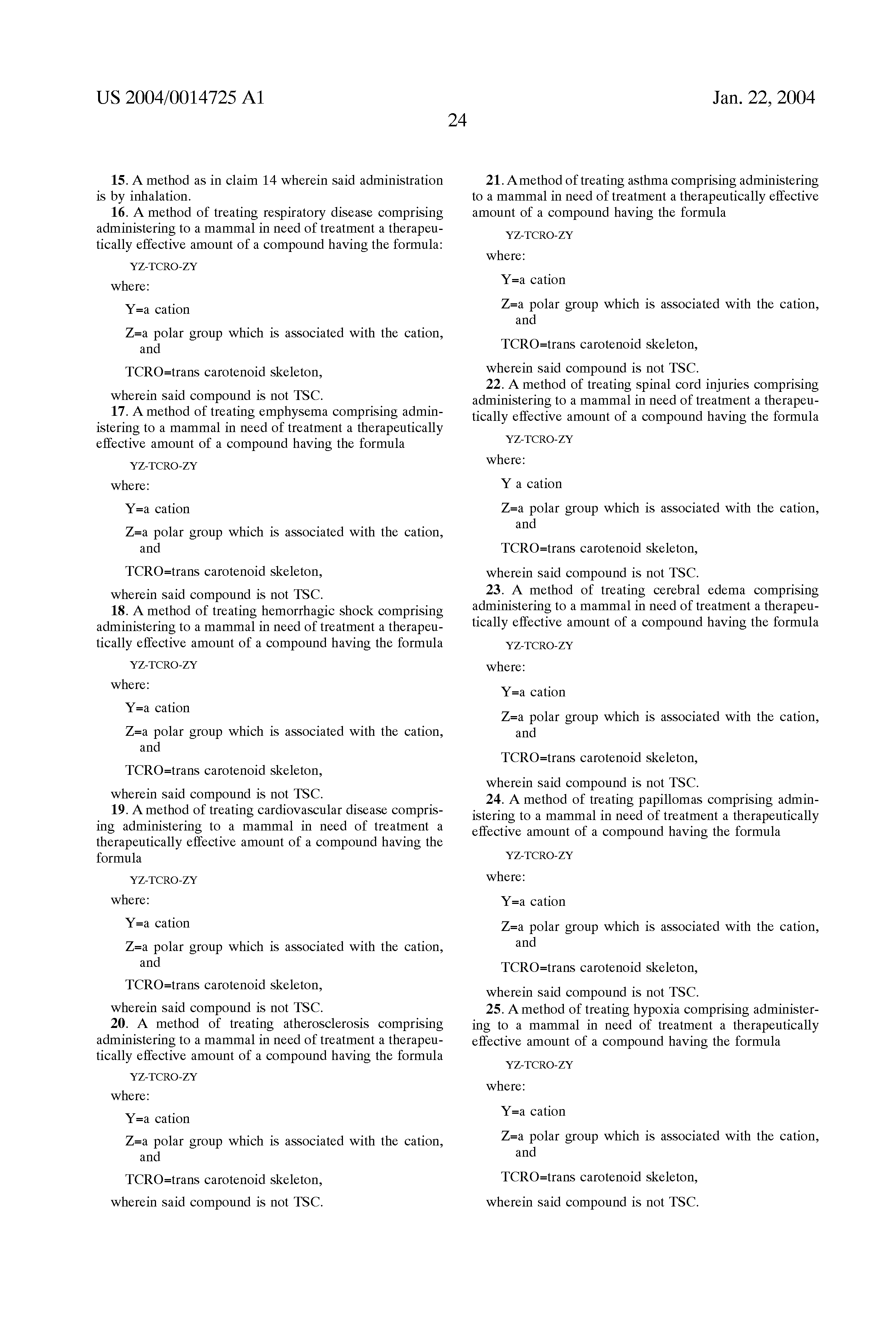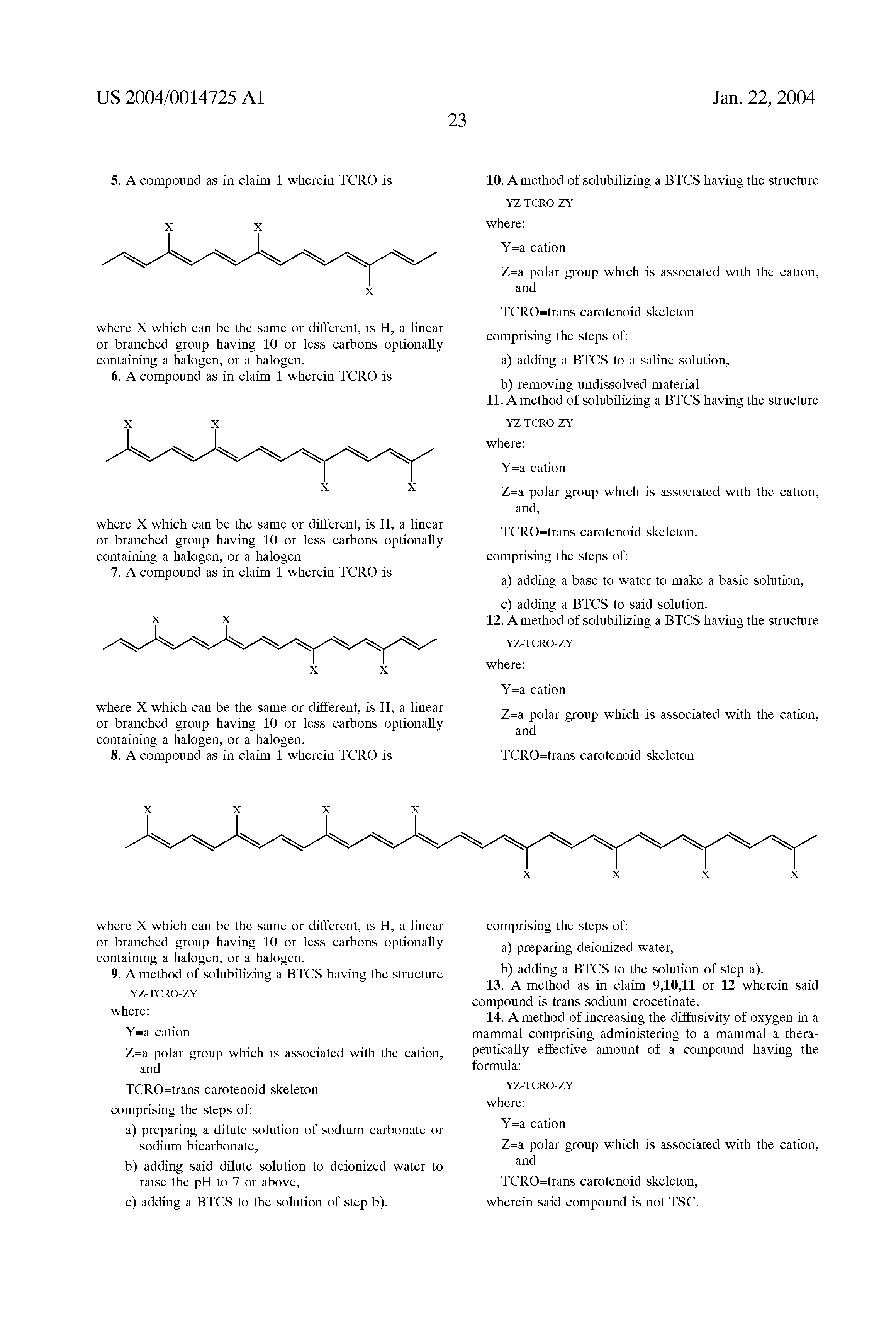 TCRO=trans carotenoid or carotenoid related skeleton (advantageously less than 100 carbons) which is linear, has pendant groups (defined below), and typically comprises “conjugated” or alternating carbon-carbon double and single bonds (in one embodiment, the TCRO is not fully conjugated as in a lycopene). The pendant groups are typically methyl groups but can be other groups as discussed below. In an advantageous embodiment, the units of the skeleton are joined in such a manner that their arrangement is reversed at the center of the molecule. The 4 single bonds that surround a carbon-carbon double bond all lie in the same plane. If the pendant groups are on the same side of the carbon-carbon double bond, the groups are designated as cis; if they are on the opposite side of the carbon-carbon bond, they are designated as trans. The compounds of the subject invention are trans. The cis isomer typically is a detriment—and results in the diffusivity not being increased. In one embodiment, a trans isomer can be utilized where the skeleton remains linear.