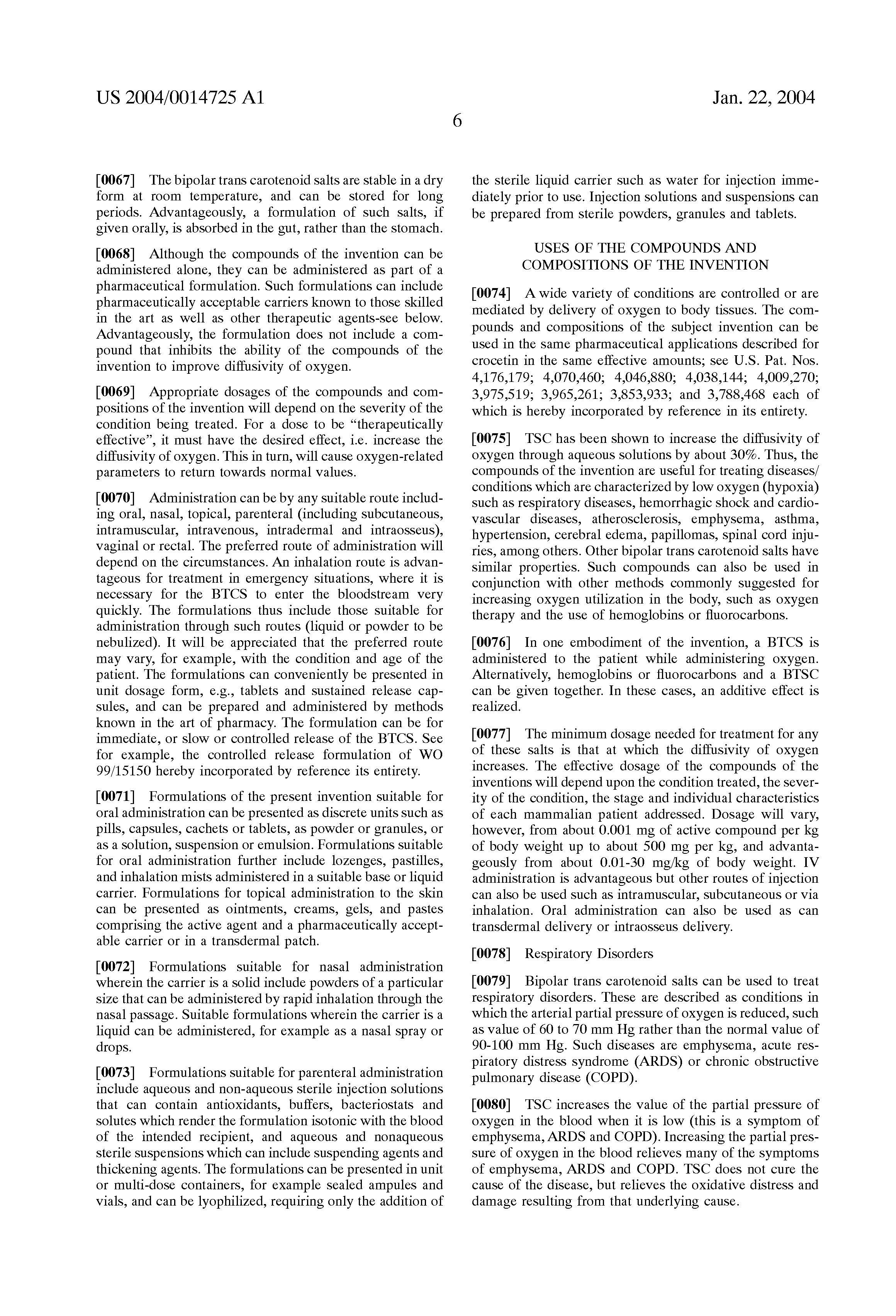 In Roy et al, Shock 10, 213-7. (1998), hemorrhaged rats (55% blood volume) were given a bolus of trans sodium crocetinate (TSC) after 10 minutes, followed by saline after another 30 minutes. All of the TSC-treated animals lived, while all controls died. Whole-body oxygen consumption increased in the TSC group, reaching 75% of normal resting value after about 15 minutes.