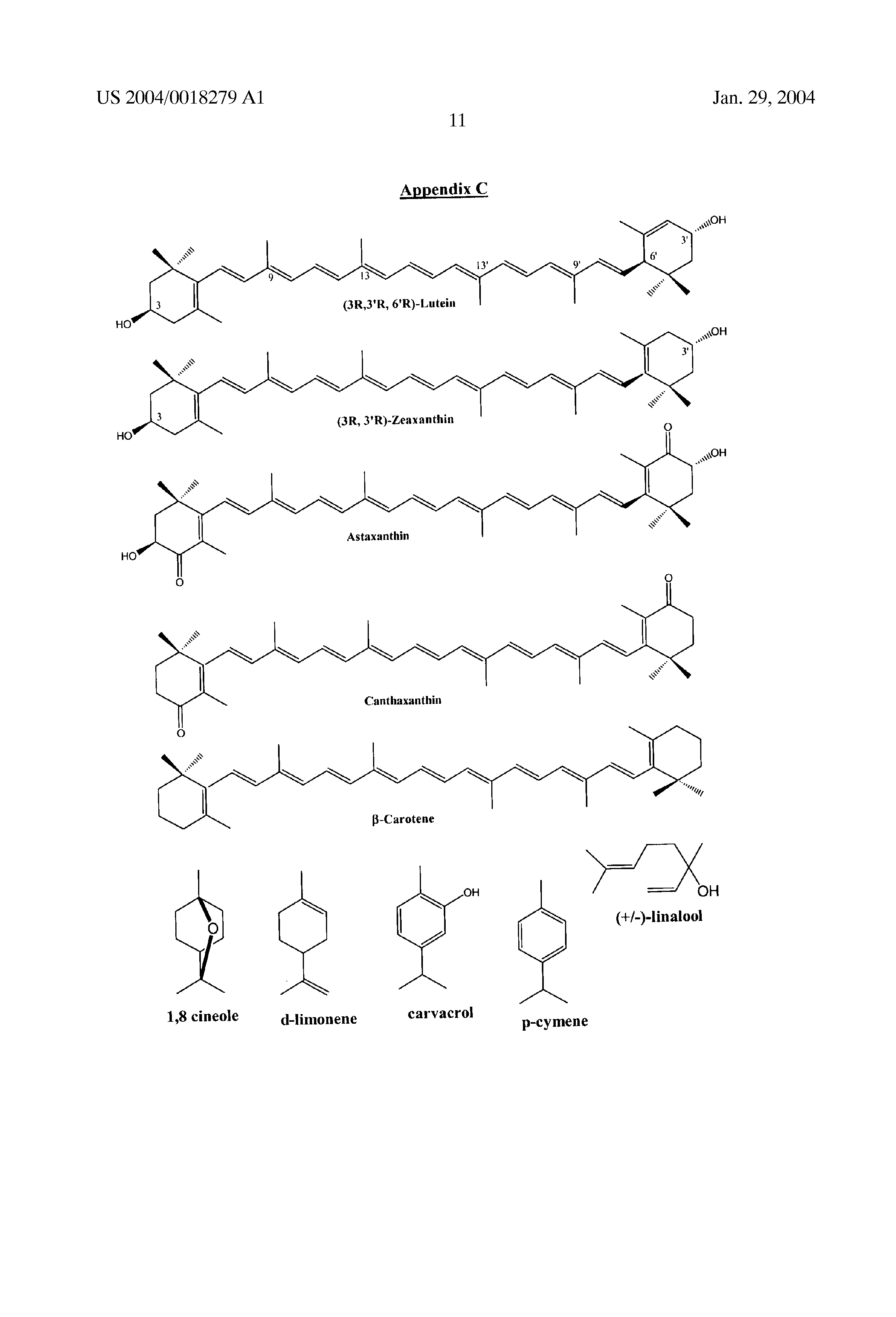 Oils used for this experiment were obtained from The Lebermuth Company (South Bend, Ind.), Spectrum Botanicals (Blodgett, Oreg.), NOW Foods, (Glendale Heights, Ill.), and Tri-K Industries (Northvale, N.J.). Other solvents and pure monoterpenes were purchased from Fisher and Aldrich. Lutein Dry Cake was obtained from Kemin Foods, L.C., (Des Moines, Iowa). Beta-carotene crystals (purity 99.8%; C9750) were purchased from Sigma. Zeaxanthin crystals (purity 100.1%; Product Code 04 11876 01; Lot# UE00010005) were manufactured by Roche Vitamins. Astaxanthin (purity 98%; Product Code: 011054-0, Lot# 01-011054-811) and canthaxanthin (purity “˜10%”; Product Code: 03115-1, Lot# 01-03115-215) were both purchased from Chromadex (Laguna Hills, Calif.). Carvacrol was purchased from Aldrich (Product Code # 282197, Lot # 13403CI) as well as linalool (Prod # L2602, Lot # 02106MI) an p-cymene (Aldrich, Prod # C121452, Lot # 03011BU).