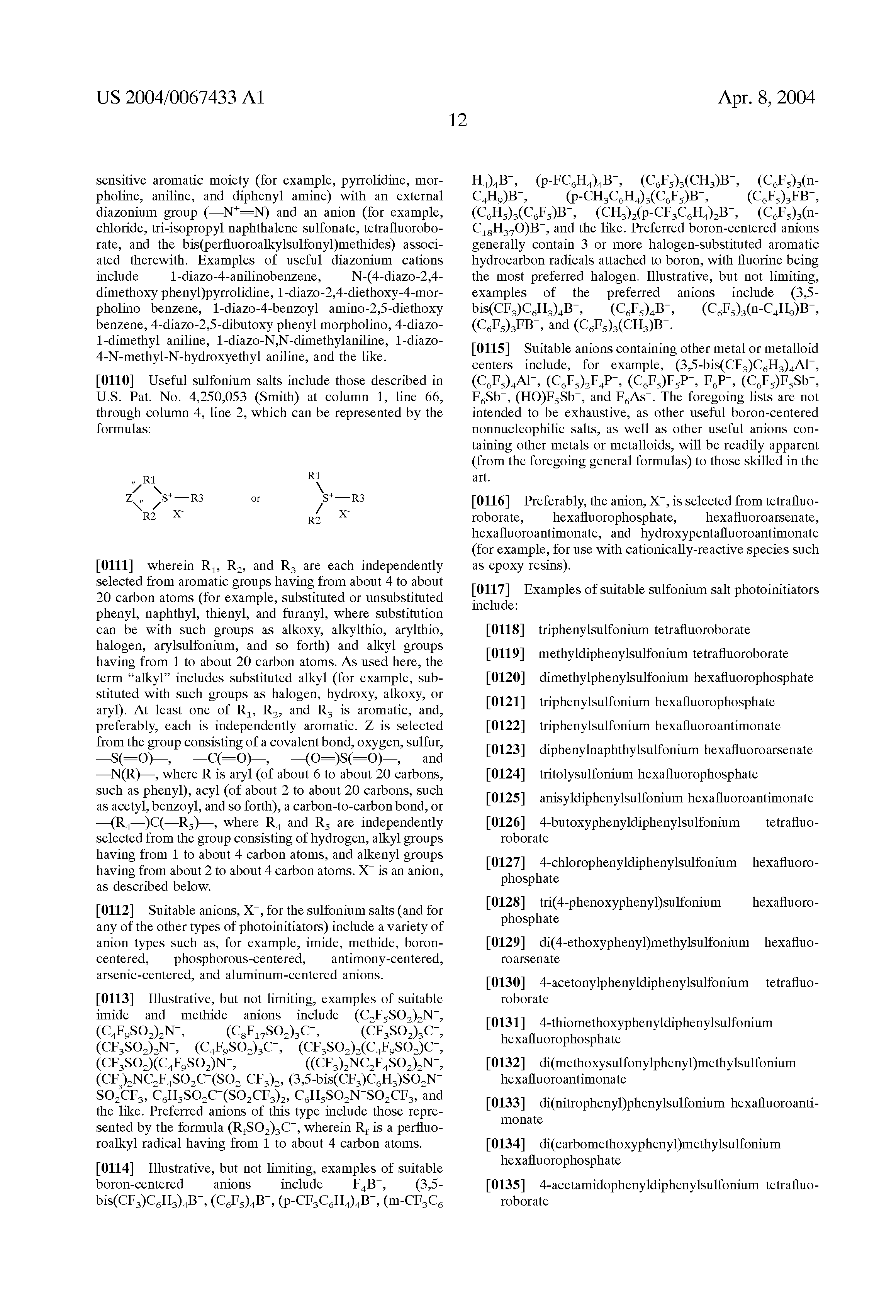 Non-curable species include, for example, reactive polymers whose solubility can be increased upon acid- or radical-induced reaction. Such reactive polymers include, for example, aqueous insoluble polymers bearing ester groups that can be converted by photogenerated acid to aqueous soluble acid groups (for example, poly(4-tert-butoxycarbonyloxystyrene). Non-curable species also include the chemically-amplified photoresists described by R. D. Allen, G. M. Wallraff, W. D. Hinsberg, and L. L. Simpson in “High Performance Acrylic Polymers for Chemically Amplified Photoresist Applications,” J. Vac. Sci. Technol. B, 9, 3357 (1991). The chemically-amplified photoresist concept is now widely used for microchip manufacturing, especially with sub-0.5 micron (or even sub-0.2 micron) features. In such photoresist systems, catalytic species (typically hydrogen ions) can be generated by irradiation, which induces a cascade of chemical reactions. This cascade occurs when hydrogen ions initiate reactions that generate more hydrogen ions or other acidic species, thereby amplifying reaction rate. Examples of typical acid-catalyzed chemically-amplified photoresist systems include deprotection (for example, t-butoxycarbonyloxystyrene resists as described in U.S. Pat. No. 4,491,628, tetrahydropyran (THP) methacrylate-based materials, THP-phenolic materials such as those described in U.S. Pat. No. 3,779,778, t-butyl methacrylate-based materials such as those described by R. D Allen et al. in Proc. SPIE 2438, 474 (1995), and the like); depolymerization (for example, polyphthalaldehyde-based materials); and rearrangement (for example, materials based on the pinacol rearrangements).