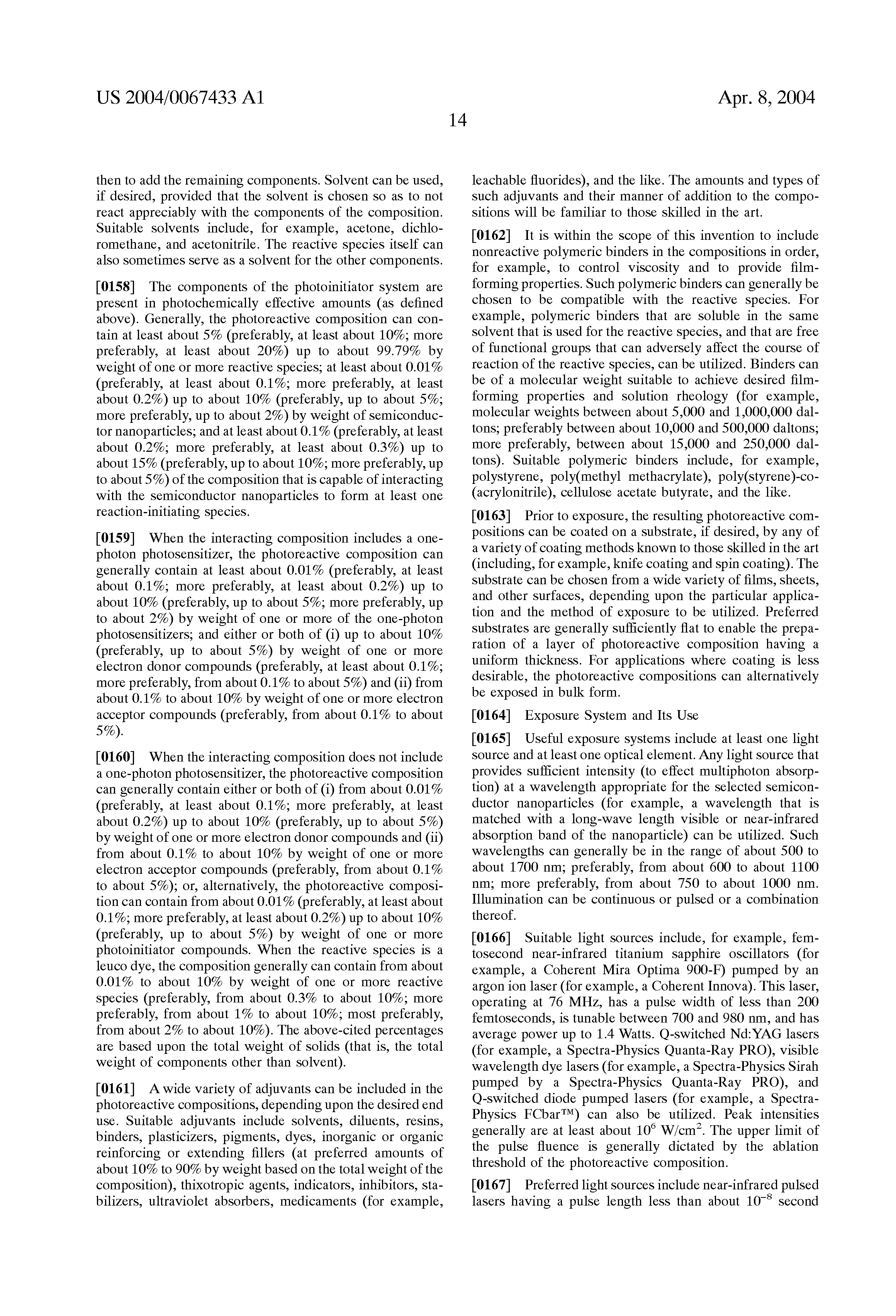 Suitable light sources include, for example, femtosecond near-infrared titanium sapphire oscillators (for example, a Coherent Mira Optima 900-F) pumped by an argon ion laser (for example, a Coherent Innova). This laser, operating at 76 MHz, has a pulse width of less than 200 femtoseconds, is tunable between 700 and 980 nm, and has average power up to 1.4 Watts. Q-switched Nd:YAG lasers (for example, a Spectra-Physics Quanta-Ray PRO), visible wavelength dye lasers (for example, a Spectra-Physics Sirah pumped by a Spectra-Physics Quanta-Ray PRO), and Q-switched diode pumped lasers (for example, a Spectra-Physics FCbar™) can also be utilized. Peak intensities generally are at least about 106 W/cm2. The upper limit of the pulse fluence is generally dictated by the ablation threshold of the photoreactive composition.