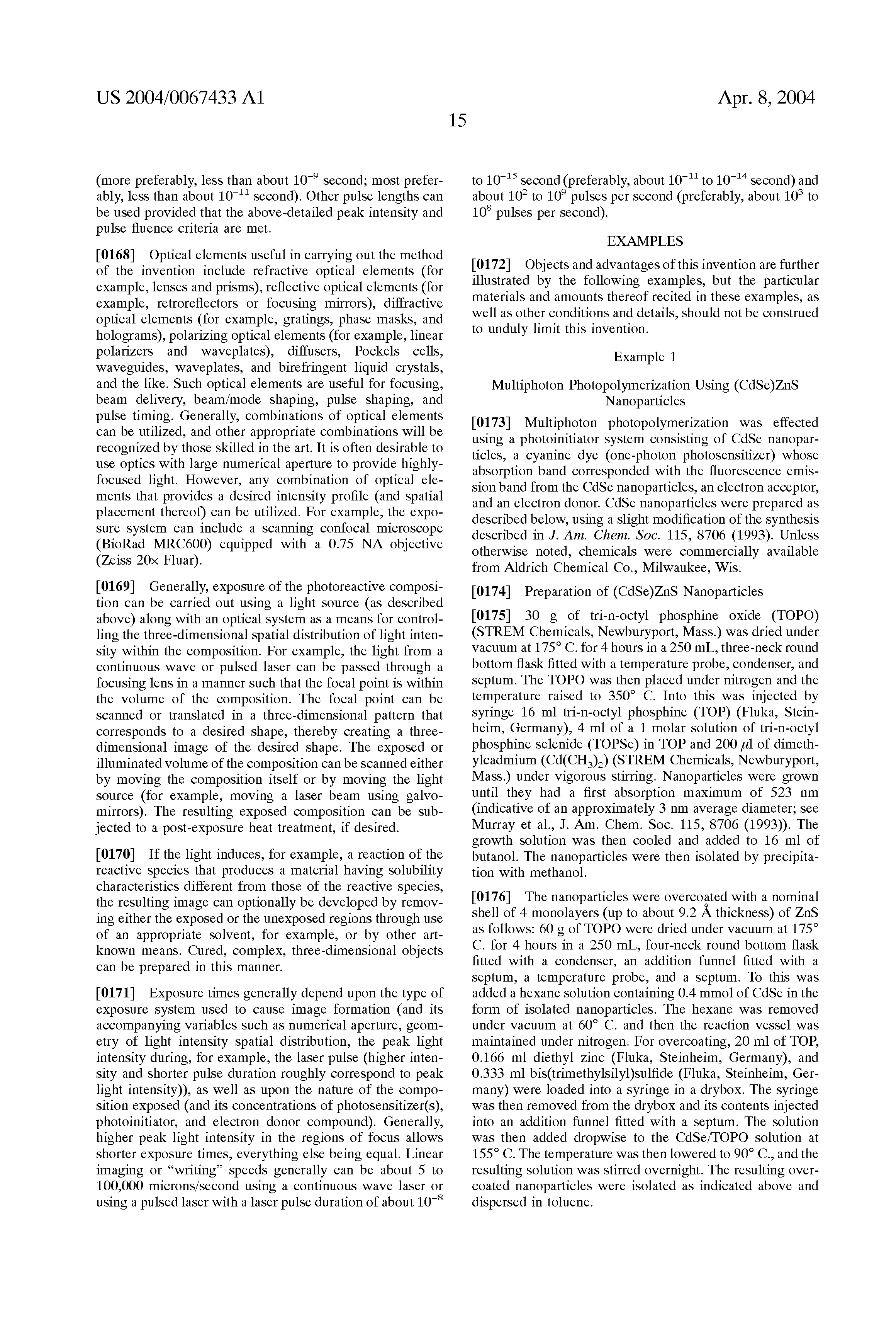 Optical elements useful in carrying out the method of the invention include refractive optical elements (for example, lenses and prisms), reflective optical elements (for example, retroreflectors or focusing mirrors), diffractive optical elements (for example, gratings, phase masks, and holograms), polarizing optical elements (for example, linear polarizers and waveplates), diffusers, Pockels cells, waveguides, waveplates, and birefringent liquid crystals, and the like. Such optical elements are useful for focusing, beam delivery, beam/mode shaping, pulse shaping, and pulse timing. Generally, combinations of optical elements can be utilized, and other appropriate combinations will be recognized by those skilled in the art. It is often desirable to use optics with large numerical aperture to provide highly-focused light. However, any combination of optical elements that provides a desired intensity profile (and spatial placement thereof) can be utilized. For example, the exposure system can include a scanning confocal microscope (BioRad MRC600) equipped with a 0.75 NA objective (Zeiss 20× Fluar).